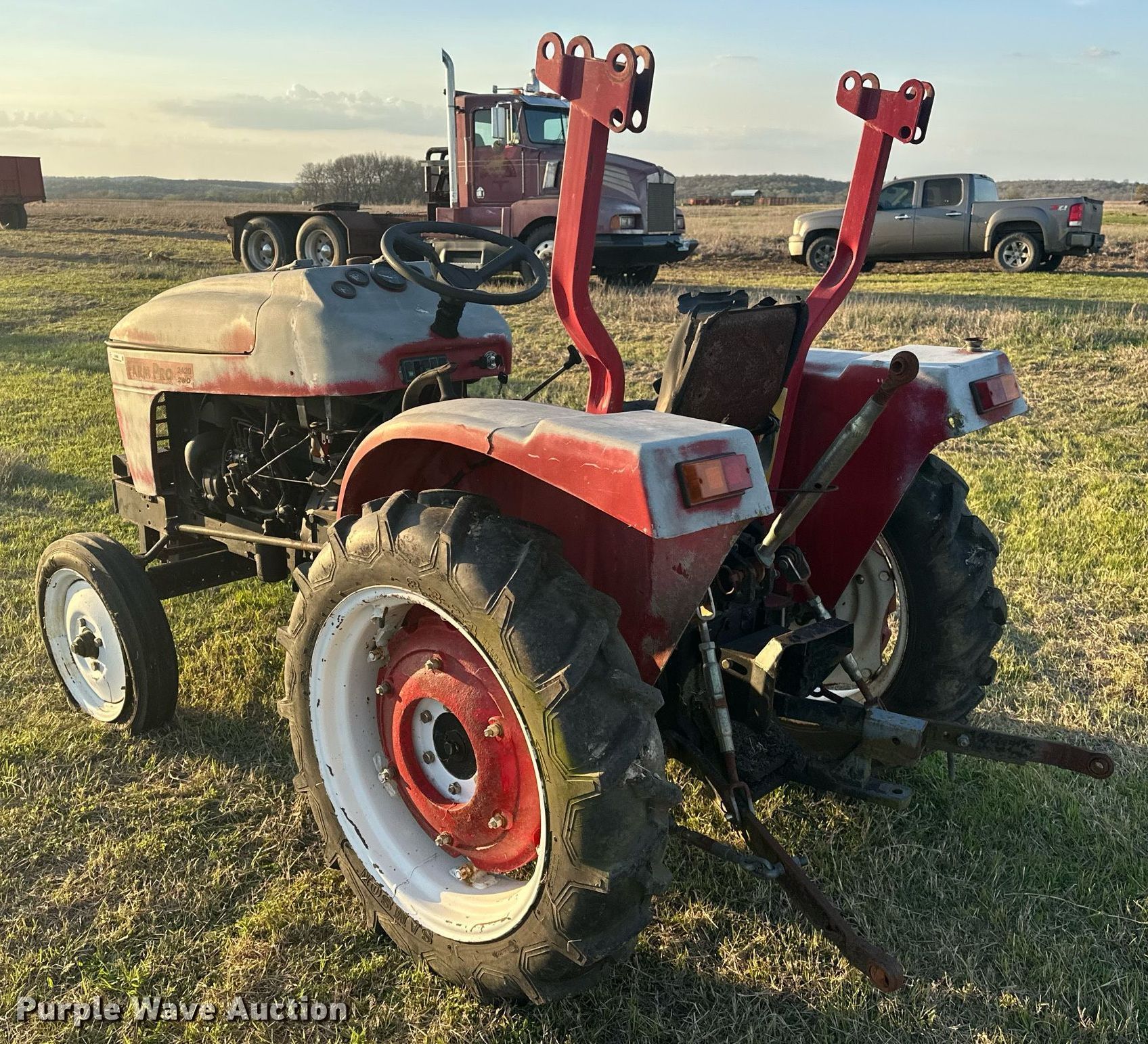 2005 Farm Pro 2420 tractor. Hours: 320 on meter, Serial: 05120200333. Engine Yangdong Y380T, Displacement: 1.14L, Cylinders: 3, Fuel type: Diesel, HP: 20. Transmission Manual, 6F - 2R, Creeper. Features PTO: 540, Three point Top link, Suitcase weights: 4. Tires Front: 4.00-16, Rear: 3.3-24, Wheel weights: 2. Notes Non-operational throttle control. Okemah, OK 74859