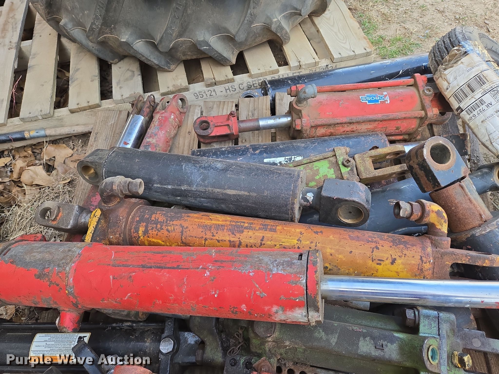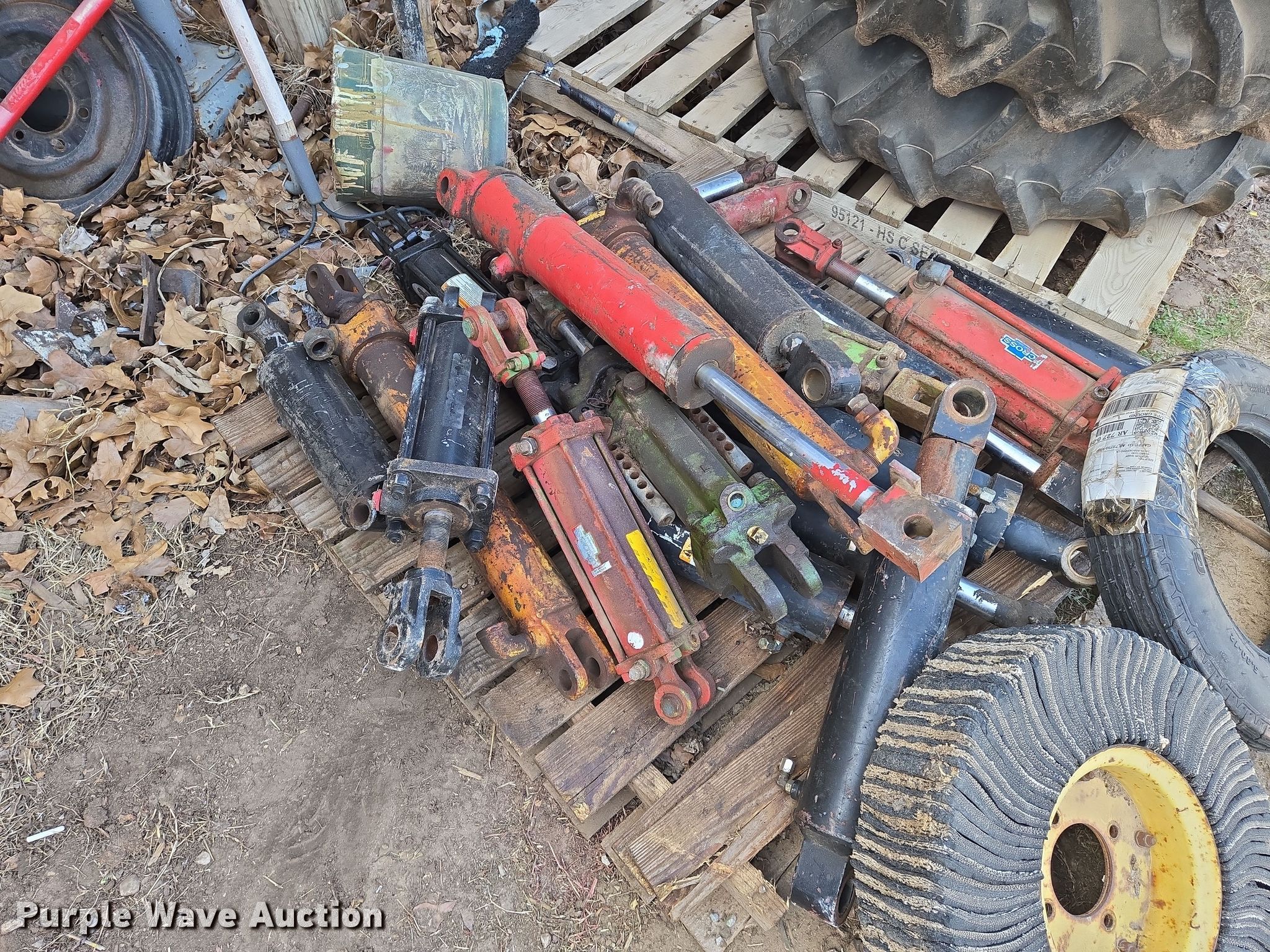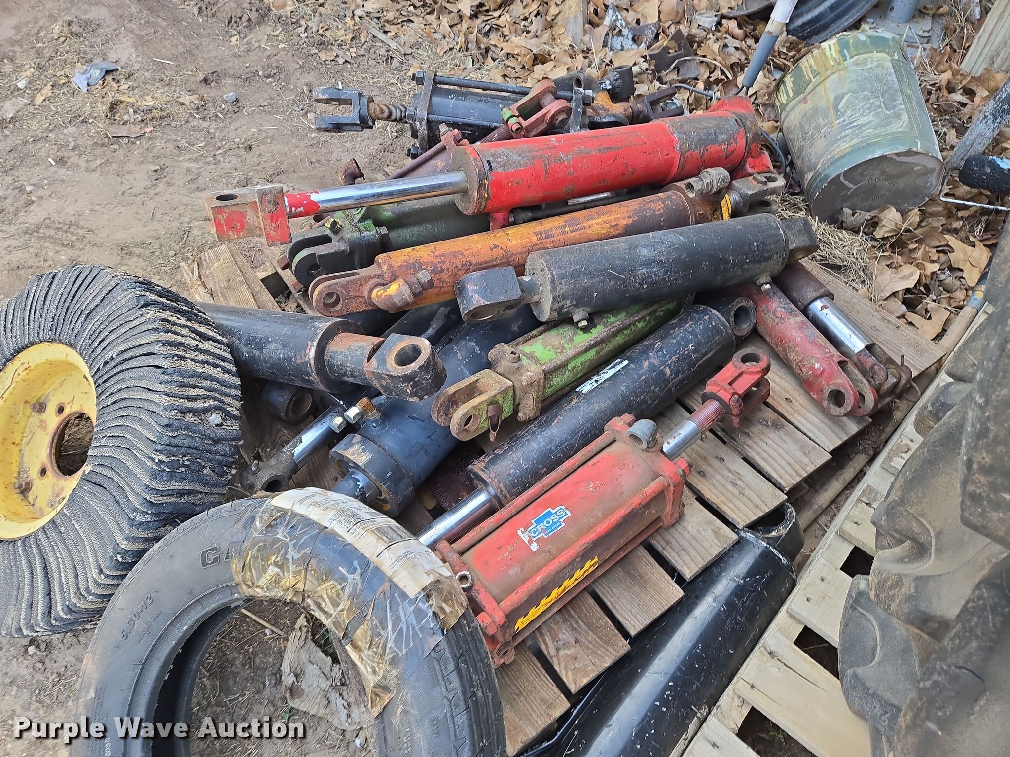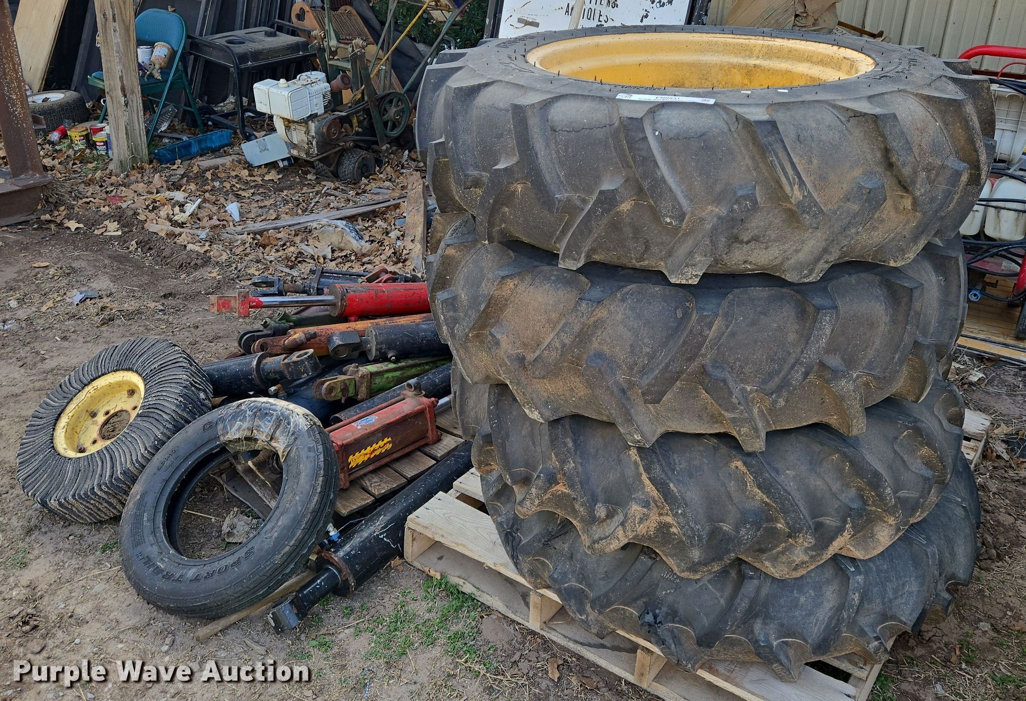Purple Wave is selling a used Industrial Tires or Tracks in Oklahoma. This item is a Tires and wheels with the following: (4) John Deere tires and wheels, Size: 11.2-24, 20" mower tire and wheel, Solid, Carlise 5.30-12 tire, Approx. 18 hydraulic cylinders
