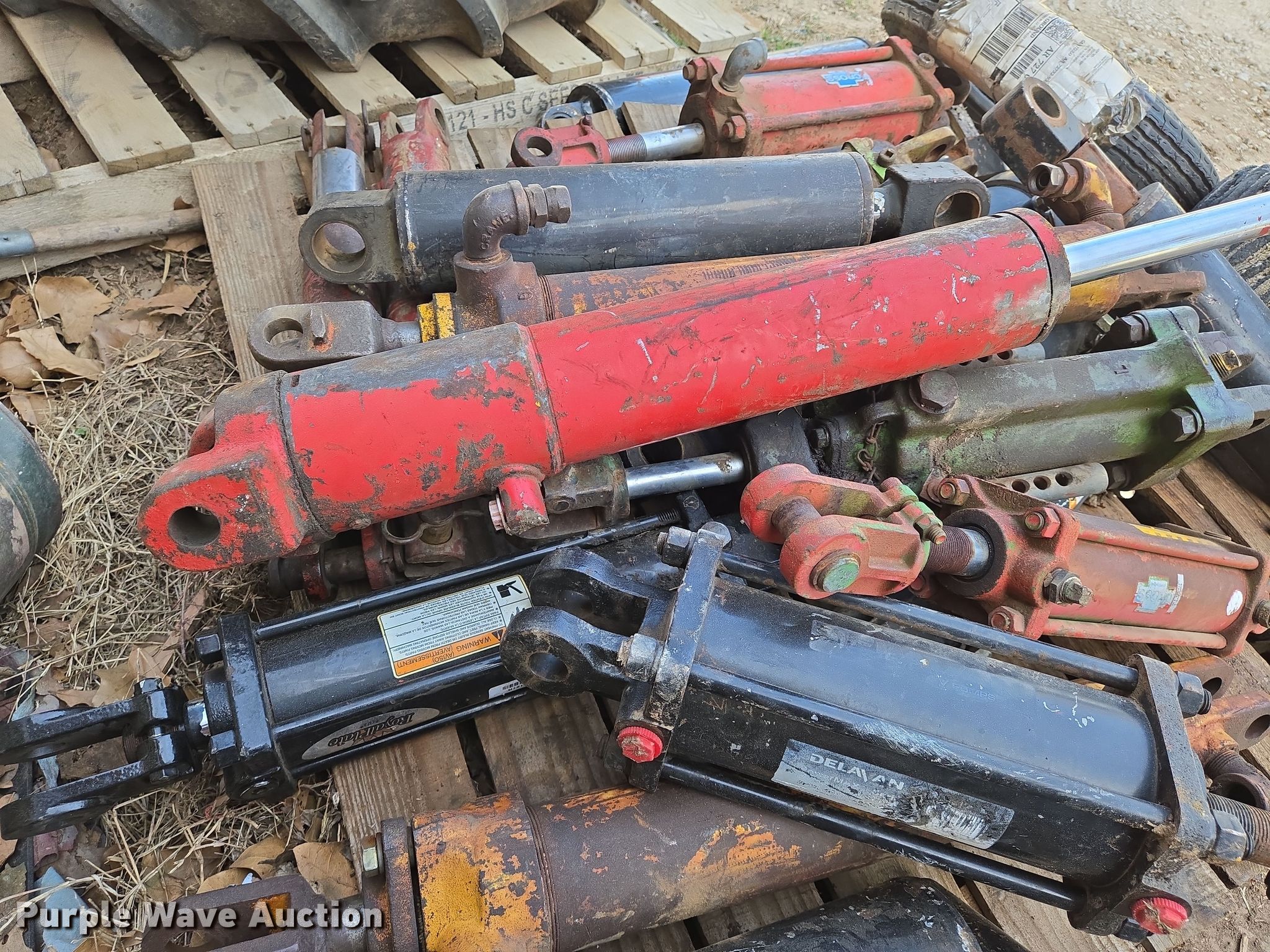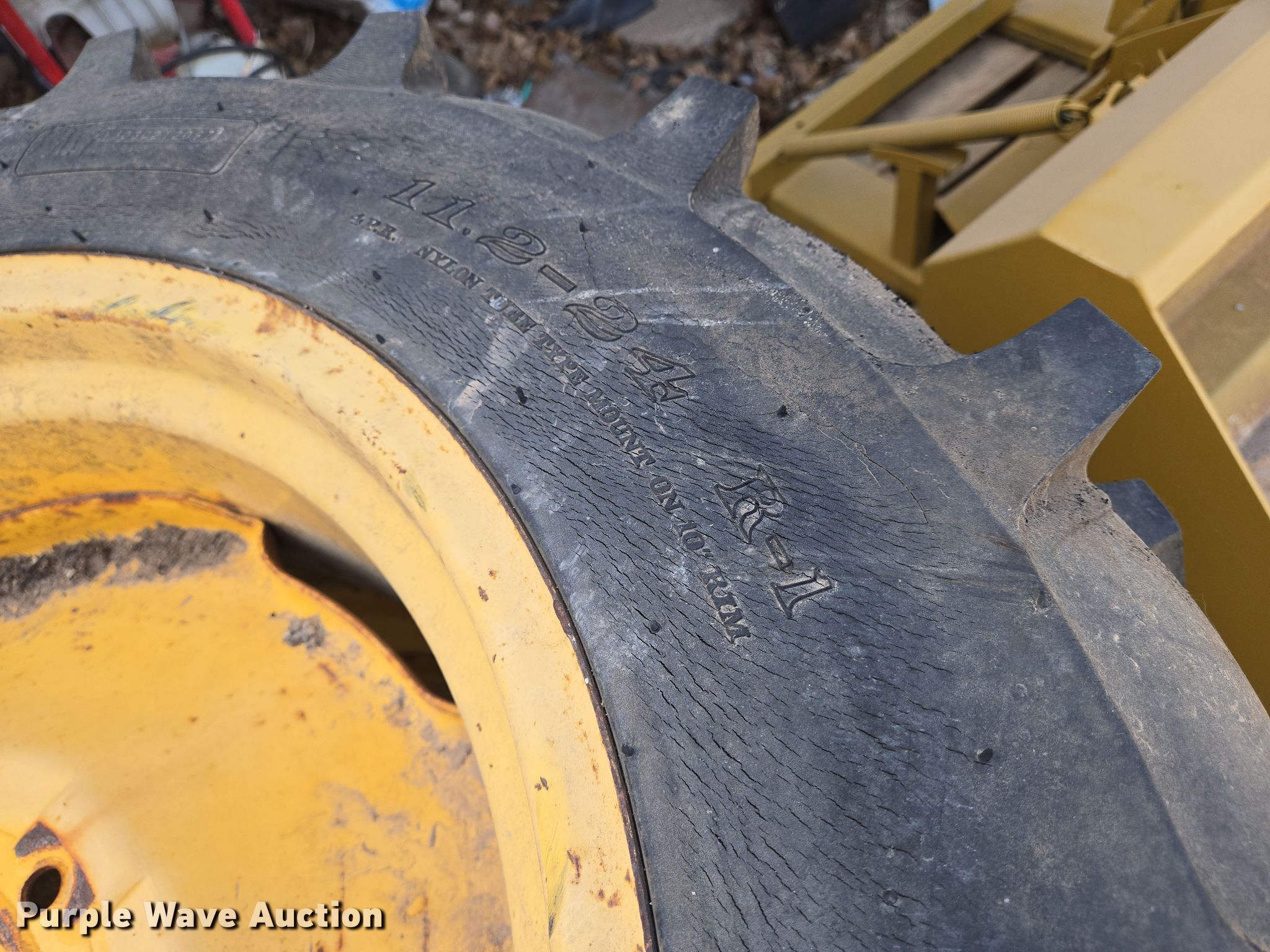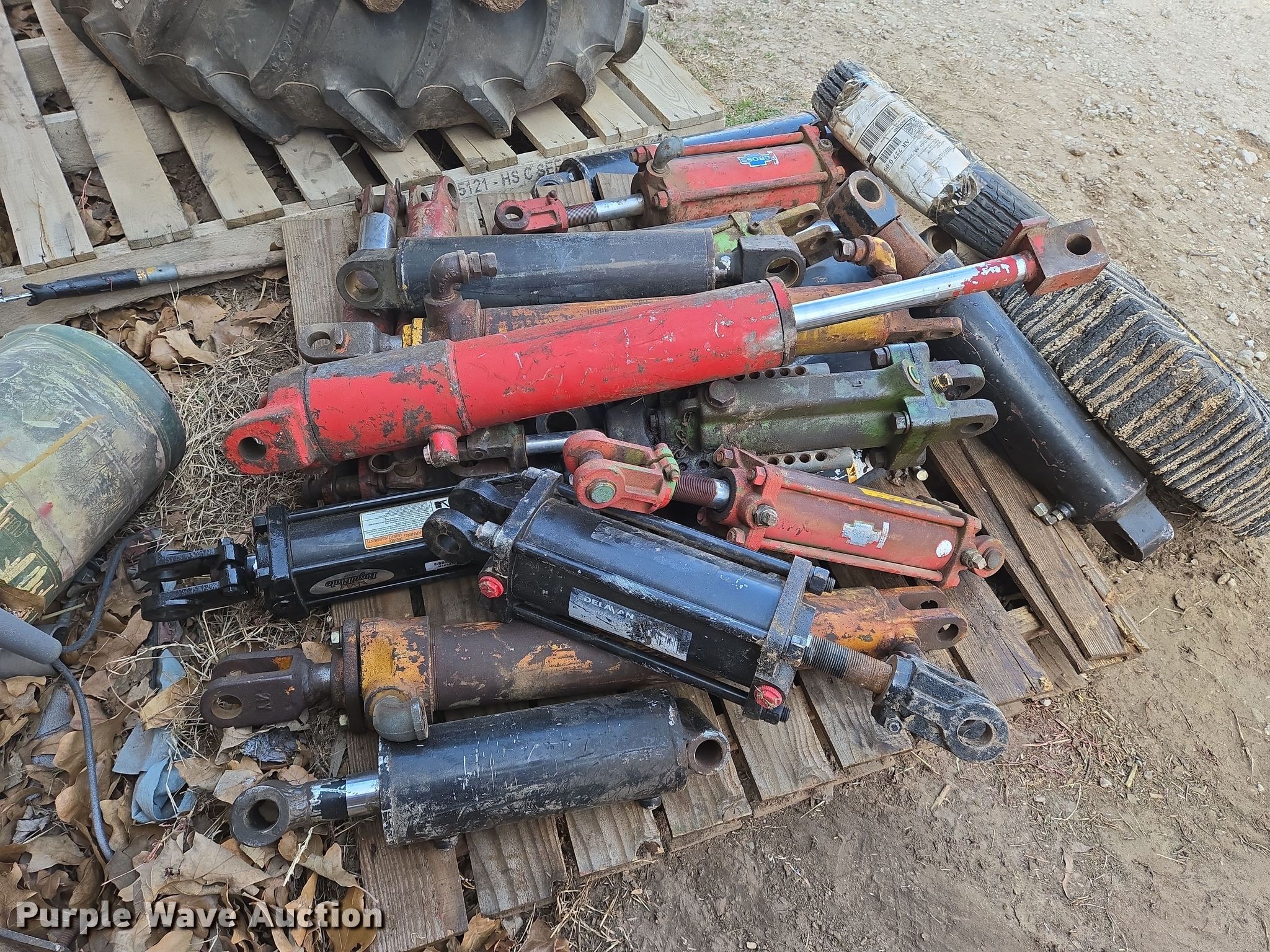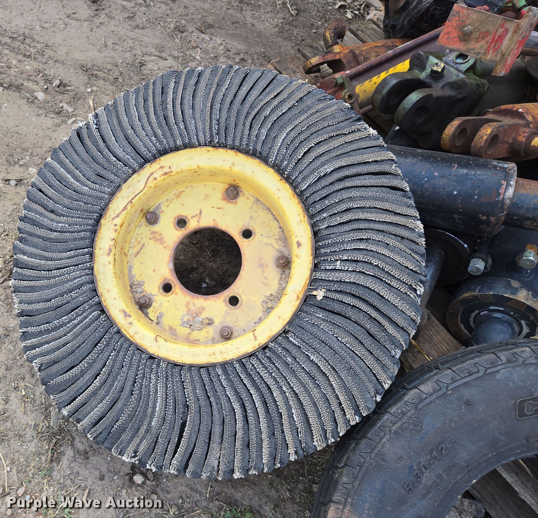 Purple Wave is selling a used Industrial Tires or Tracks in Oklahoma. This item is a Tires and wheels with the following: (4) John Deere tires and wheels, Size: 11.2-24, 20" mower tire and wheel, Solid, Carlise 5.30-12 tire, Approx. 18 hydraulic cylinders