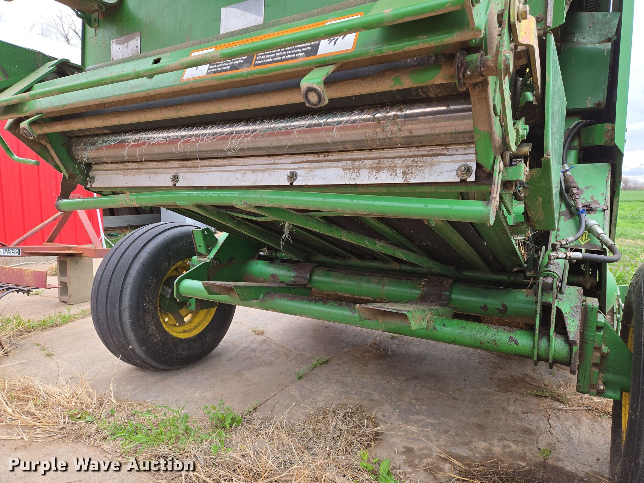 2008 John Deere 458 Megawide Plus round baler. Serial: E00458X341818. Features PTO: 540, Monitor John Deere AE74741, Transport lights, Feed assist roller, Gauge wheels Size: 4.80-8, Pickup width: 55", Hydraulic pickup lift, Bale size: 4' x 5', Twine tie, Net-wrap. Tires Size: 31x13.50-15. Colwich, KS 67030