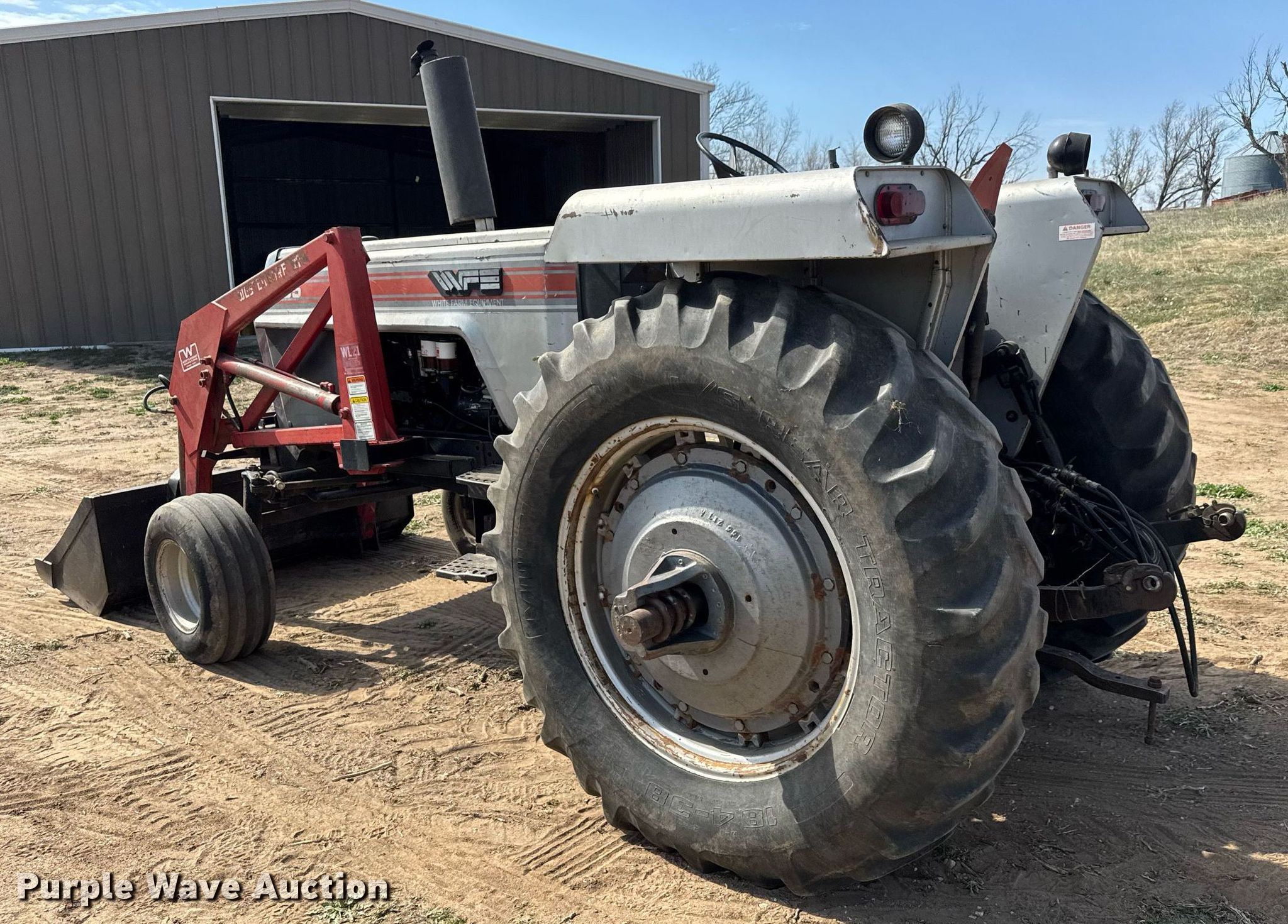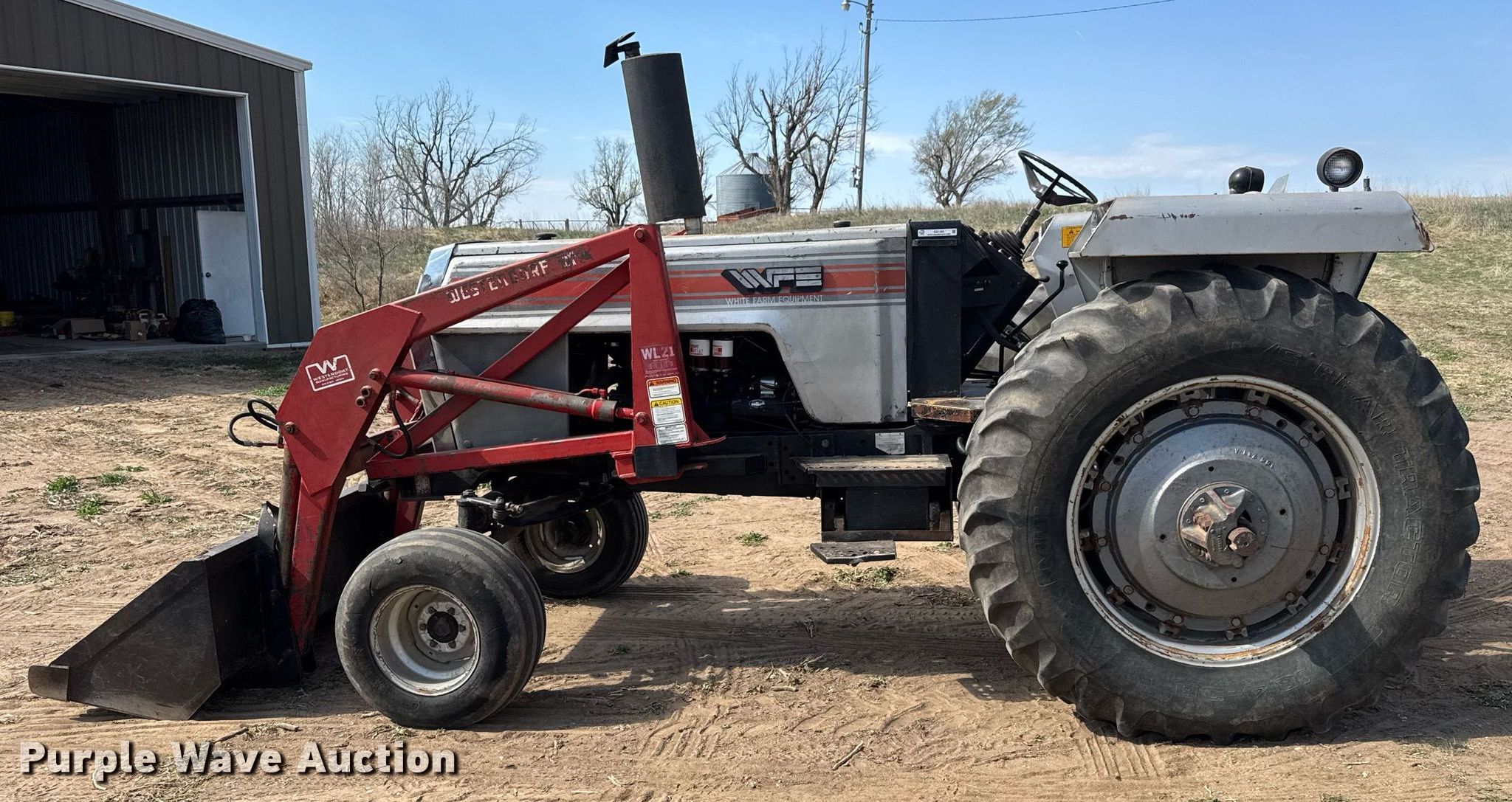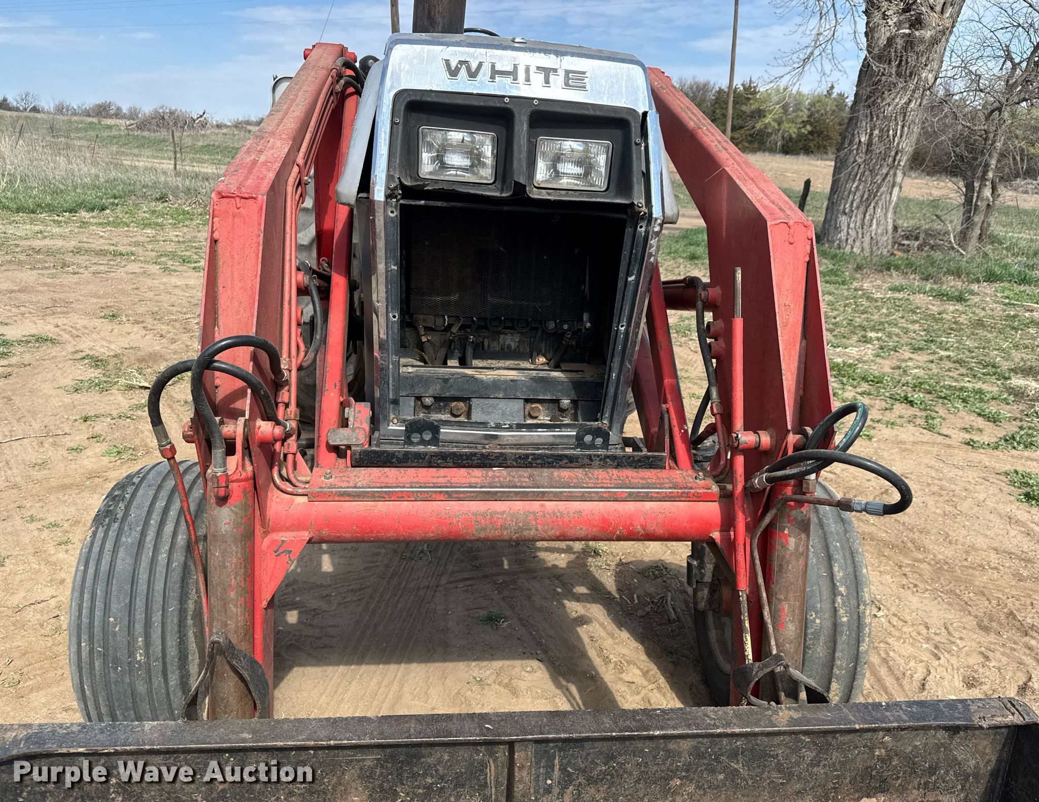 1976 White 2-85 tractor. Hours: 3,823 on meter, Serial: 270460-408. Engine Cylinders: 6, Fuel type: Diesel. Transmission Powershift, 18F - 6R. Features PTO: 540, Three point Top link, Hydraulic remote sets Rear: 2, Loader Westendorf WL21, Controls: Two-lever, Bucket Width: 74".. Tires Front: 11L-15, Rear: 18.4-38. Notes Clutch issues. Marquette, KS 67464
