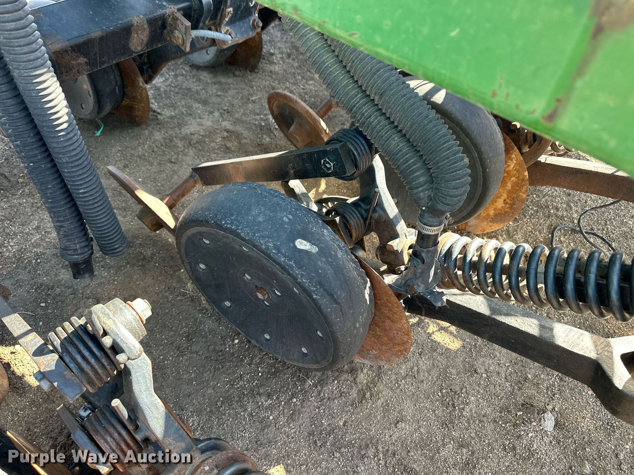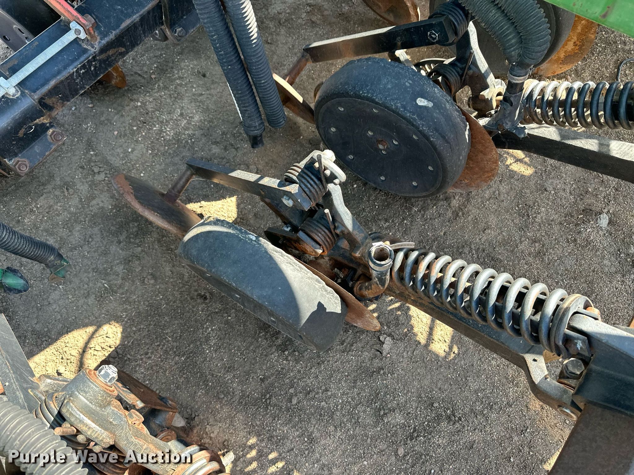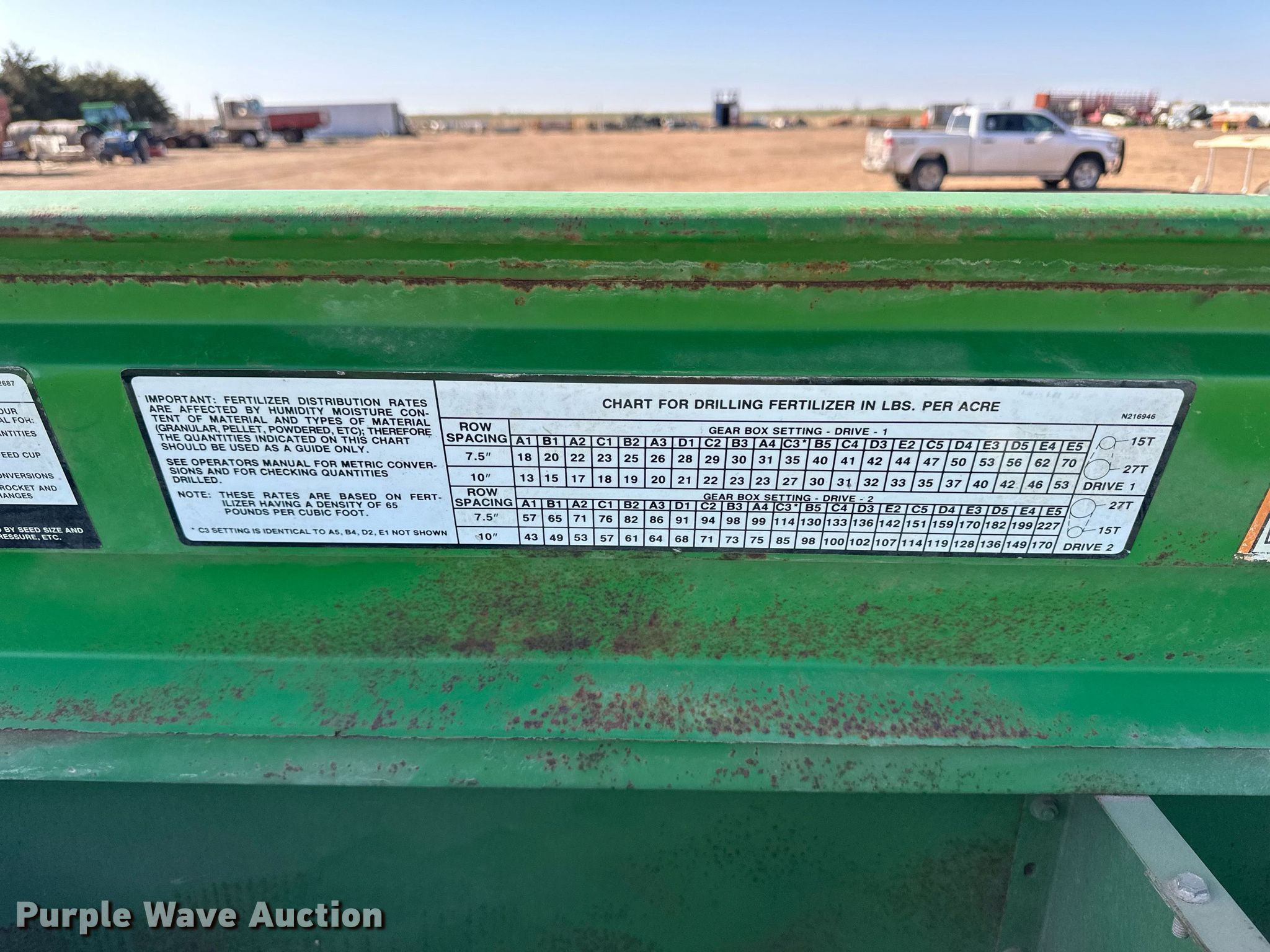 John Deere 750 grain drill. Width: 15', Row units: 18, Row spacing: 10", Serial: N00750X014103. Features Seed delivery Bulk fill system, Row units Meter drive: Ground, Down pressure: Spring, Disk openers: Single, Gauge wheels: Single, Closing system: Single Type: Cast.. Tires Drive/ outside tire size: 11L-15SL Quantity: 2. Sublette, KS 67877