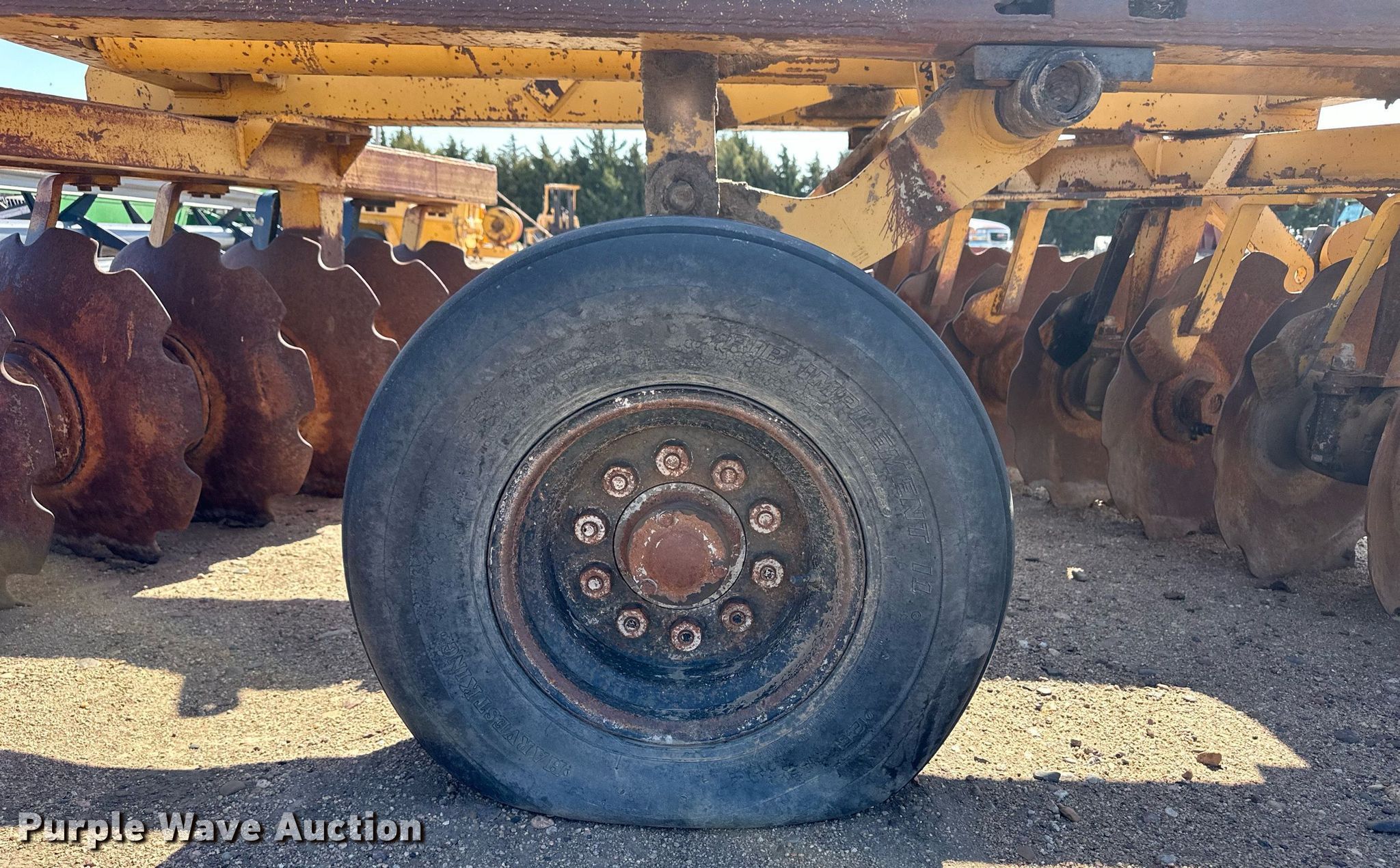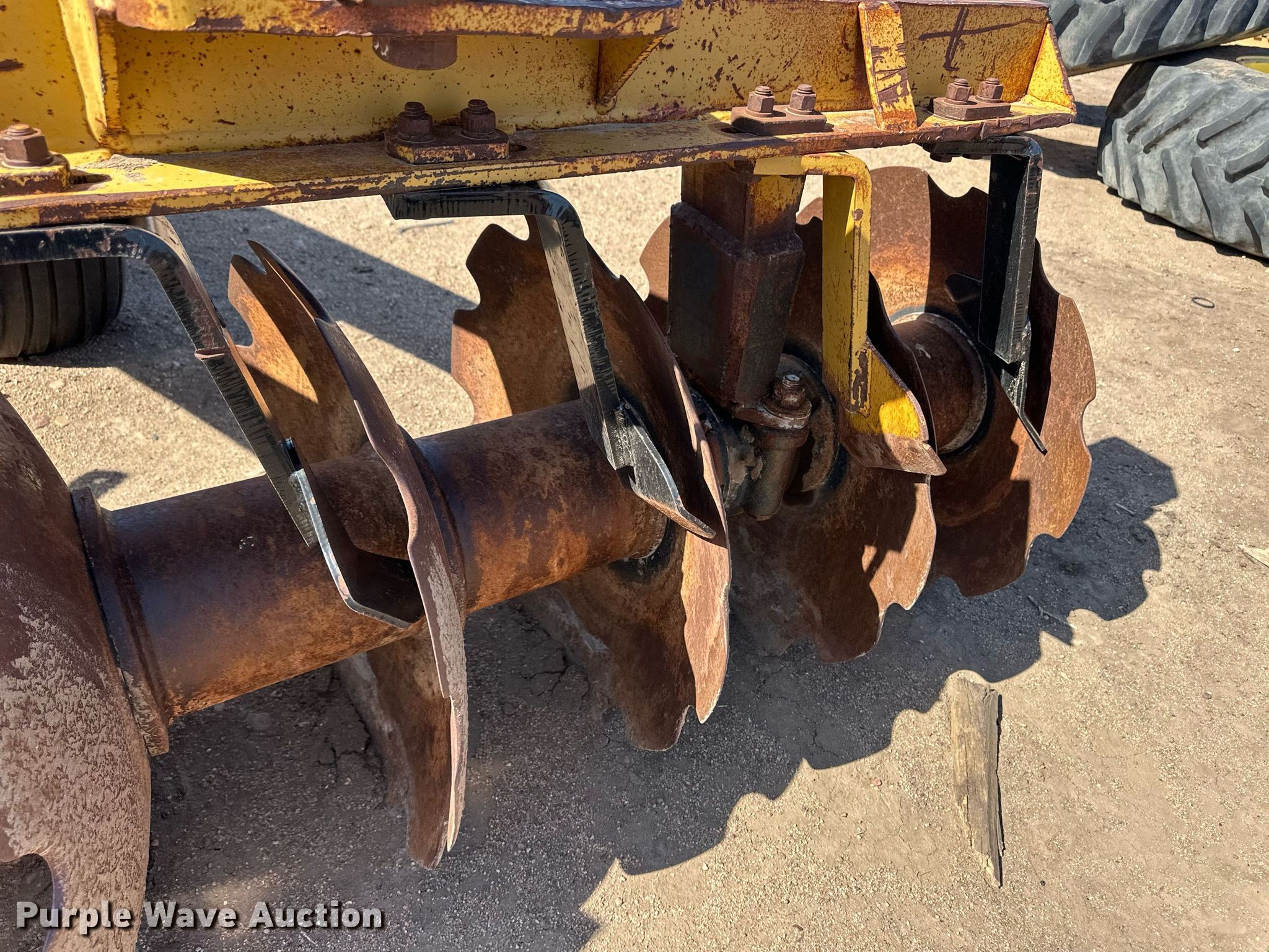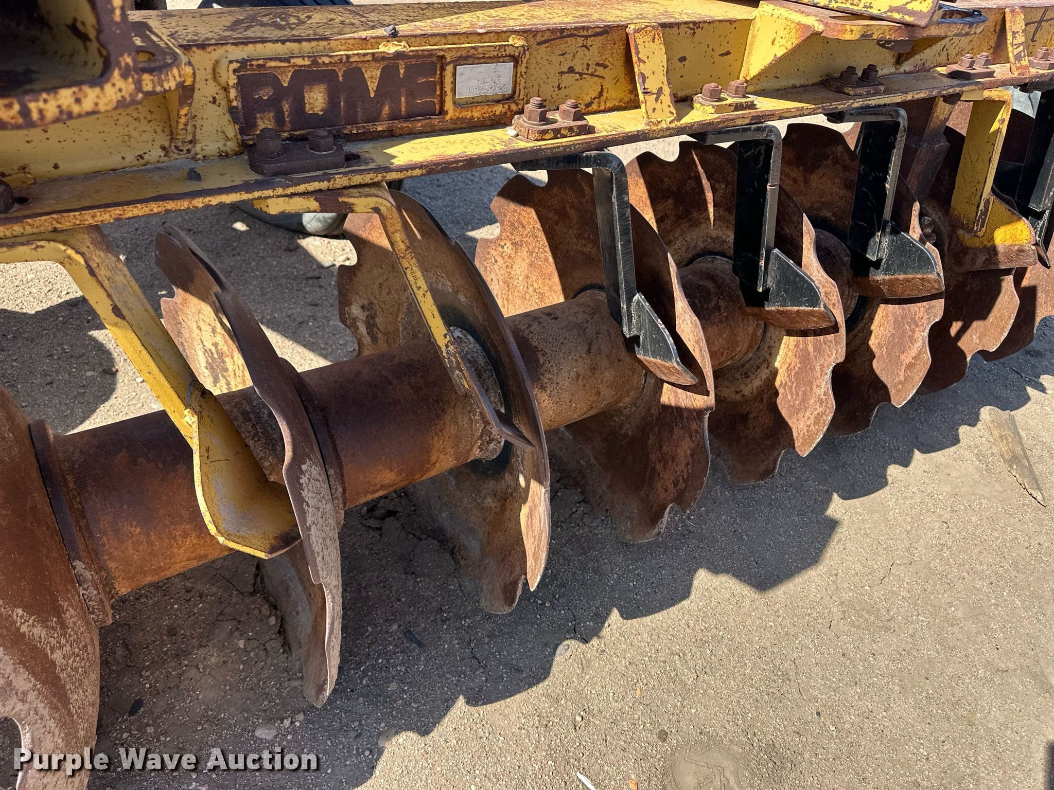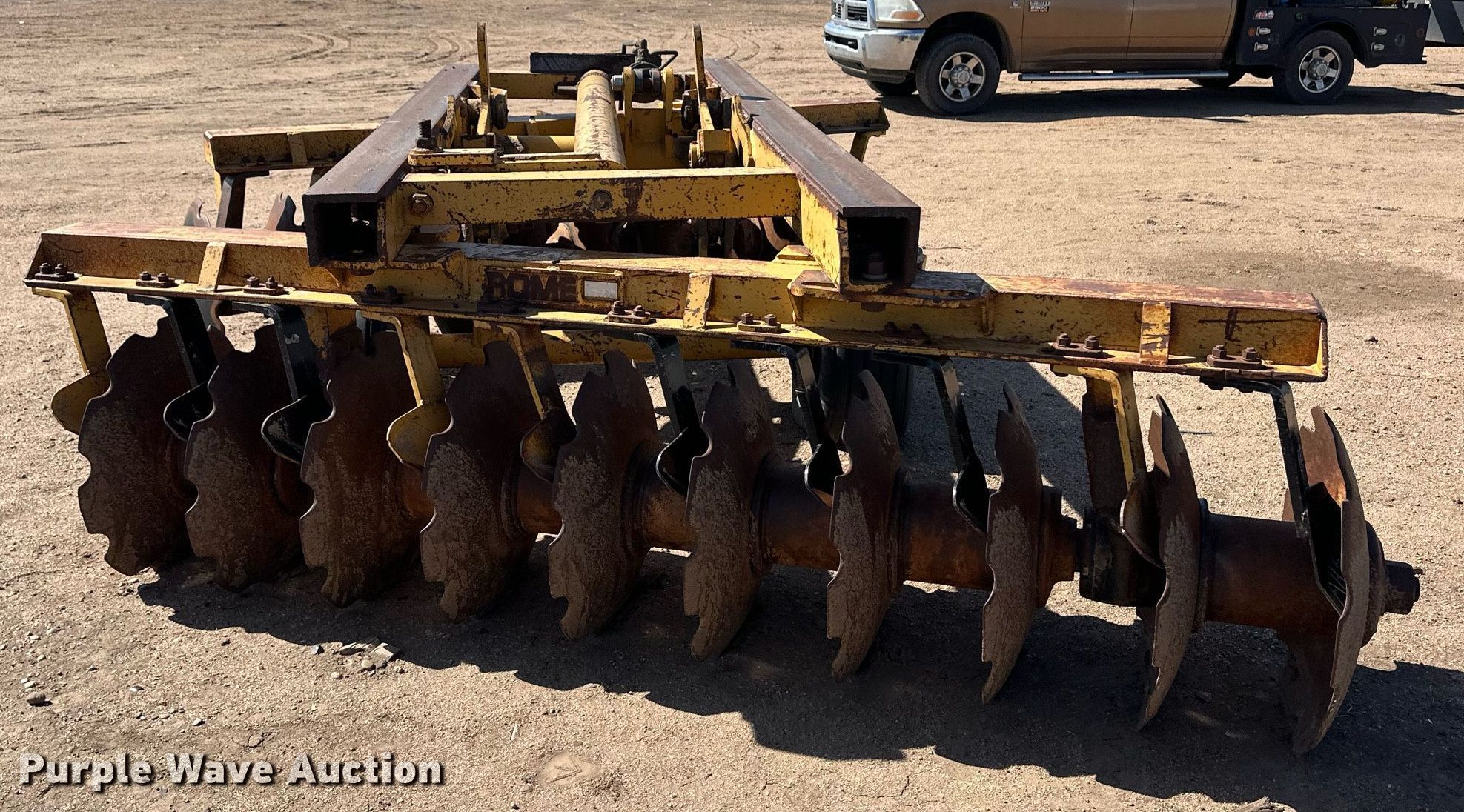 Rome TAW-20S off-set disk. Overall width: 10', Serial: 10TAW-3209SR. Features Front blades Diameter: 28", Spacing: 12", Rear blades Diameter: 28", Spacing: 12", Disk scrapers, Operation Hydraulic lift. Tires Tire size: 12.5L-15SL. Notes Flat tire. Sublette, KS 67877