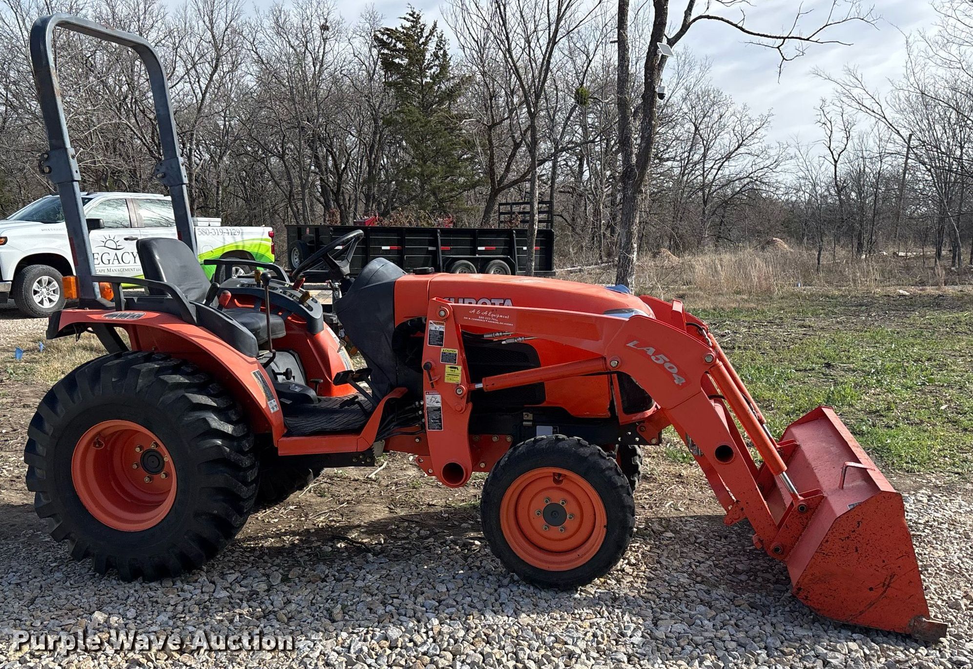 2007 Kubota B3200 HST MFWD tractor. Hours: 309 on meter, Serial: B3200HSD50278. Engine Kubota V1505-ET19, Cylinders: 4, Fuel type: Diesel. Transmission Hydrostatic, Differential lock. Features PTO: 540, Three point Top link, Loader Kubota LA504, Controls: Joystick, Bucket Width: 54".. Tires Front: 23x8.50-14, Rear: 12.4-16. Legacy Landscape Management LLC. Ardmore, OK 73401