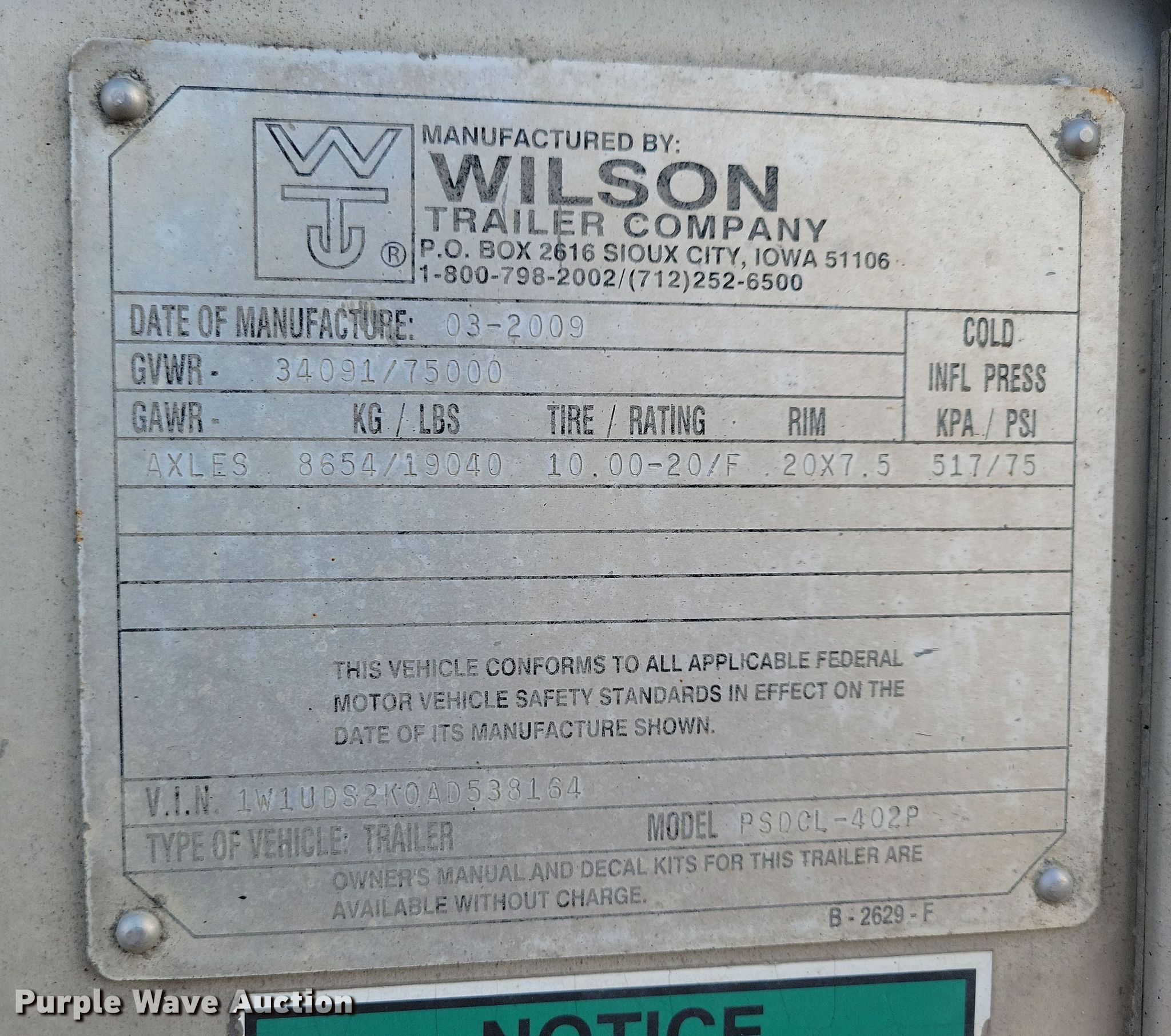 2010 Wilson PSDCL-402P livestock trailer. VIN: 1W1UDS2K0AD538164. Dimensions Overall: 53' L x 102" W, Side height: 11' 6". Features Decks: Two, Center gates: 2, Spray system, Winter kit. Chassis Landing gear: Dual, Suspension: Air, Brakes: Air, Axles: Spread, GVWR: 75,000 lbs, GAWR: 19,040 lbs. Tires Aluminum wheels, Size: 275/80R22.5. Minnesota title. Title distribution may be delayed up to 14 days from verification of funds. Ertman Leasing. Blue Earth, MN 56013