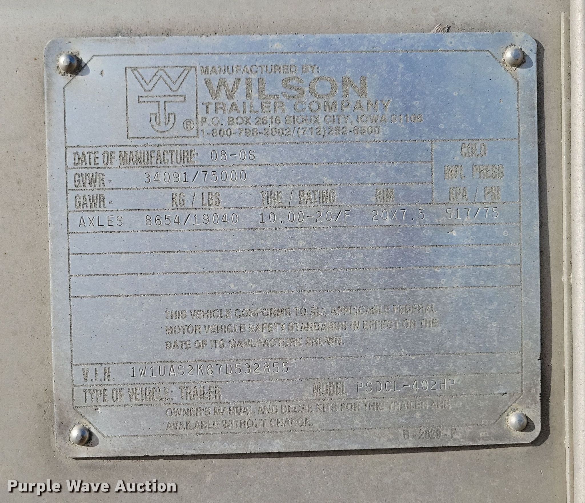 2007 Wilson PSDCL-402HP livestock trailer. VIN: 1W1UAS2K67D532855. Dimensions Overall: 53' L x 102" W, Side height: 11' 6". Features Decks: Two, Center gates: 3, Spray system, Winter kit. Chassis Landing gear: Dual, Suspension: Air, Brakes: Air, Axles: Spread, GVWR: 75,000 lbs, GAWR: 19,040 lbs. Tires Aluminum wheels, Size: 275/80R22.5. Notes Third deck flooring not included. Minnesota title. Title distribution may be delayed up to 14 days from verification of funds. Ertman Leasing. Blue Earth, MN 56013
