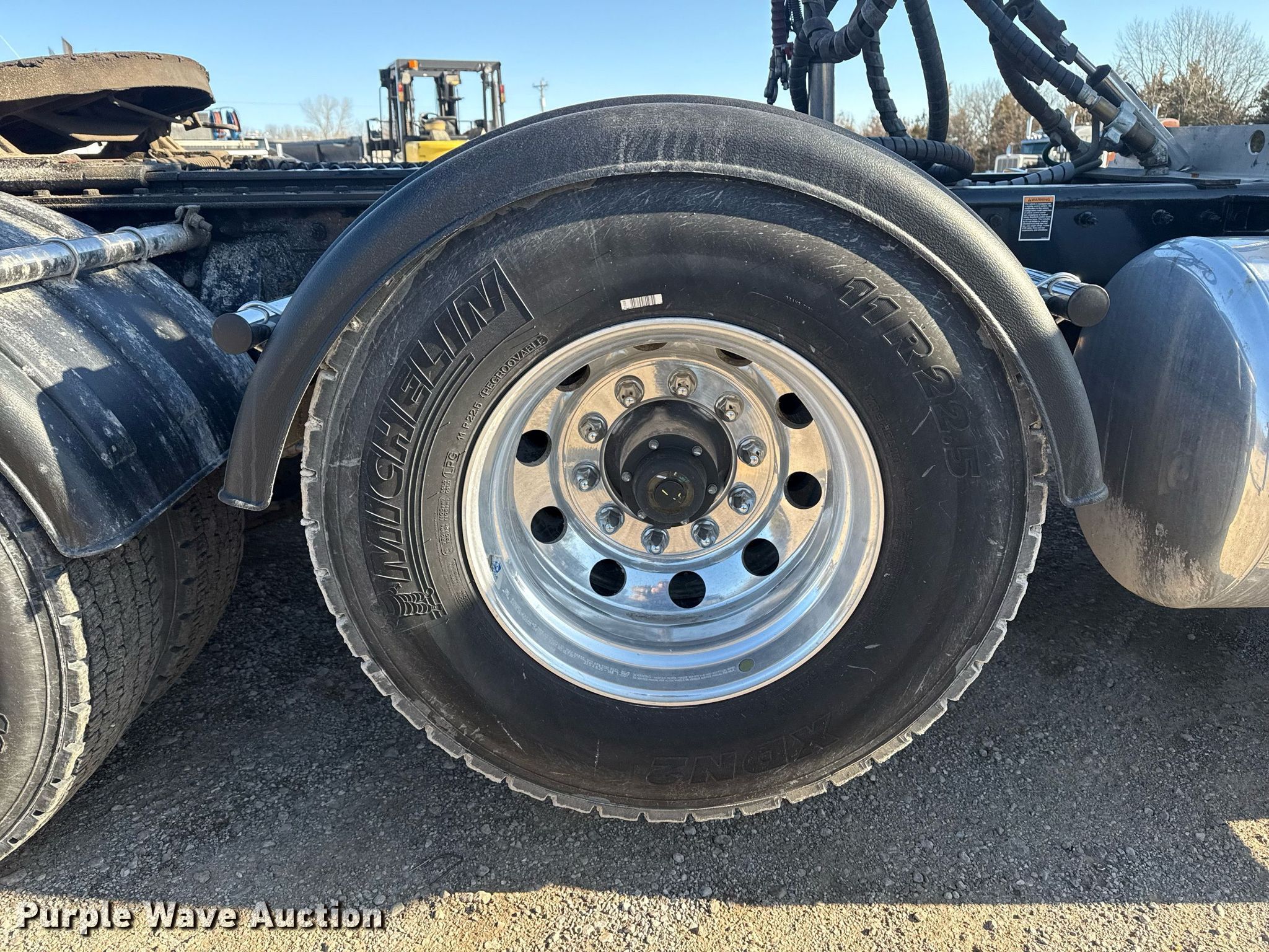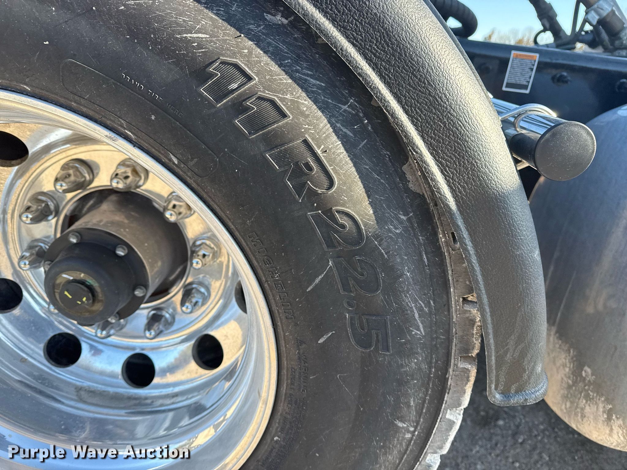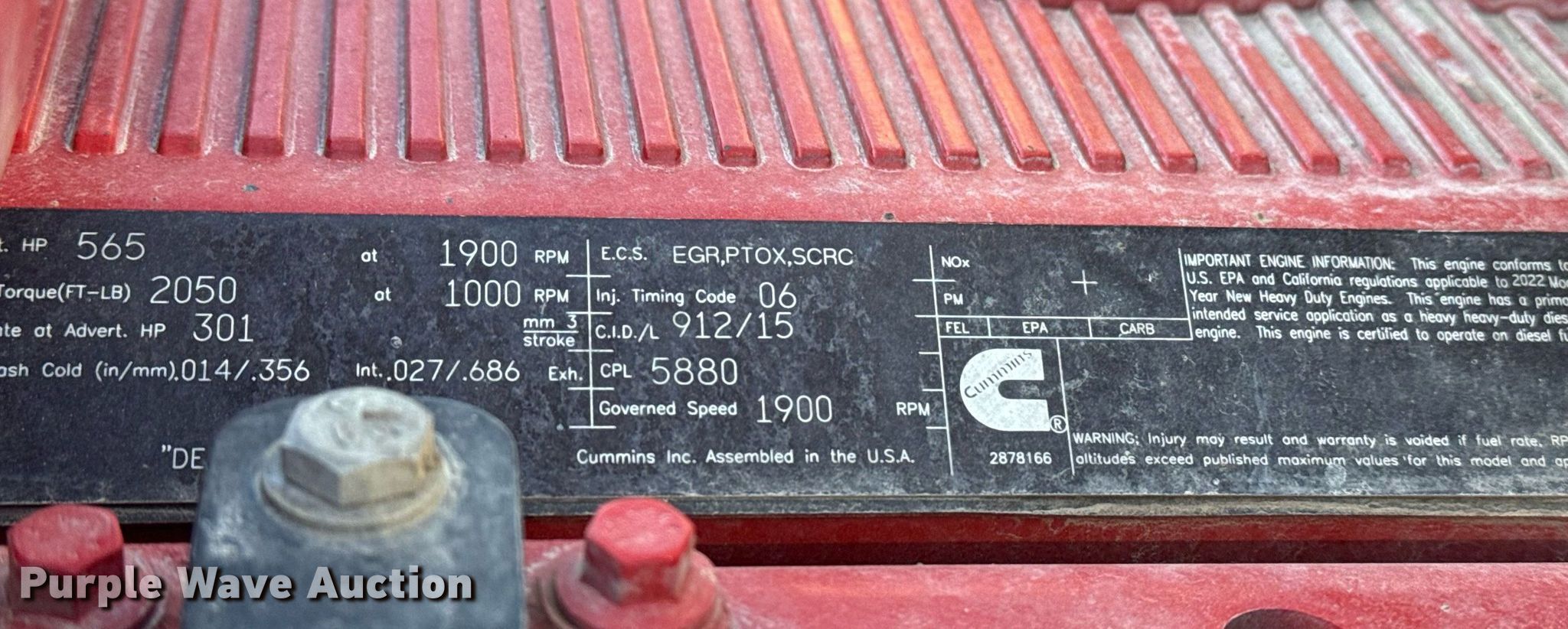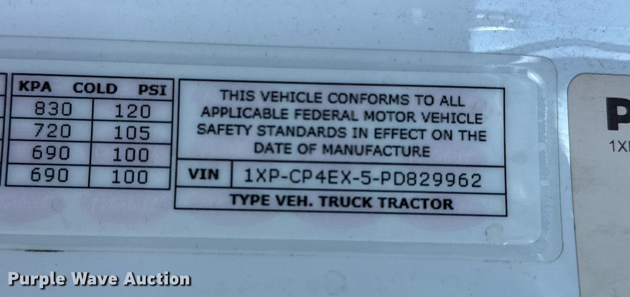 2023 Peterbilt 567 semi truck. Miles: 120,716 on odometer, VIN: 1XPCP4EX5PD829962. Engine Cummins X15, Serial: 8043970, Displacement: 15.0L, Cylinders: 6, Fuel type: Diesel, HP: 565. Transmission Eaton Fuller, Manual, Speed: 18. Chassis Axles: Triple, Pusher axle, Differential lock: Full, Suspension: Air Dump valves, Brakes: Air, PTO, Wet kit, GVWR: 80,000 lbs FAWR: 20,000 lbs, IAWR: 23,000 lbs, RAWR: 23,000 lbs, Lift axle GAWR: 23,000 lbs. Interior AC, Heat, Heated mirrors, Power windows, Power locks, Cruise control, Air ride cab. Features Deck plate: Aluminum, Fifth wheel type: Air operated, Sliding, Fuel tank: Dual. Tires Front: 385/65R22.5, Rear: 11R24.5, Lift axle: 11R22.5. Notes Windshield chipped or cracked. Oklahoma title. Title has a lien that will be released following the close of the auction. Title distribution may be delayed up to 30 days from verification of funds. ARKK Trucking Inc. Sand Springs, OK 74063