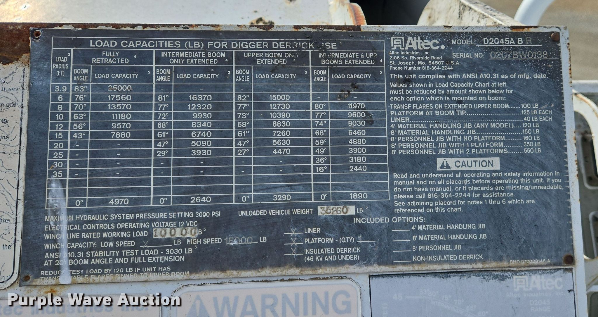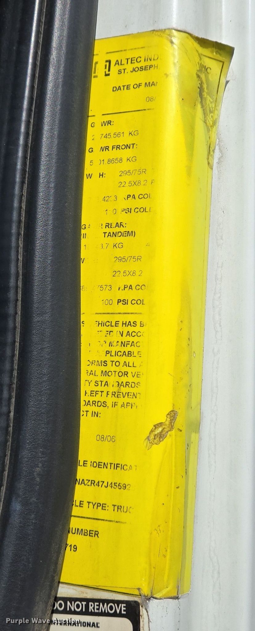 2007 International 7500 digger derrick truck. Miles: 128,268 on odometer, Hours: 8,777 on meter, VIN: 1HTWNAZR47J455928. Engine International DT570, Displacement: 9.3L, Cylinders: 6, Fuel type: Diesel. Transmission Manual. Chassis Axles: Tandem, Suspension: Spring, Brakes: Air, PTO. Interior AC, Heat, Cruise control. Features Boom Altec D2045A B R, Boom length: 35', Mast height: 45', Maximum lift capacity: 10,000 lbs, Boom type: Articulating, Insulated, Telescopic, Boom controls Platform/ basket, Remote control, Pole guide, Auger Diameter: 18".. Tires Front: 315/80R22.5, Rear: 11R22.5. Notes Dash warning indicator: Check A/C, Fuel filter, Dead battery. Missouri title. Title distribution may be delayed up to 14 days from verification of funds. Black River Electric Cooperative. Fredericktown, MO 63645