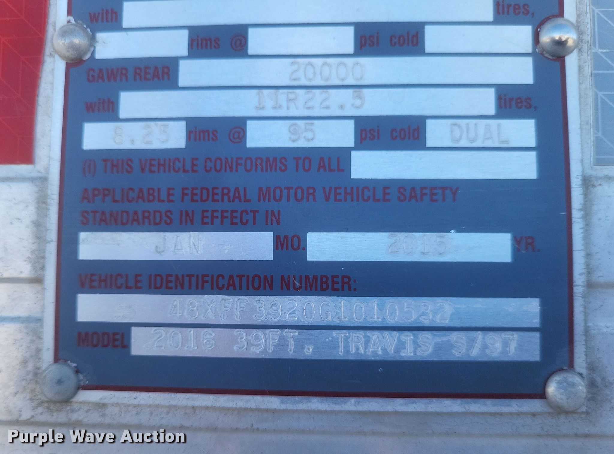 2016 Travis Body and Trailer Travis S/97 end dump trailer. VIN: 48XFF3920G1010532, Unit #: 850. Dimensions Overall: 38' 8" L x 8' 5" W, Body: 38' L, Side height: 5' 2". Features Body type: Aluminum, Ram: Single, End gate: Air operated Grain door, Roll tarp. Chassis Landing gear: Dual, Suspension: Air, Brakes: Air, Axles: Tandem, GVWR: 68,000 lbs, GAWR: 20,000 lbs. Tires Aluminum wheels, Size: 295/75R22.5. Missouri title. Title distribution may be delayed up to 14 days from verification of funds. Buchheit Logistics/World Wide Leasing, Inc.. Scott City, MO 63780