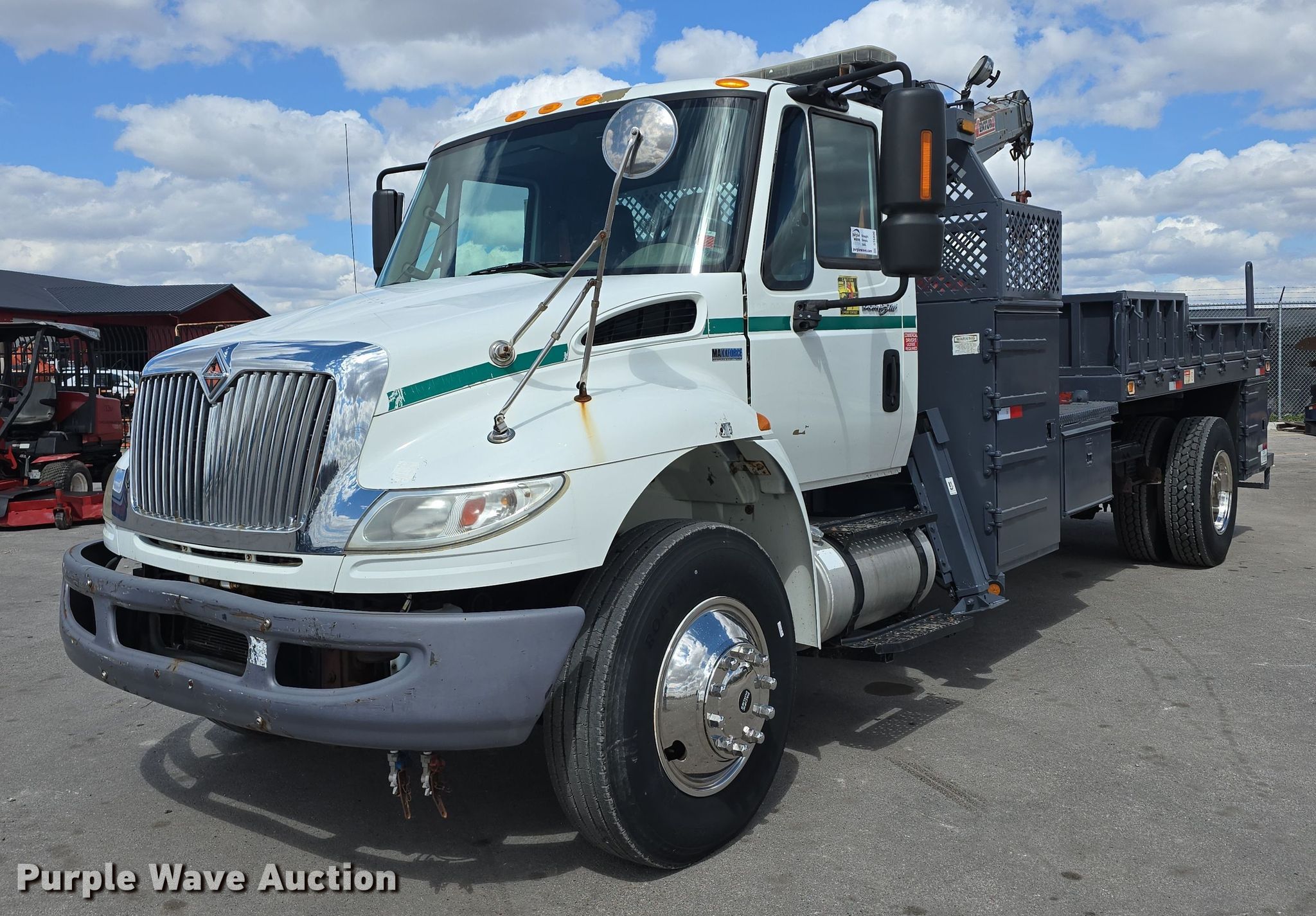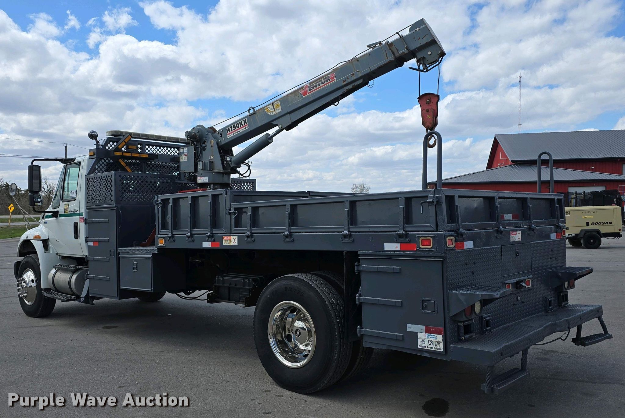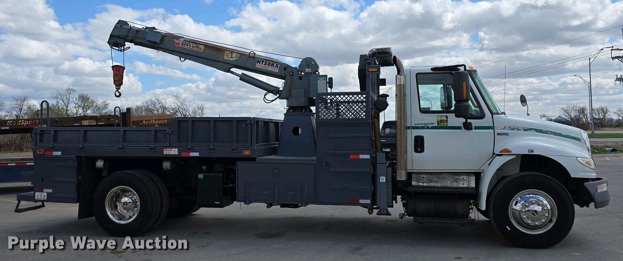 2013 International DuraStar 4300 flatbed truck. Miles: 30,960 on odometer, Hours: 2,592 on meter, VIN: 1HTMMAAN7DH113296. Engine International MaxxForce DT466, Displacement: 7.6L, Cylinders: 6, Fuel type: Diesel. Transmission Automatic. Chassis Axles: Single, Suspension: Spring, Brakes: Air, PTO, GVWR: 33,000 lbs FAWR: 12,000 lbs, RAWR: 21,000 lbs, Wheelbase: 234". Interior AC, Heat, Heated mirrors, Cruise control, Auxiliary controls. Features Flatbed Knapheide KP-943140, Serial: 20120126-0236620, 19' L x 94" W, Crane Venturo HT50KX Serial: 110323, Telescopic, Maximum boom length: 20' Sections: 3, Maximum lift capacity: 8,000 lbs, Boom controls Remote control, Crane block Sheaves: 1.. Tires Size: 11R22.5. Notes Dash warning indicator: Check engine. New York title. Seller is a Nebraska licensed motor vehicle dealer. The buyer may be required to pay sales tax and/or registration fees to the dealer prior to taking possession. Title will be assigned and distributed by the dealer. Please contact the seller for distribution questions. Jordan Machinery/ S & N Auto Sales. Waterloo, NE 68069