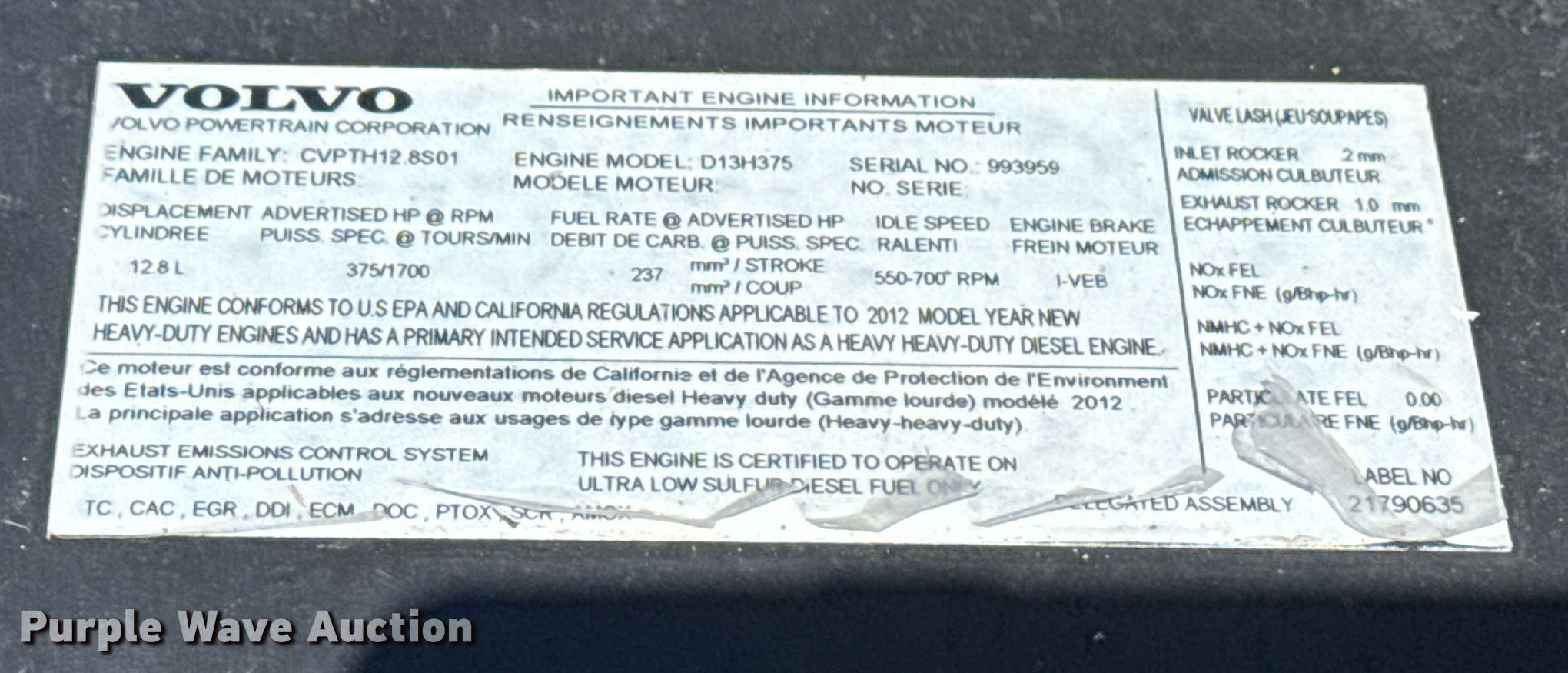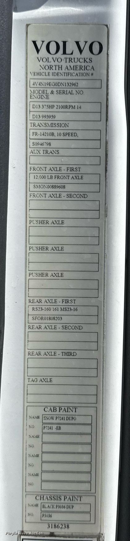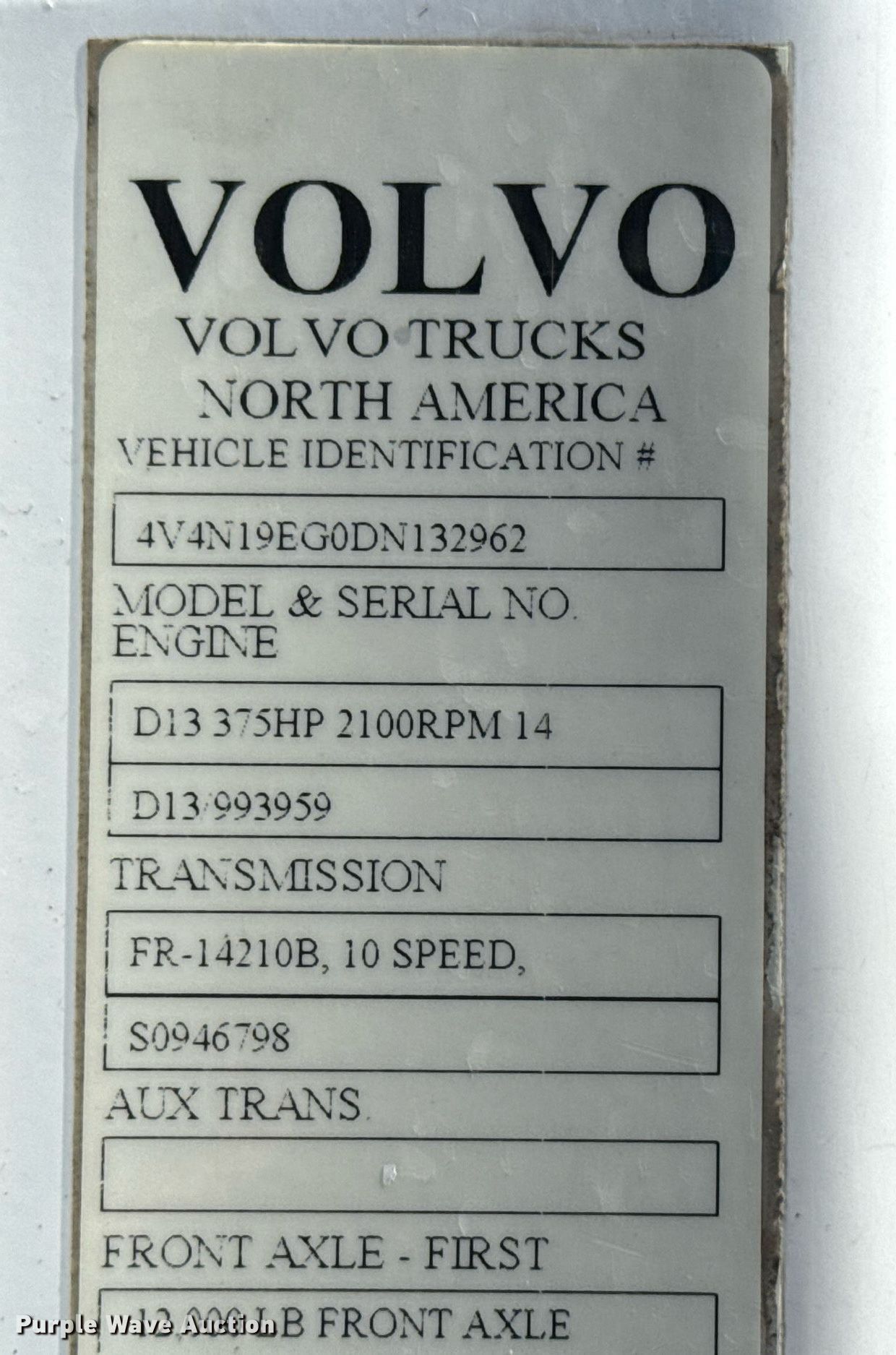 2013 Volvo Truck VNL semi truck. Miles: 674,481 on odometer, VIN: 4V4N19EG0DN132962. Engine Volvo D13H375, Serial: 993959, Displacement: 12.8L, Cylinders: 6, Fuel type: Diesel, HP: 375. Transmission Eaton Fuller, Manual, Speed: 10. Chassis Axles: Single, Suspension: Air Dump valves, Brakes: Air, GVWR: 32,000 lbs FAWR: 12,000 lbs, RAWR: 20,000 lbs. Interior AC, Heat, Heated mirrors, Power windows, Power locks, Cruise control, Air ride cab. Features Deck plate: Aluminum, Fifth wheel type: Air operated, Fixed, Fuel tank: Dual. Tires Front: 275/80R22.5, Rear: 295/75R22.5. Notes Windshield chipped or cracked. Oklahoma title. Seller is an Oklahoma licensed motor vehicle dealer. Title will be assigned and distributed by the dealer. Please contact the seller for distribution questions. Title distribution may be delayed up to 30 days from verification of funds. 15107 North 137th East Avenue. Collinsville, OK 74021
