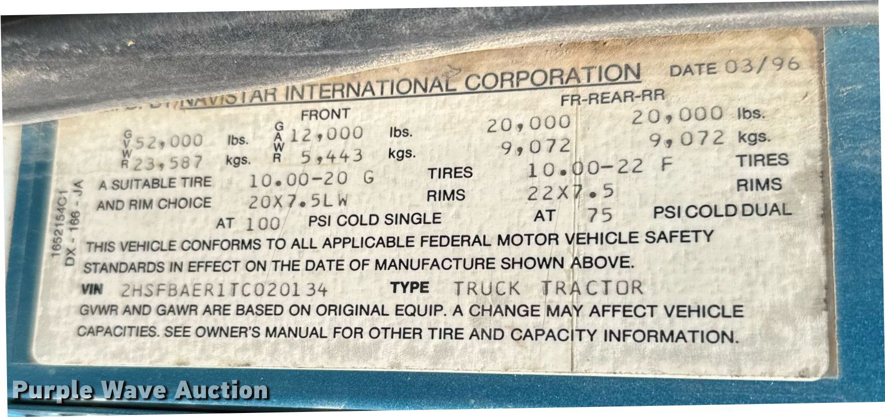 Purple Wave is selling a used Truck Tractor in Kansas. This item is a 1996 International 9300 Eagle semi truck with the following: Miles: 763,490 on odometer, VIN: 2HSFBAER1TC020134