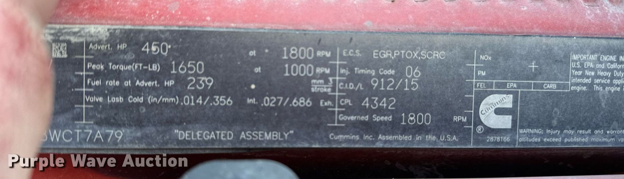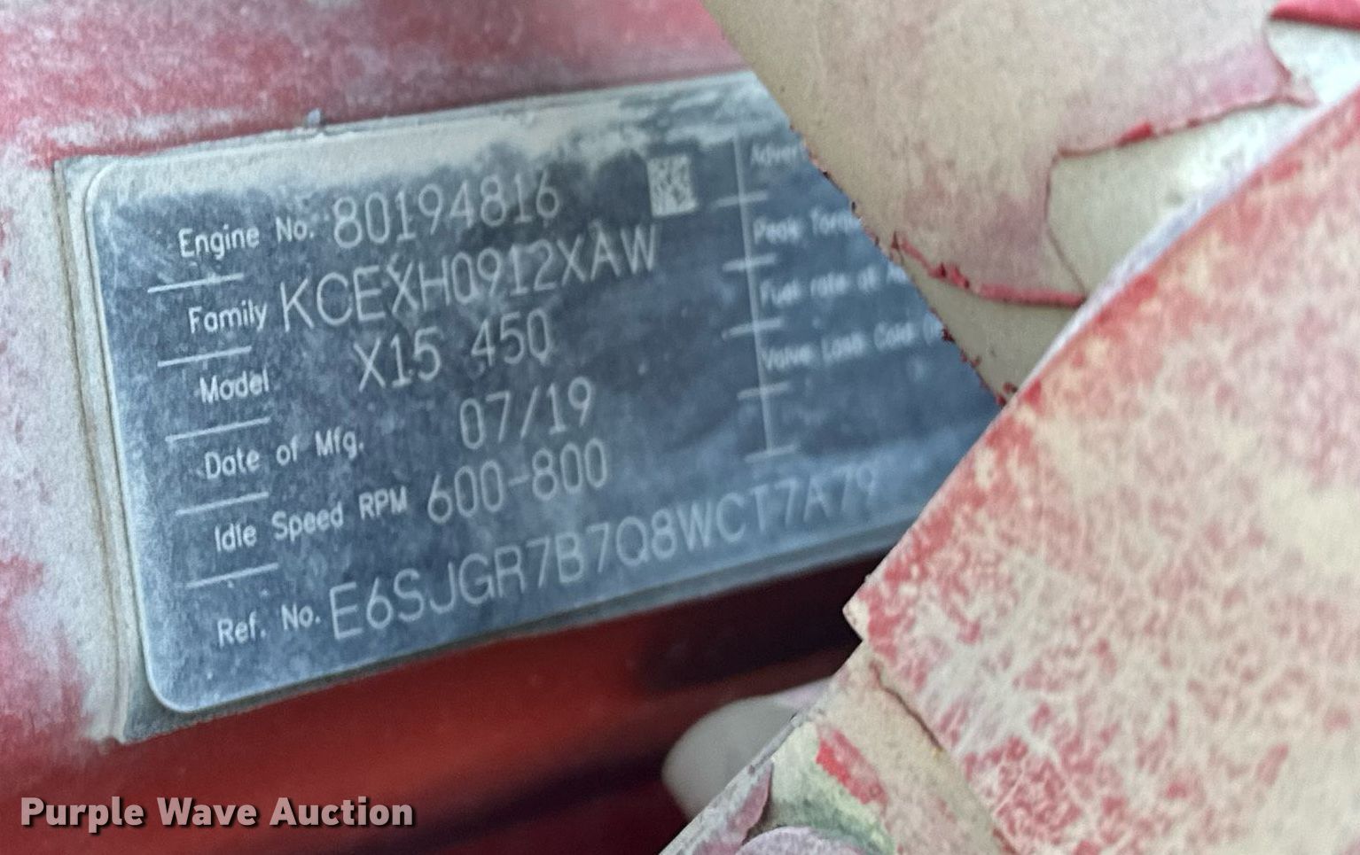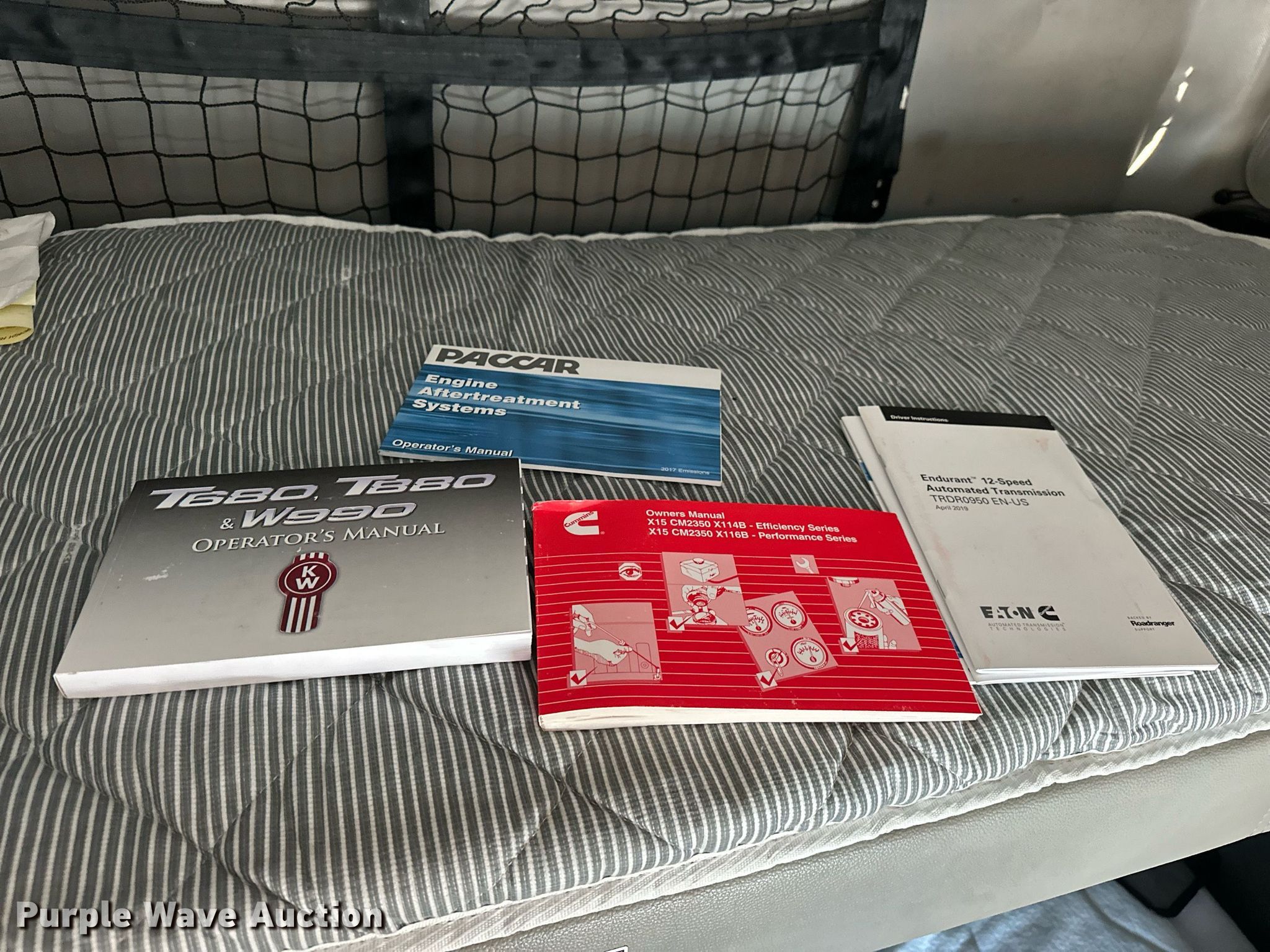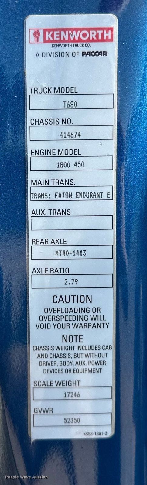2020 Kenworth T680 semi truck. Miles: 518,726 on odometer, Engine hours: 21,432 on meter, VIN: 1XKYD49X4LJ414674. Engine Cummins ISX / X15, Serial: 80194816, Displacement: 15.0L, Cylinders: 6, Fuel type: Diesel, HP: 450, Engine brake. Transmission Eaton Fuller, Automated manual. Chassis Axles: Tandem, Differential lock: Inter-axle, Suspension: Air Dump valves, Brakes: Air, GVWR: 52,350 lbs FAWR: 12,350 lbs, IAWR: 20,000 lbs, RAWR: 20,000 lbs. Interior AC, Heat, Heated mirrors, Power windows, Power locks, Cruise control, Air ride cab, Sleeper Sleeper length: 63", Beds: Double bunk, Rear climate control. Features Deck plate: Aluminum, Fifth wheel type: Fixed, Fuel tank: Dual. Tires Size: 295/75R22.5. Notes Windshield chipped or cracked. Oklahoma title. Title distribution may be delayed up to 30 days from verification of funds. 10X Ranch. Stillwater, OK 74075