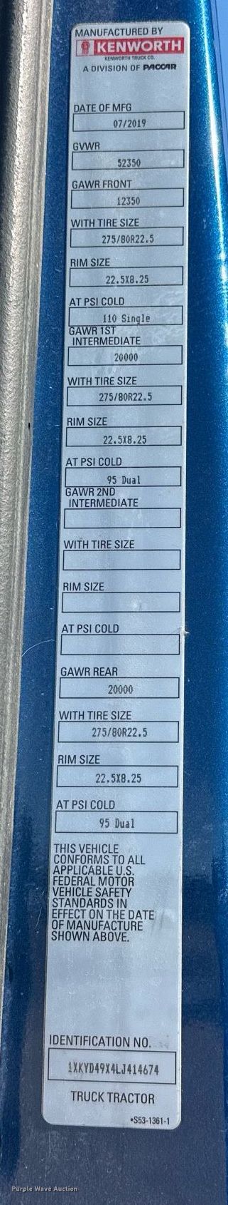 Purple Wave is selling a used Truck Tractor in Oklahoma. This item is a 2020 Kenworth T680 semi truck with the following: Miles: 518,726 on odometer, Engine hours: 21,432 on meter, VIN: 1XKYD49X4LJ414674