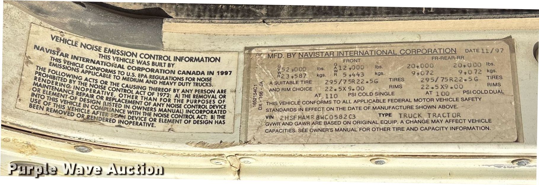 Purple Wave is selling a used Truck Tractor in Oklahoma. This item is a 1998 International 9200 semi truck with the following: Miles: 986,743 on odometer, VIN: 2HSFMAMR8WC058203, Unit #: 328