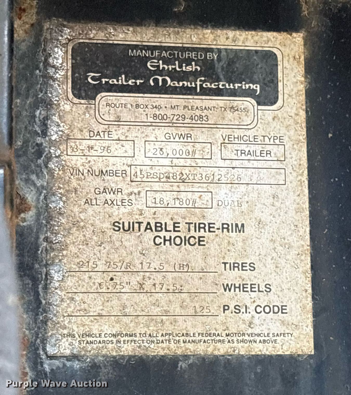 Purple Wave is selling a used Flat or Drop Deck Trailer in Oklahoma. This item is a 1996 Ehrlish drop deck trailer with the following: VIN: 45PSD482XT3612526