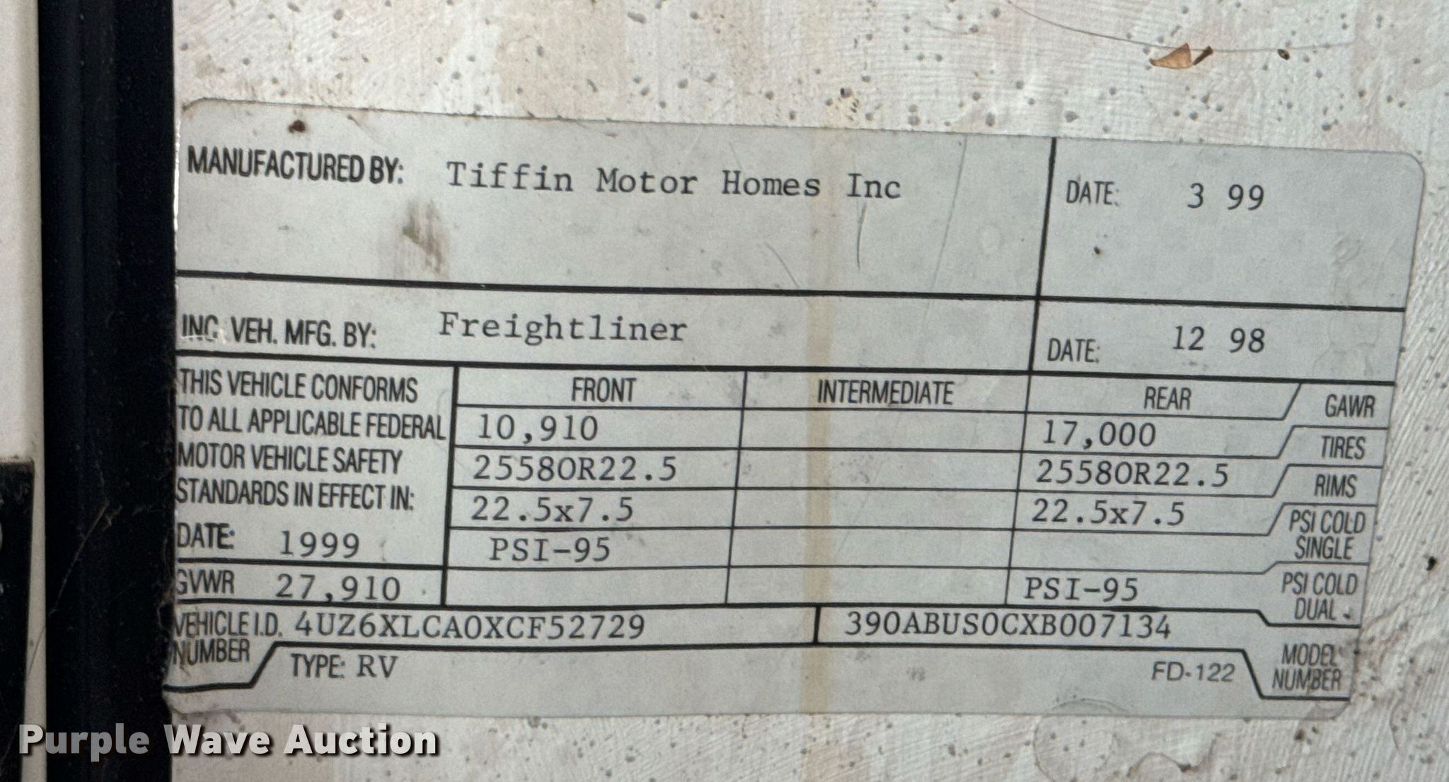 Purple Wave is selling a used RV or Camper in Oklahoma. This item is a 1999 Tiffin Motor Homes Allegro Bus RV with the following: Miles: 54,893 on odometer, Hours: 2,386 on meter, Camper length: 37', VIN: 4UZ6XLCA0XCF52729
