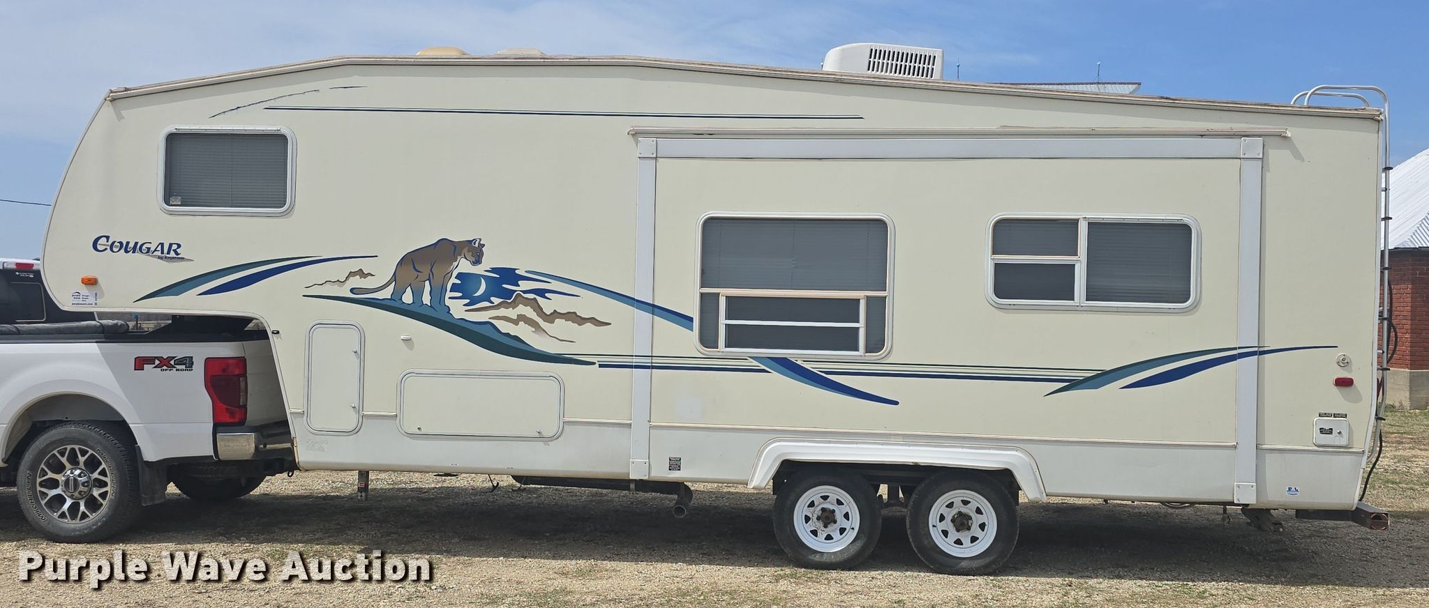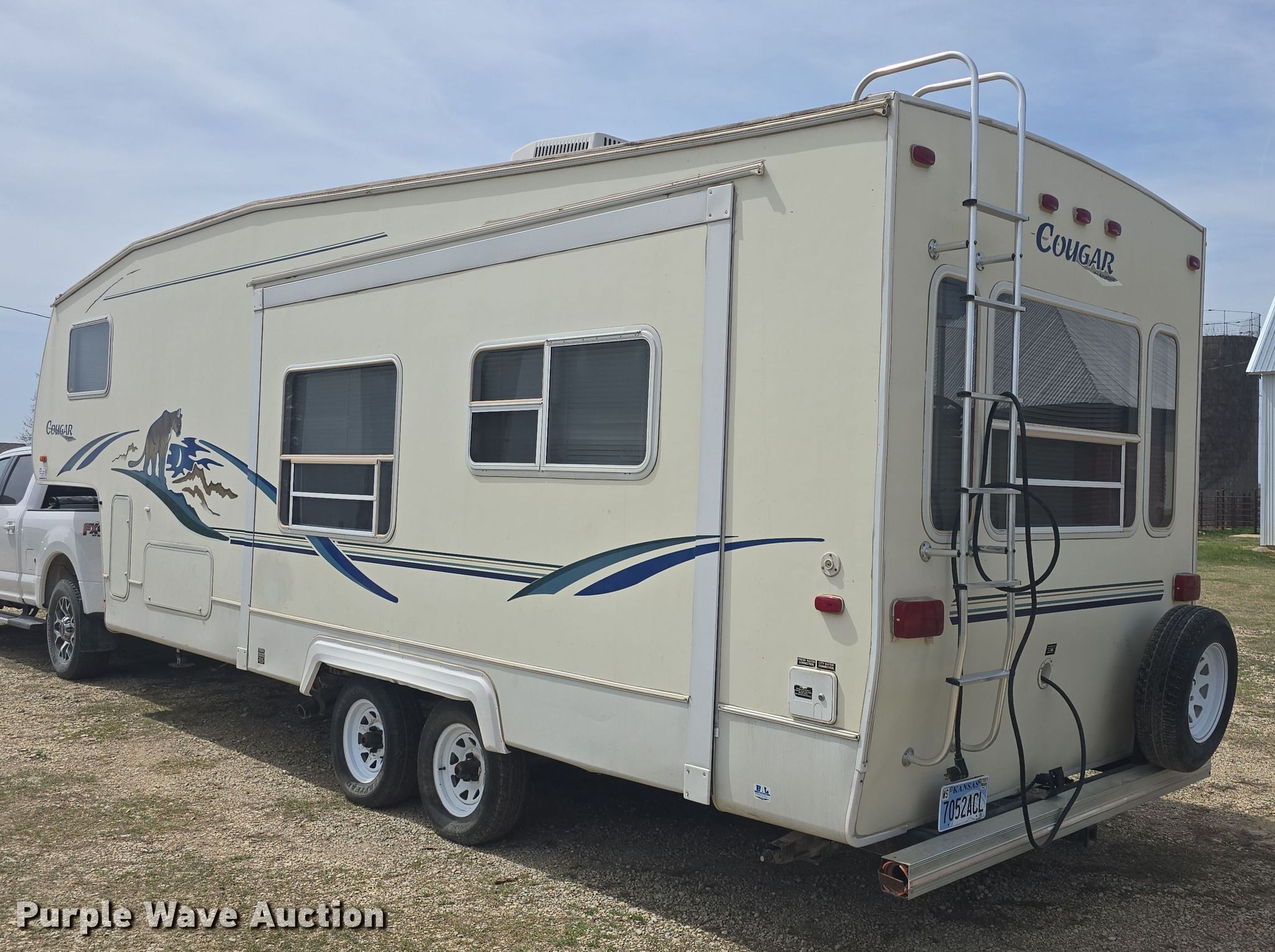 2001 Keystone Cougar camper. Camper length: 27' 6", VIN: 4YDF2762712029617. Chassis Axles: Tandem, Suspension: Spring, Brakes: Electric. Interior Kitchen: Sink, Refrigerator, Freezer, Microwave, Oven, Stove: Propane, Living room: Table, Pull out couch, Bathroom, Beds: 1 Bed type: Queen, Sound system, Heater, AC units: 1. Features Slide outs: 1, Awnings: 1 Awning type: Manual, Rear hitch, Hitch: Fifth wheel BW Companion. Tires Size: 205/75R15, Brand: Good Year. Notes Awning worn, Truck not included. Kansas title. Palmer, KS 66962