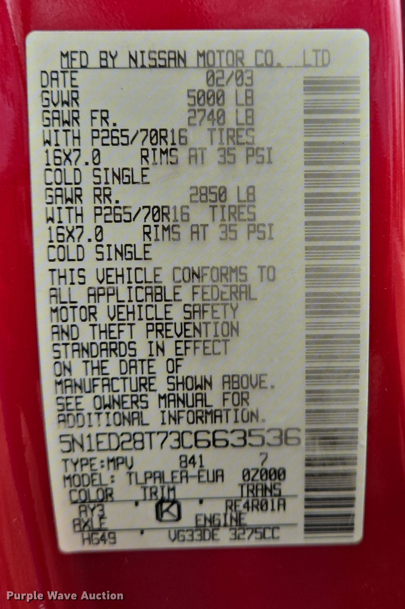 Purple Wave is selling a used Passenger Vehicle in Missouri. This item is a 2003 Nissan XTerra SUV with the following: Miles: 151,853 on odometer, VIN: 5N1ED28T73C663536