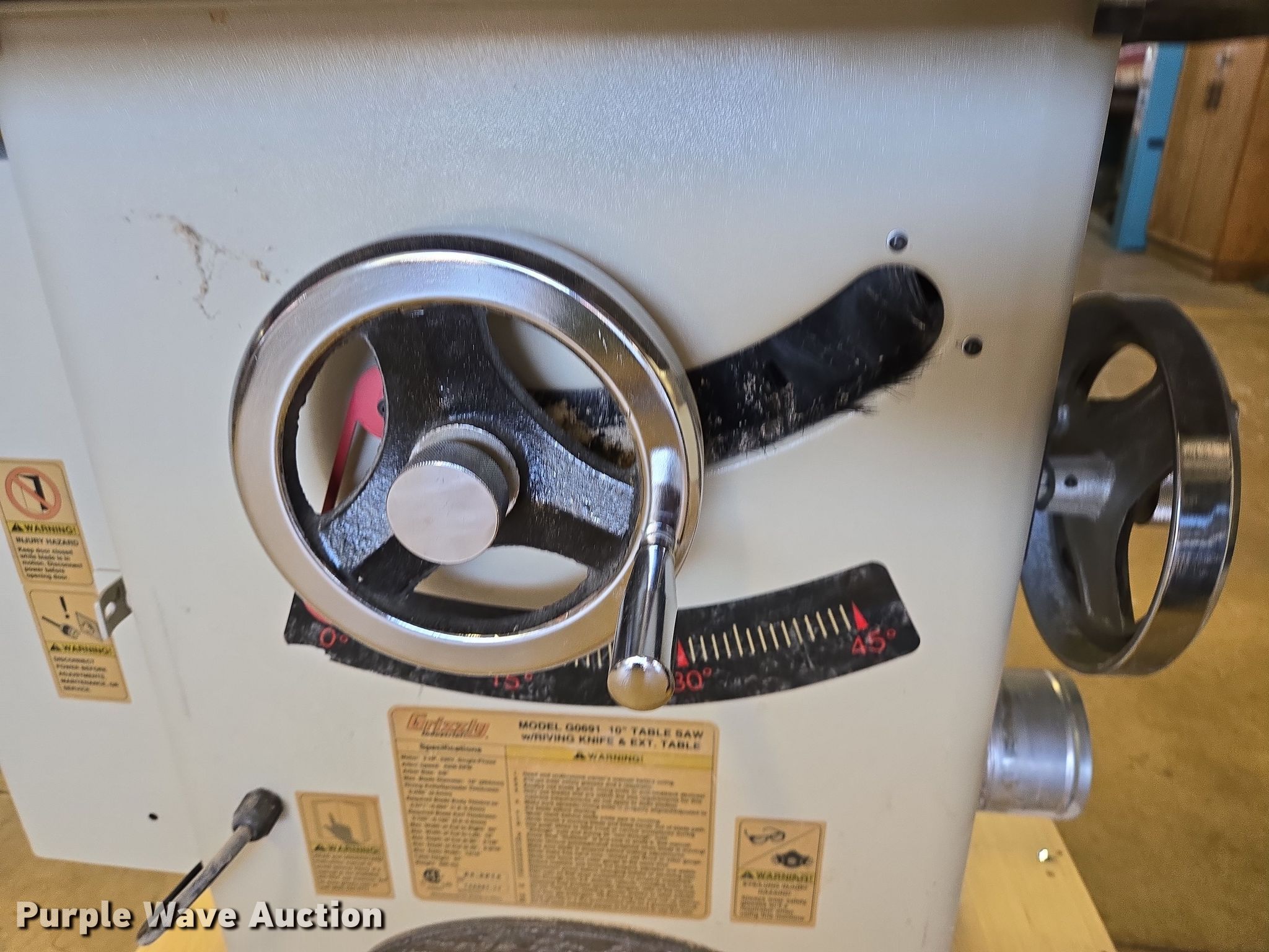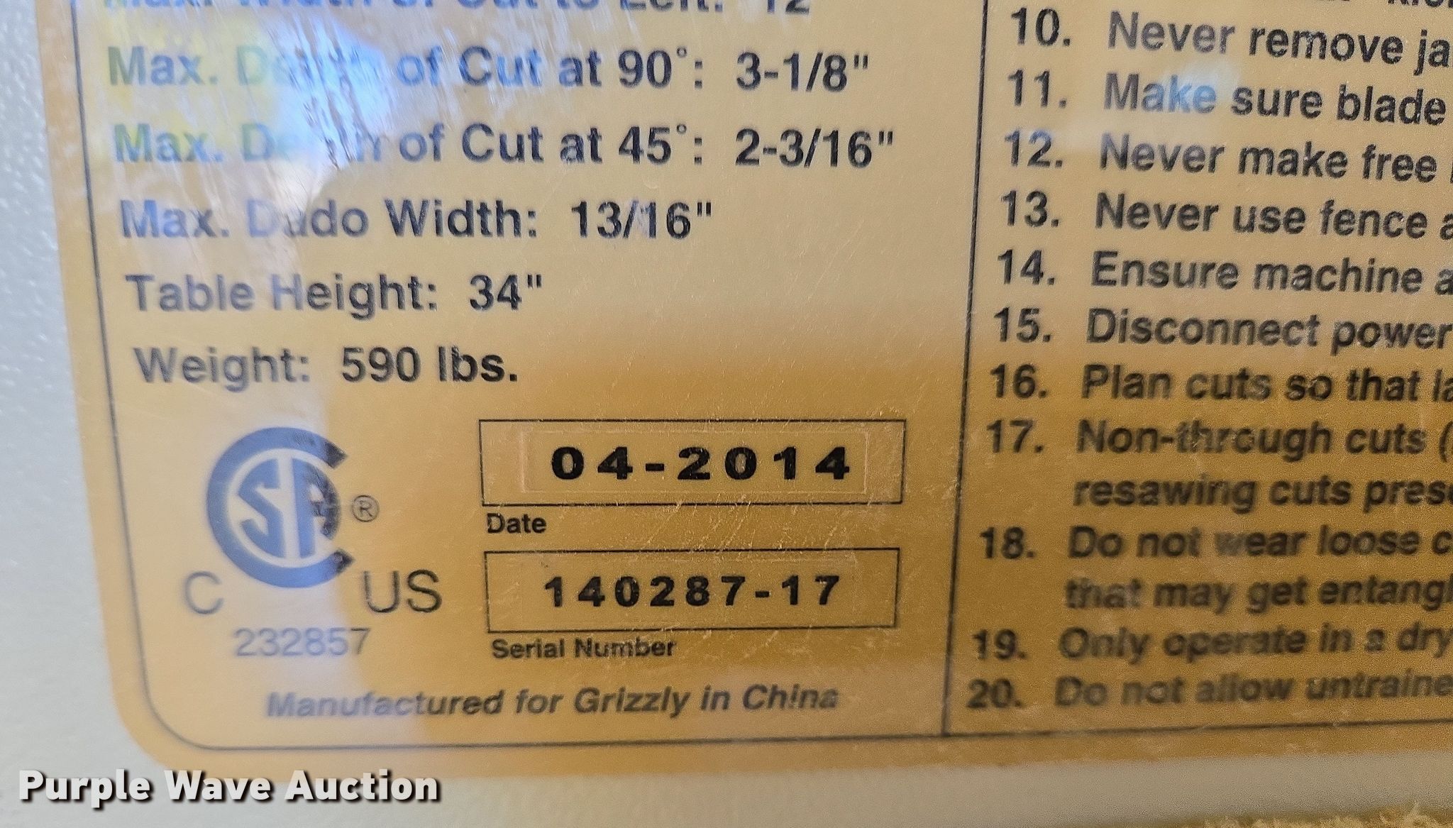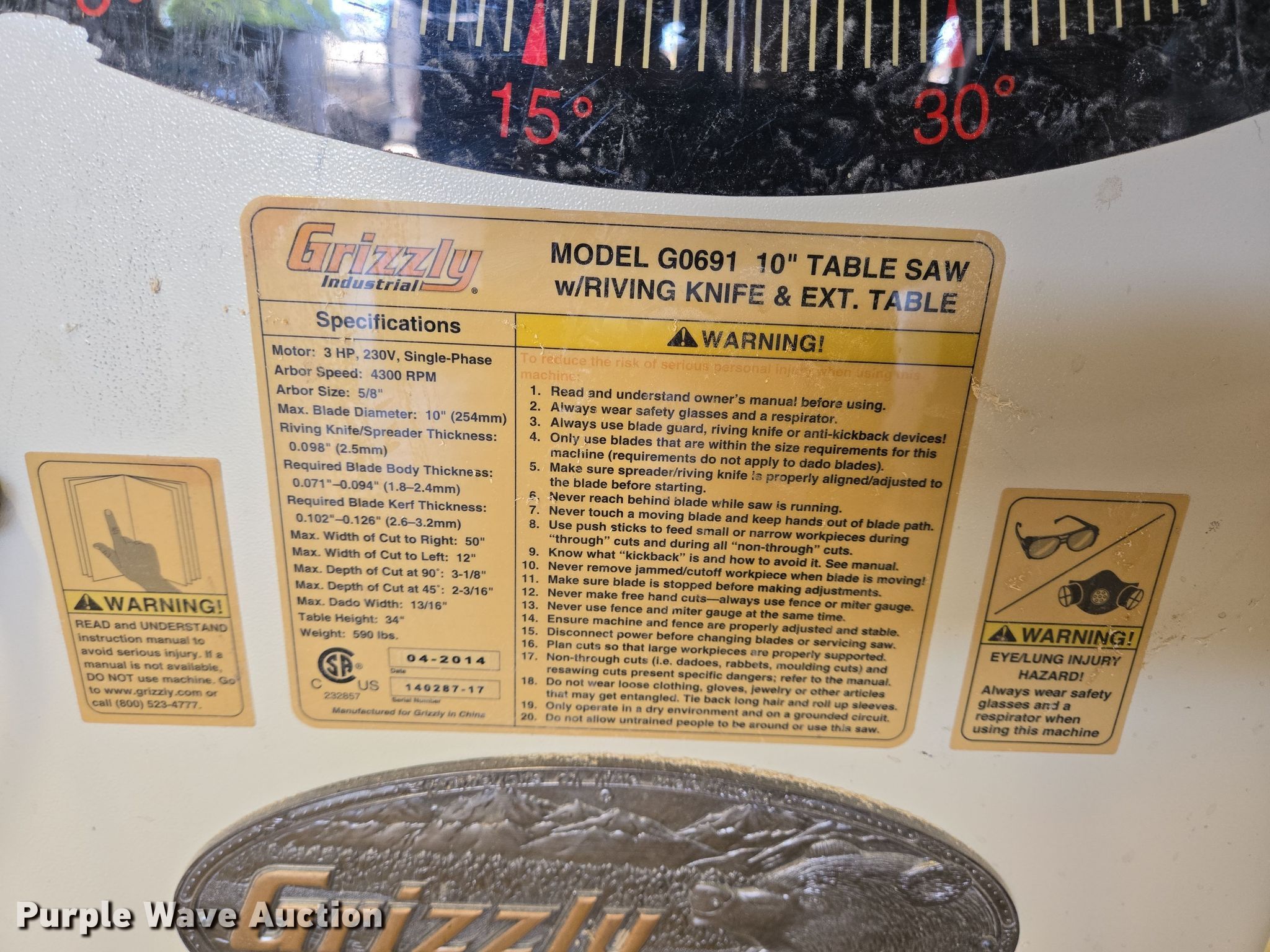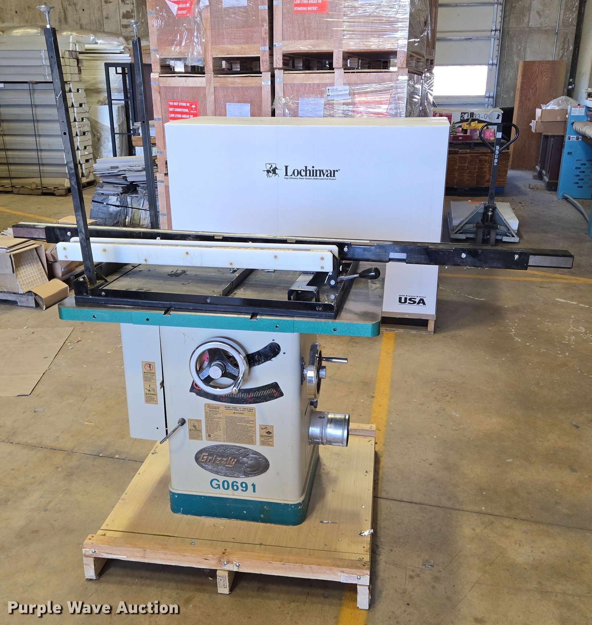 Purple Wave is selling a used Wood Saws in Texas. This item is a 2014 Grizzly G0691 table saw with the following: Lesson YCYN5692D-10, HP: 3, Volts: 230, Phase: Single