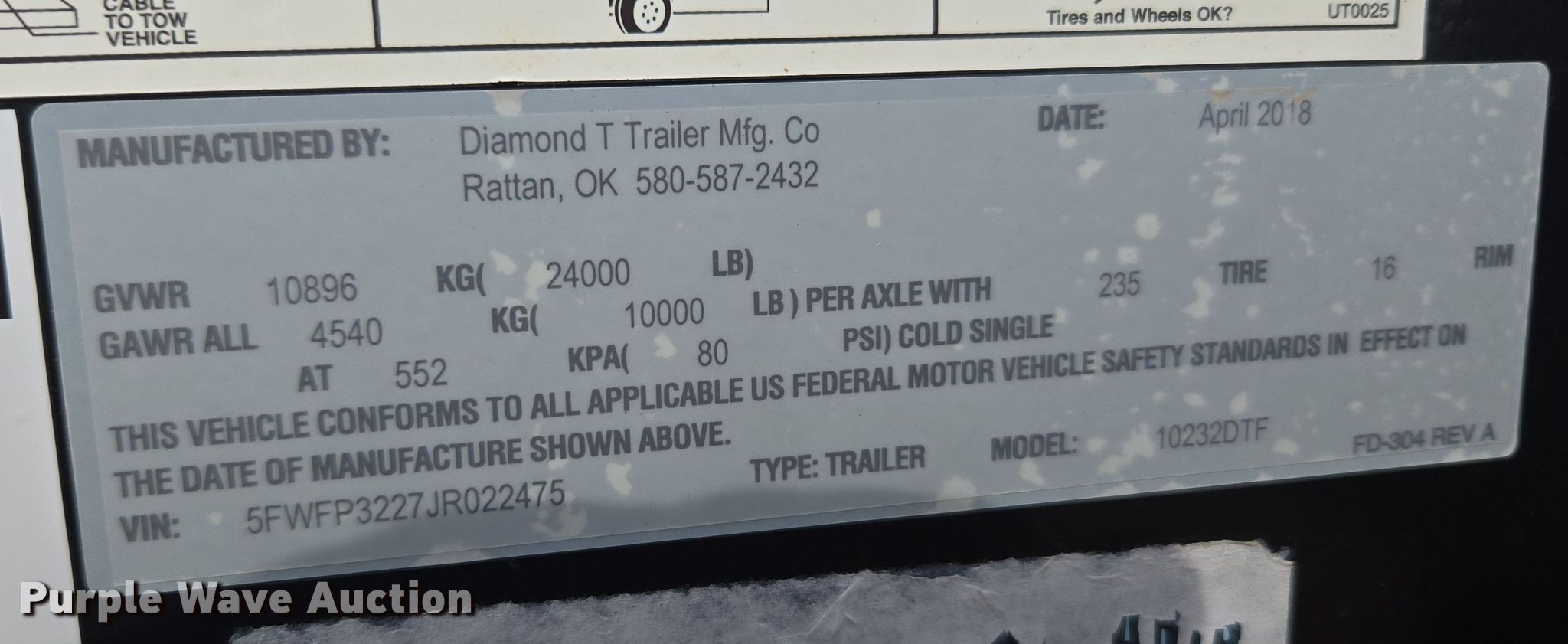 Purple Wave is selling a used Equip. Trailer in Colorado. This item is a 2018 Diamond T 10232DTF equipment trailer with the following: VIN: 5FWFP3227JR022475