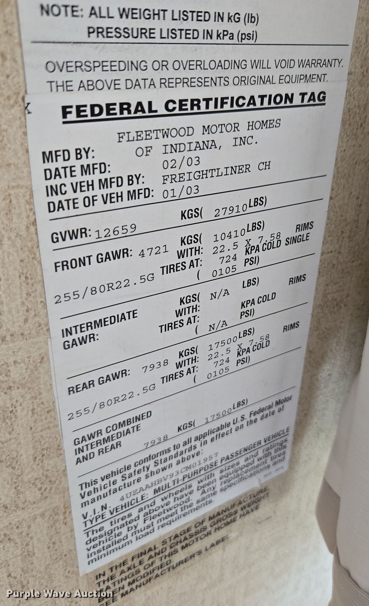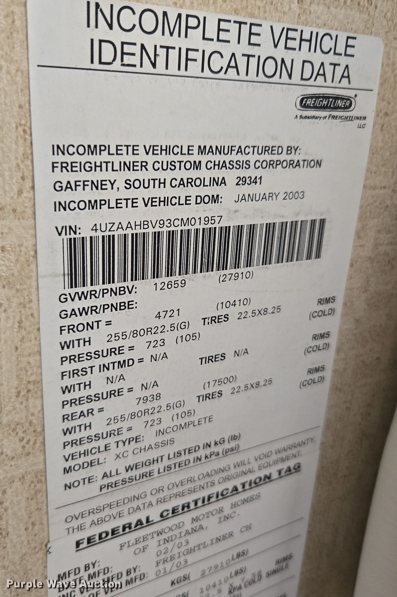Purple Wave is selling a used RV or Camper in Nebraska. This item is a 2003 Freightliner XC Chassis RV with the following: Miles: 1,079 on odometer, Actual mileage unknown, Camper length: 37', VIN: 4UZAAHBV93CM01957