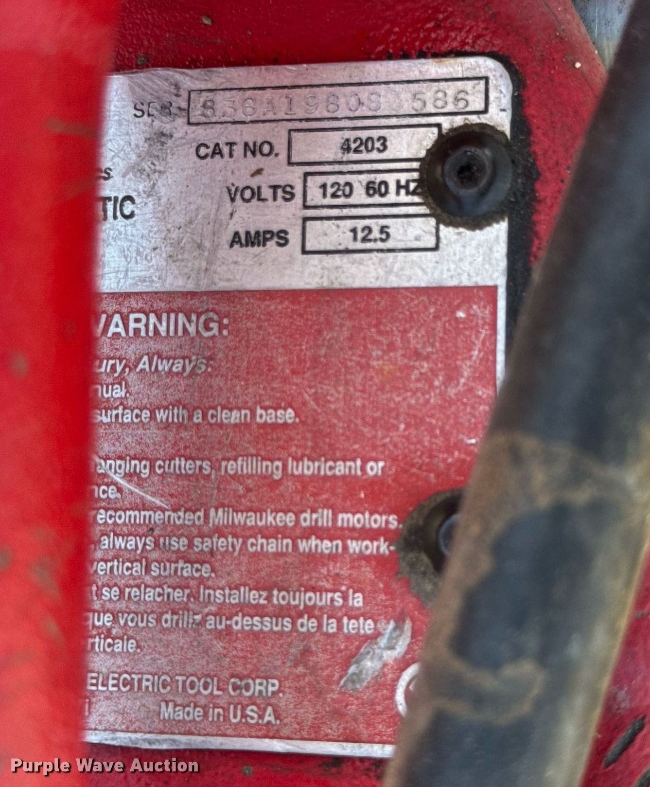 Purple Wave is selling a used Tools in Missouri. This item is a Milwaukee electromagnetic drill press with the following: Serial: 836A198083586, Case