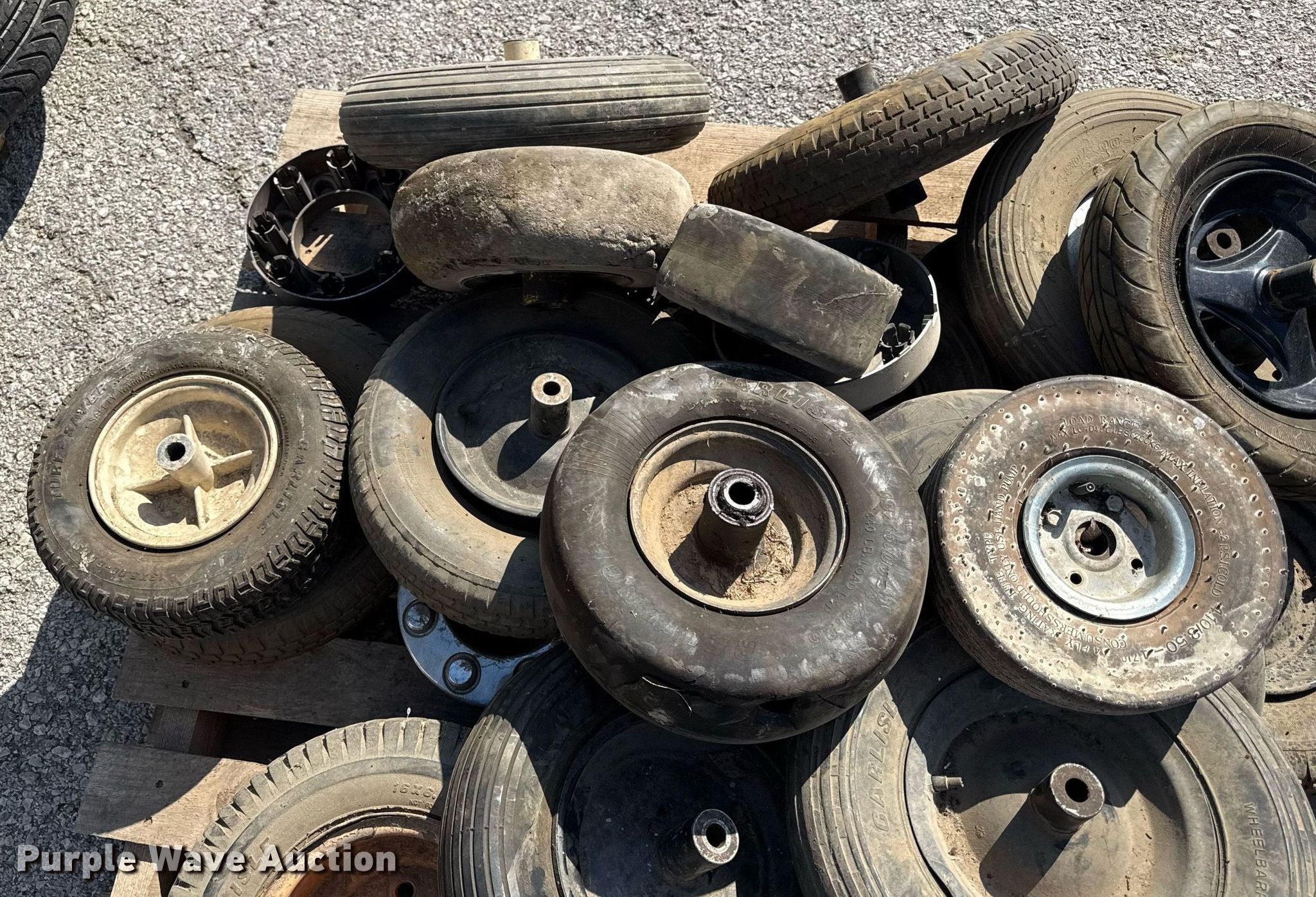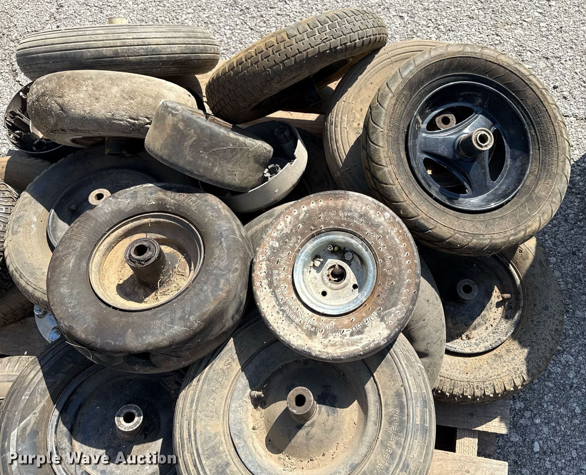 Purple Wave is selling a used Industrial Tires or Tracks in Kansas. This item is a (3) pallets of tires and wheels with the following: (3) pallets of tires and wheels. Landmasters Landscape Inc. Basehor, KS 66007