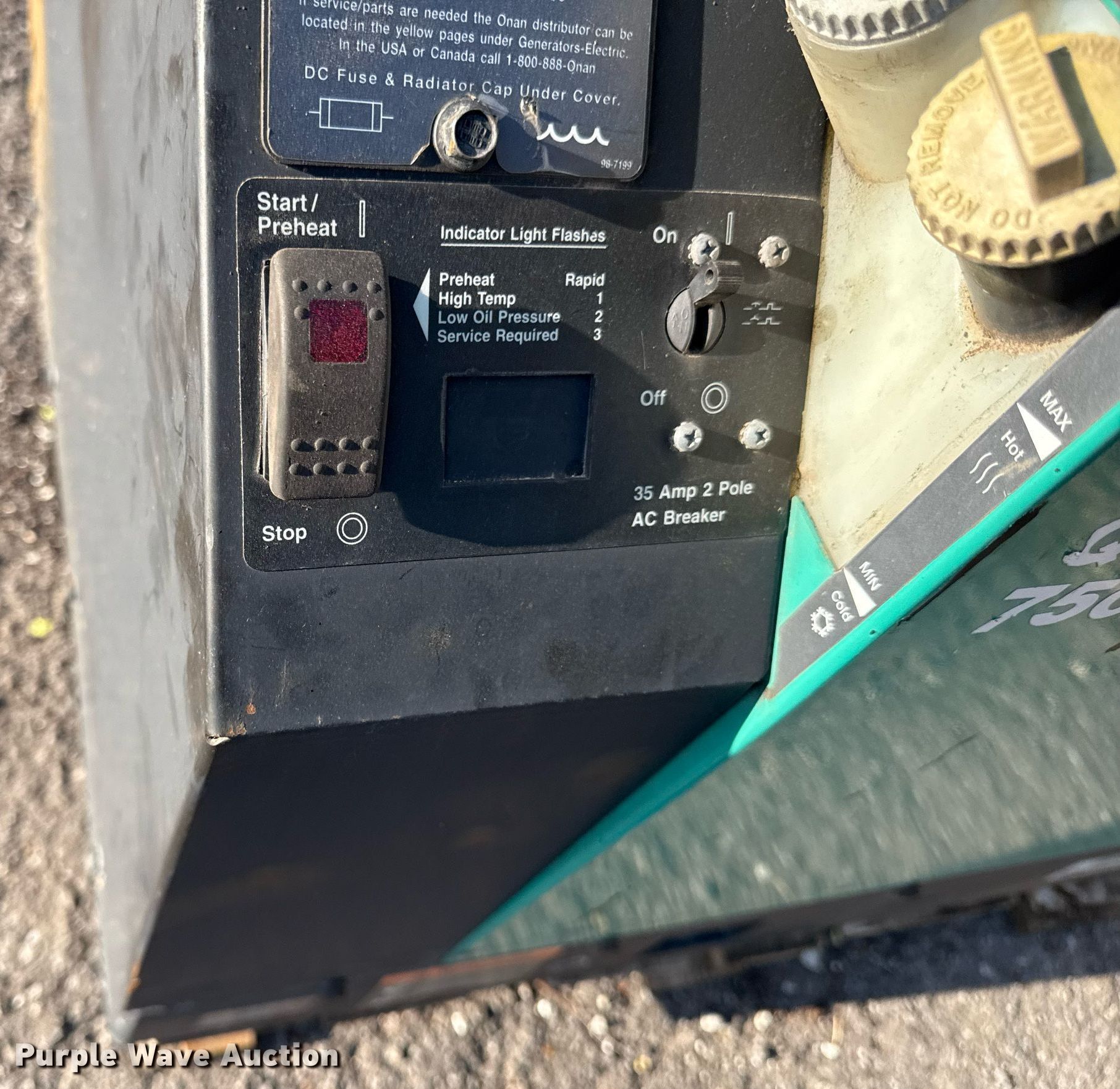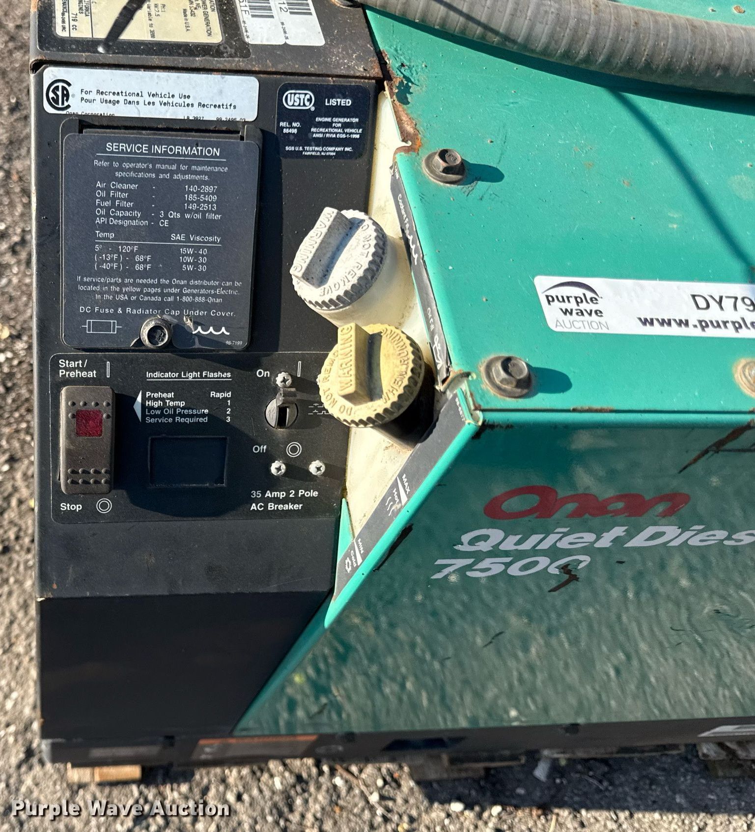 Onan Quiet Diesel 7500 generator. Hours: Unknown. Engine Displacement: 719 cc, Fuel type: Diesel. Electric Motor Volts: 120. Features Generator Watts: 7,500, kVA: 7.5, kW: 7.5, Phase: Single, Electric start. Schweizer Performance LLC. Edwardsville, KS 66111