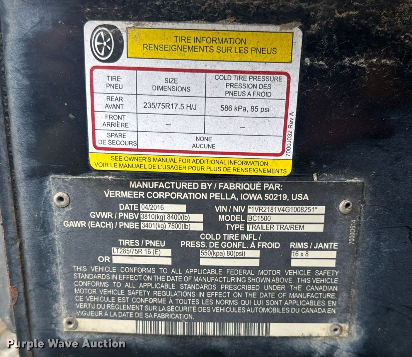 2016 Vermeer BC1500 wood chipper. Hours: 1,975 on meter, VIN: 1VH2181V4G1008251. Engine Cummins, Cylinders: 4, Fuel type: Diesel. Features Throat opening: 15" x 15", Auto feed. Trailer 17' L x 84" W, Hitch: Pintle, Brakes: Electric, Axles: Single, Tire size: PT285/75R16, GVWR: 8,400 lbs. This is worksite support equipment and will not come with a title. Transfer of ownership documentation will be a bill of sale. All Roads Equipment. Garner, NC 27529