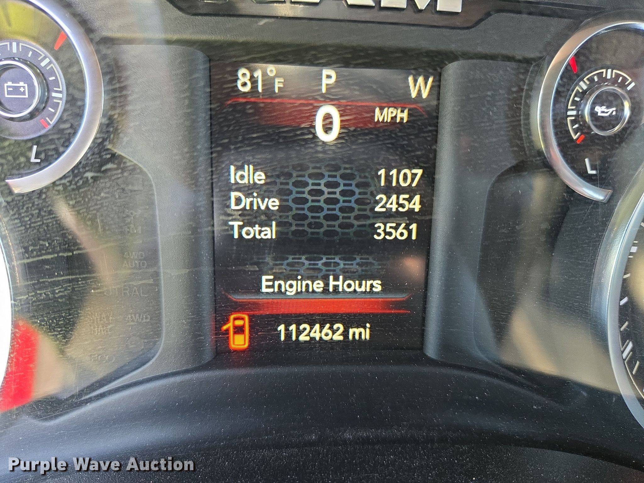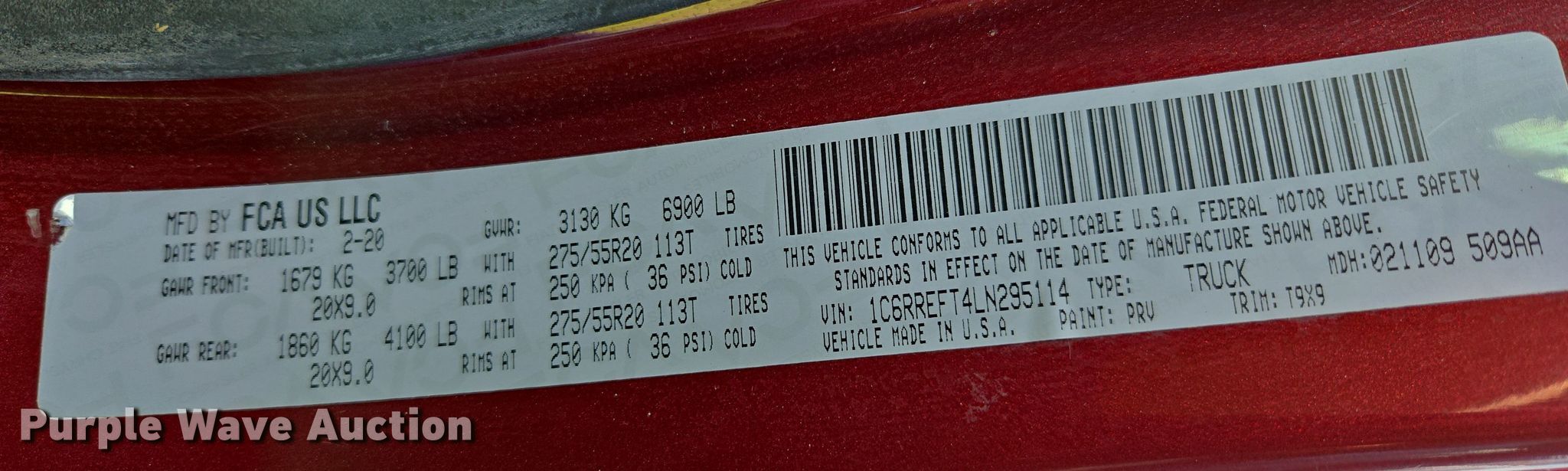 2020 Dodge Ram 1500 Crew Cab pickup truck. Miles: 112,462 on odometer, Engine hours: 3,561 on meter, VIN: 1C6RREFT4LN295114. Engine Displacement: 5.7L V8 OHV, Cylinders: 8, Fuel type: Gas. Transmission Automatic. Interior AC, Heat, Seat: Power driver, Power windows, Power locks, Cruise control, Backup camera. Features Hitch: Gooseneck. Tires Size: 275/55R20. Notes Dash warning indicator: Check engine, TPMS. Texas title. Title has a lien that will be released following the close of the auction. Title distribution may be delayed up to 45 days from verification of funds. Hubbard, TX 76648