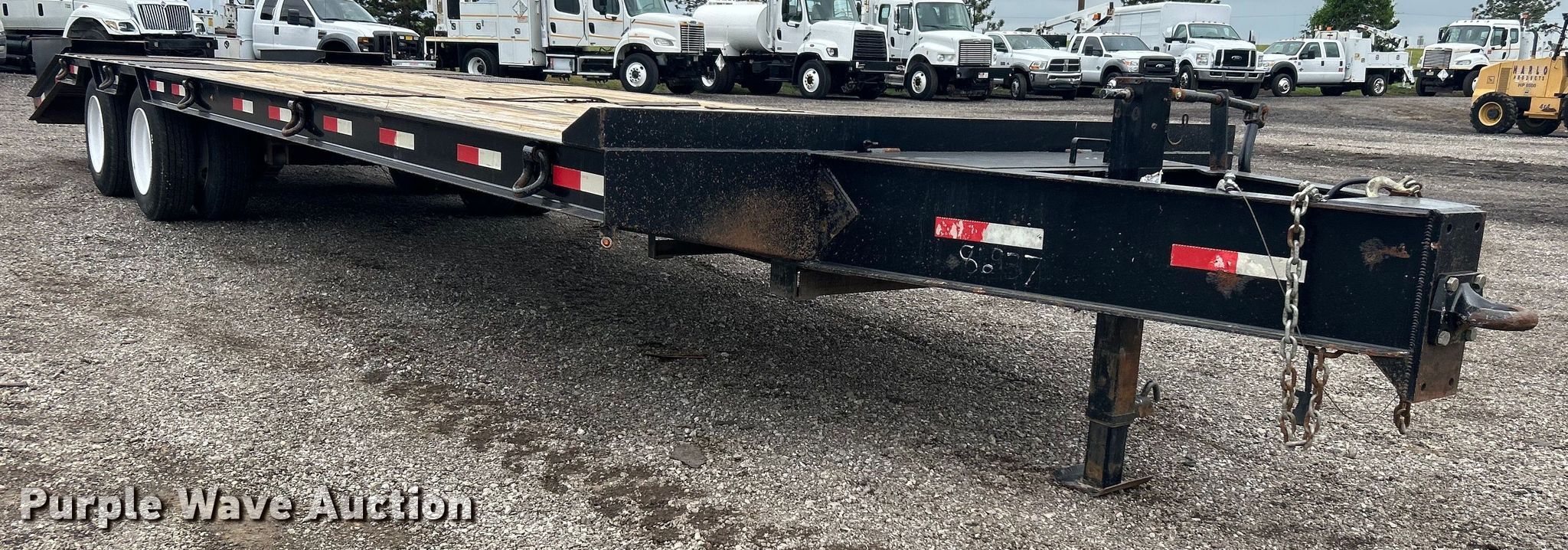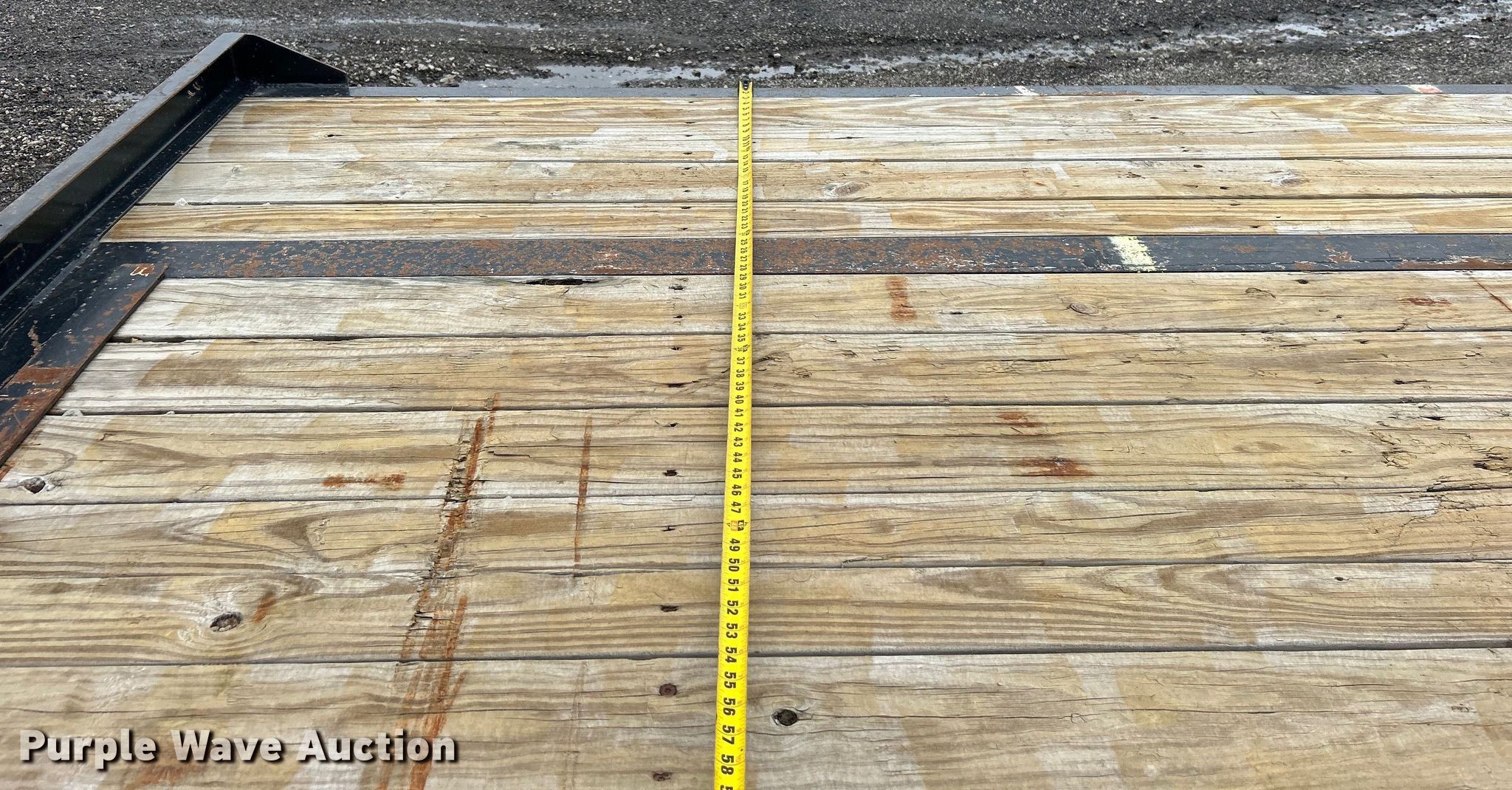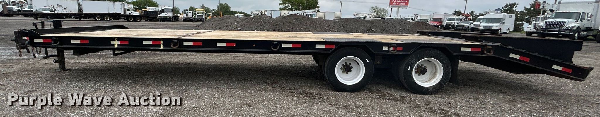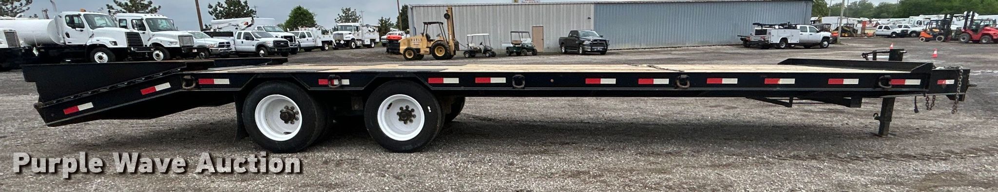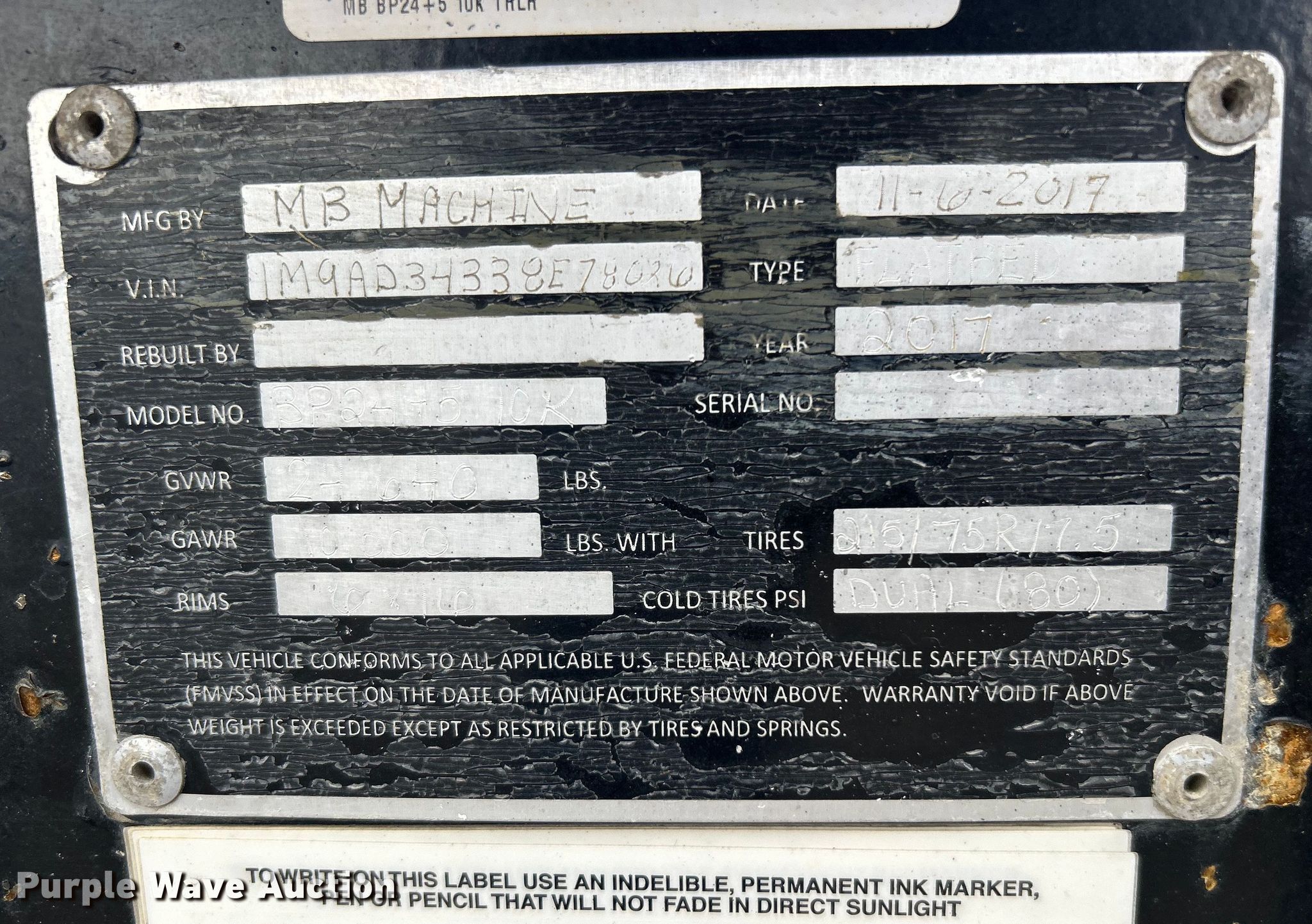 2017 MB Machine equipment trailer. VIN: 1M9AD34338E78026. Dimensions Overall: 34' L x 9" W, Deck: 24' L x 94" W, Tail length: 5', Ramps: Manual Length: 5'. Features Deck type: Wood. Chassis Hitch: Pintle, Landing gear: Single, Suspension: Spring, Brakes: Electric, Axles: Tandem, GVWR: 24,640 lbs, GAWR: 10,000 lbs. Tires Steel wheels, Size: 215/75R17.5. Transfer of ownership documentation will be a bill of sale. Collinsville, OK 74021