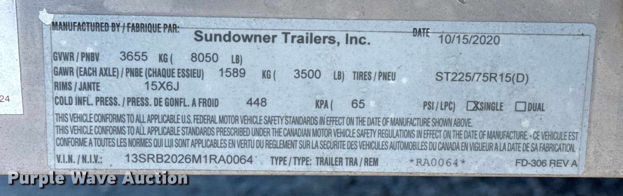 Purple Wave is selling a used RV or Camper in Oklahoma. This item is a 2021 Sundowner Trailers camper with the following: Camper length: 20', Overall length: 24', VIN: 13SRB2026M1RA0064