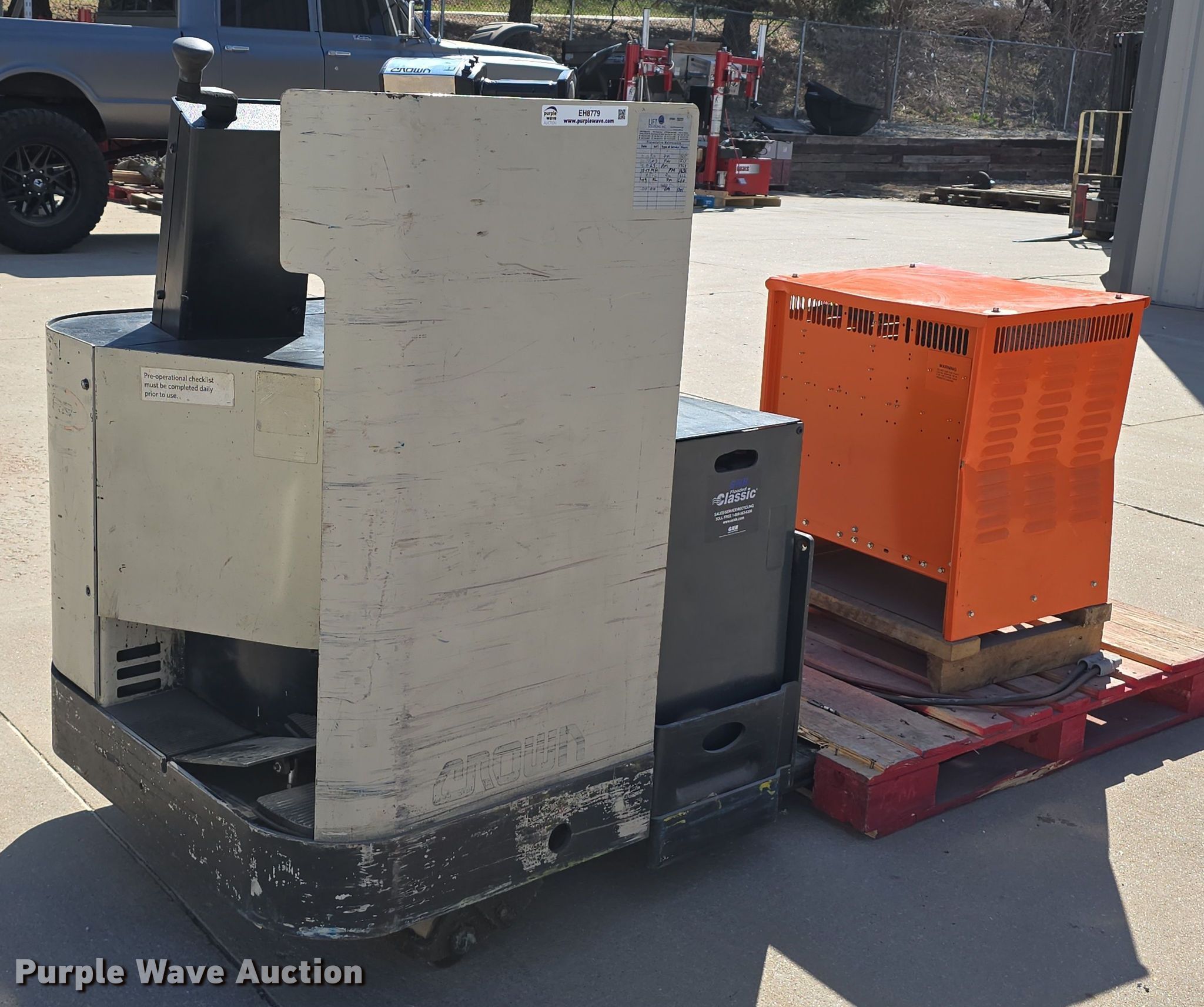Crown PR3020-60 pallet jack. Hours: 1,704 on meter, Serial: 6A223498. Electric Motor Volts: 24, Phase: Three, Charger: Three phase. Transmission Hydrostatic. Features Maximum lift capacity: 6,000 lbs, Maximum lift height: 9", Fork length: 48", Ferrocharger Auto-Charger II Serial: 93C1319, Volts: 24. Tires Solid. Nebraska Commercial Equipment. Papillion, NE 68046