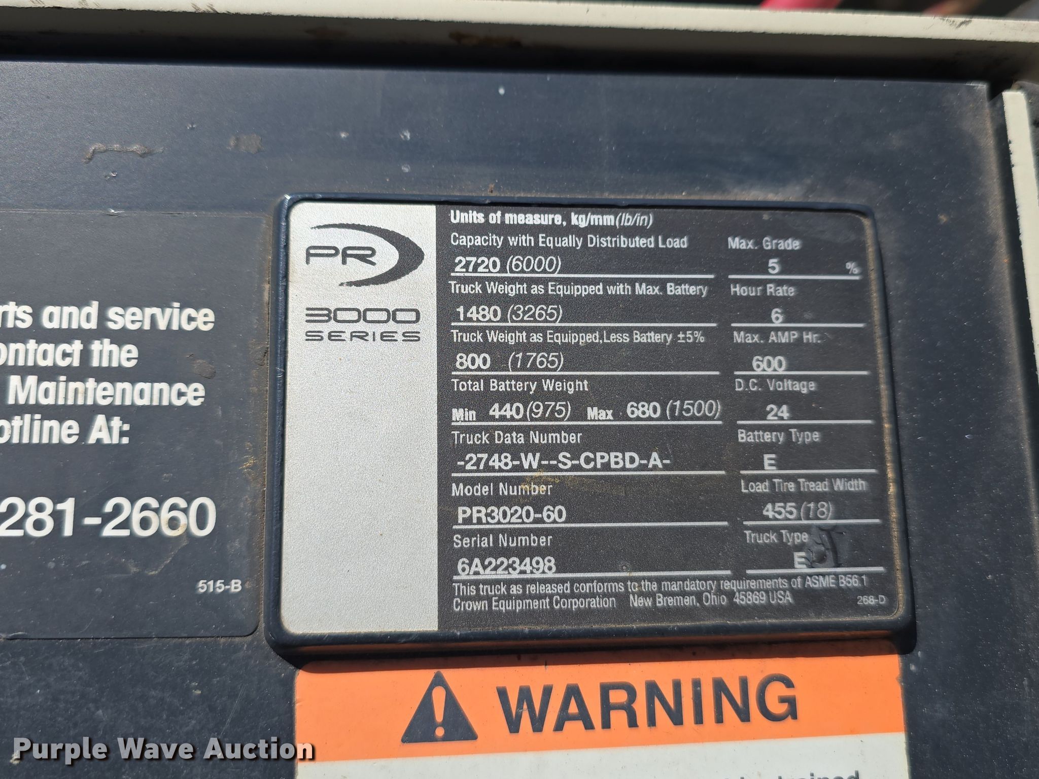 Purple Wave is selling a used Warehouse Forklift in Nebraska. This item is a Crown PR3020-60 pallet jack with the following: Hours: 1,704 on meter, Serial: 6A223498