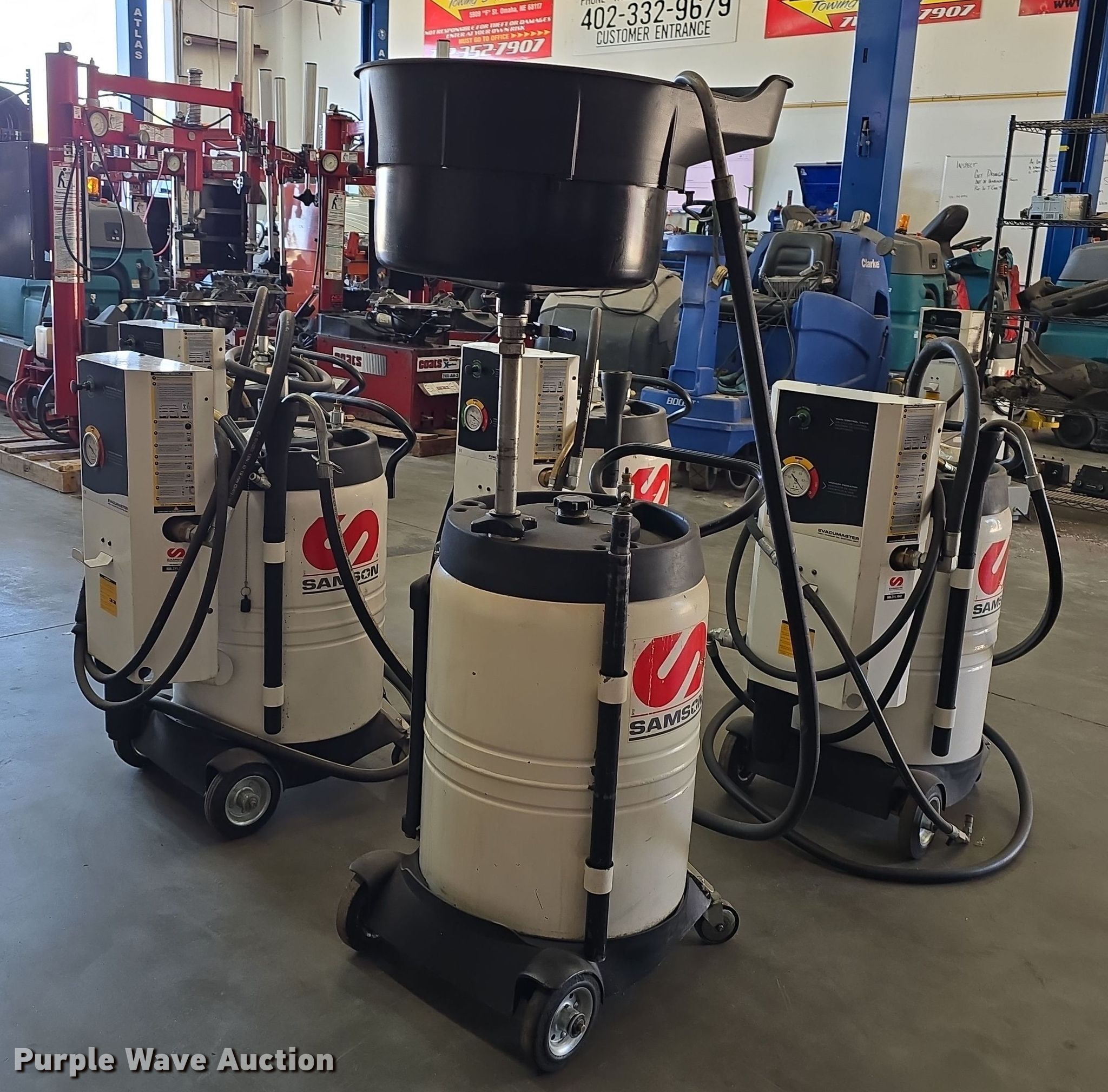 (4) Samson Evacumaster oil suction units. Capacity: 26 gallons, Samson oil drain barrel Capacity: 26 gallons. Notes Unknown operating condition. Nebraska Commercial Equipment. Papillion, NE 68046