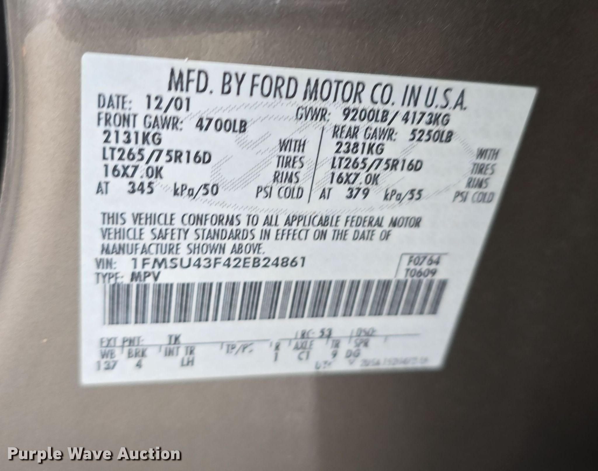 Purple Wave is selling a used Passenger Vehicle in Iowa. This item is a 2002 Ford Excursion Limited SUV with the following: Miles: 235,435 on odometer, VIN: 1FMSU43F42EB24861