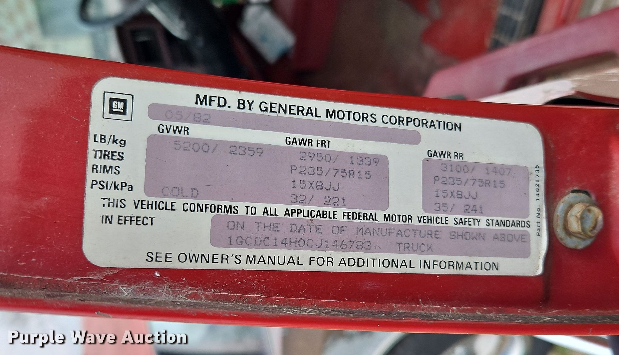 1982 Chevrolet Silverado C10 pickup truck. Miles: 43,092 on odometer, VIN: 1GCDC14H0CJ146783. Engine Displacement: 5.0L V8 OHV, Cylinders: 8, Fuel type: Gas. Transmission Automatic. Interior AC, Heat, Cruise control. Tires Size: 235/75R15. Notes Dead battery, Possible brake issues. Kansas title. Title distribution may be delayed up to 14 days from verification of funds. Girard, KS 66743