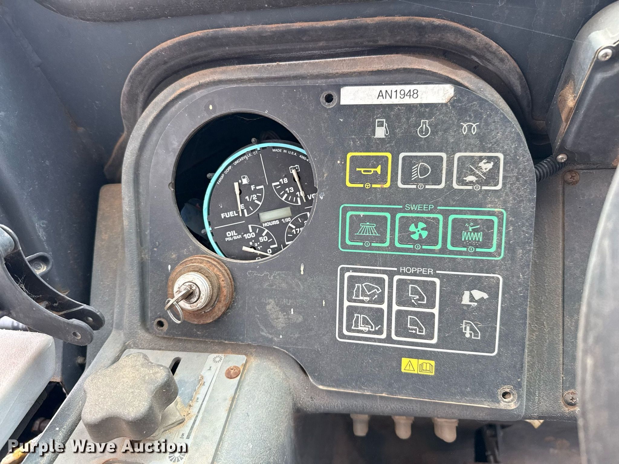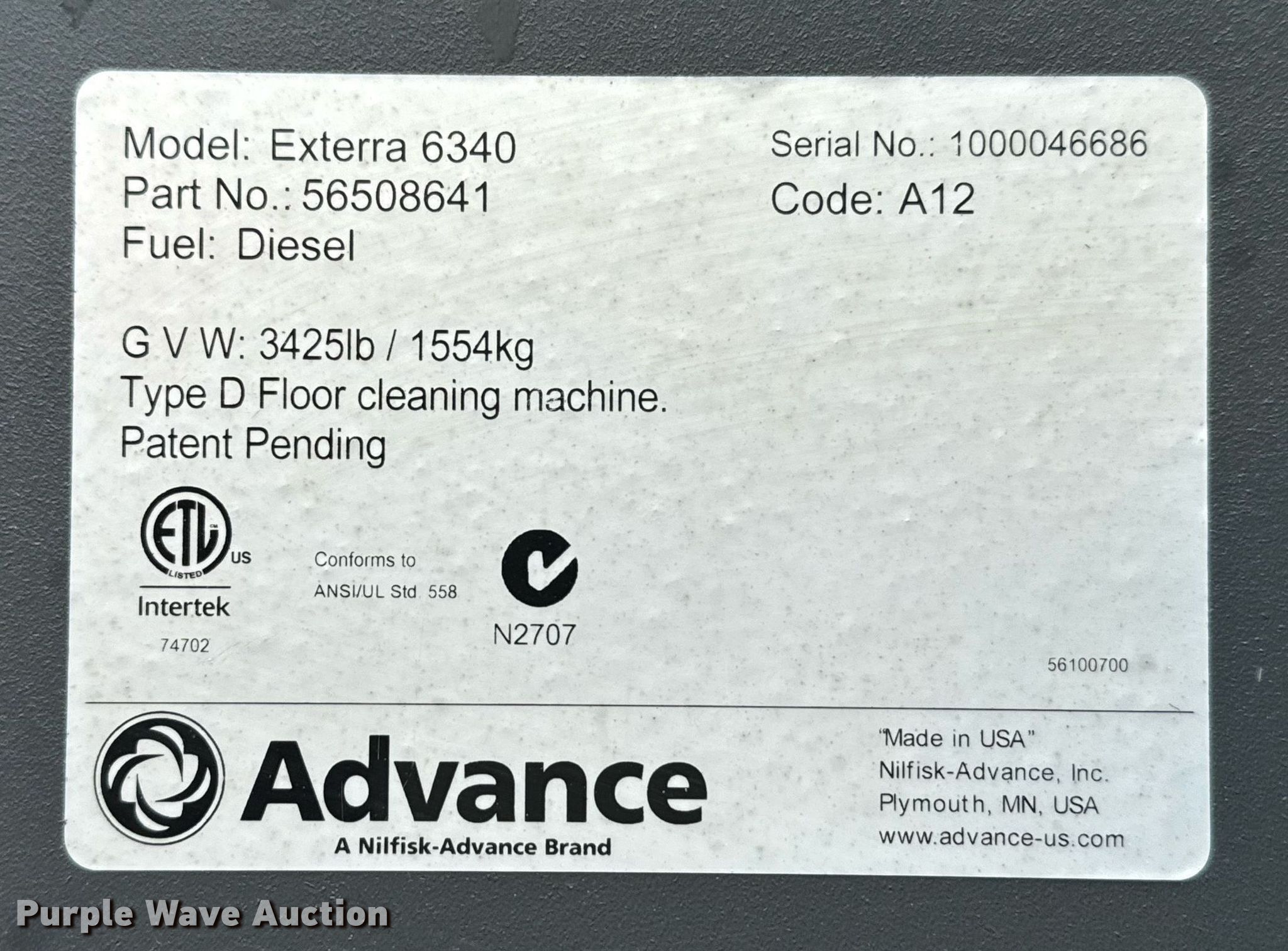 Purple Wave is selling a used Sweeper in Texas. This item is a Advance Exterra 6340 street sweeper with the following: Hours: Unknown, Serial: 1000046686, Unit #: ET175