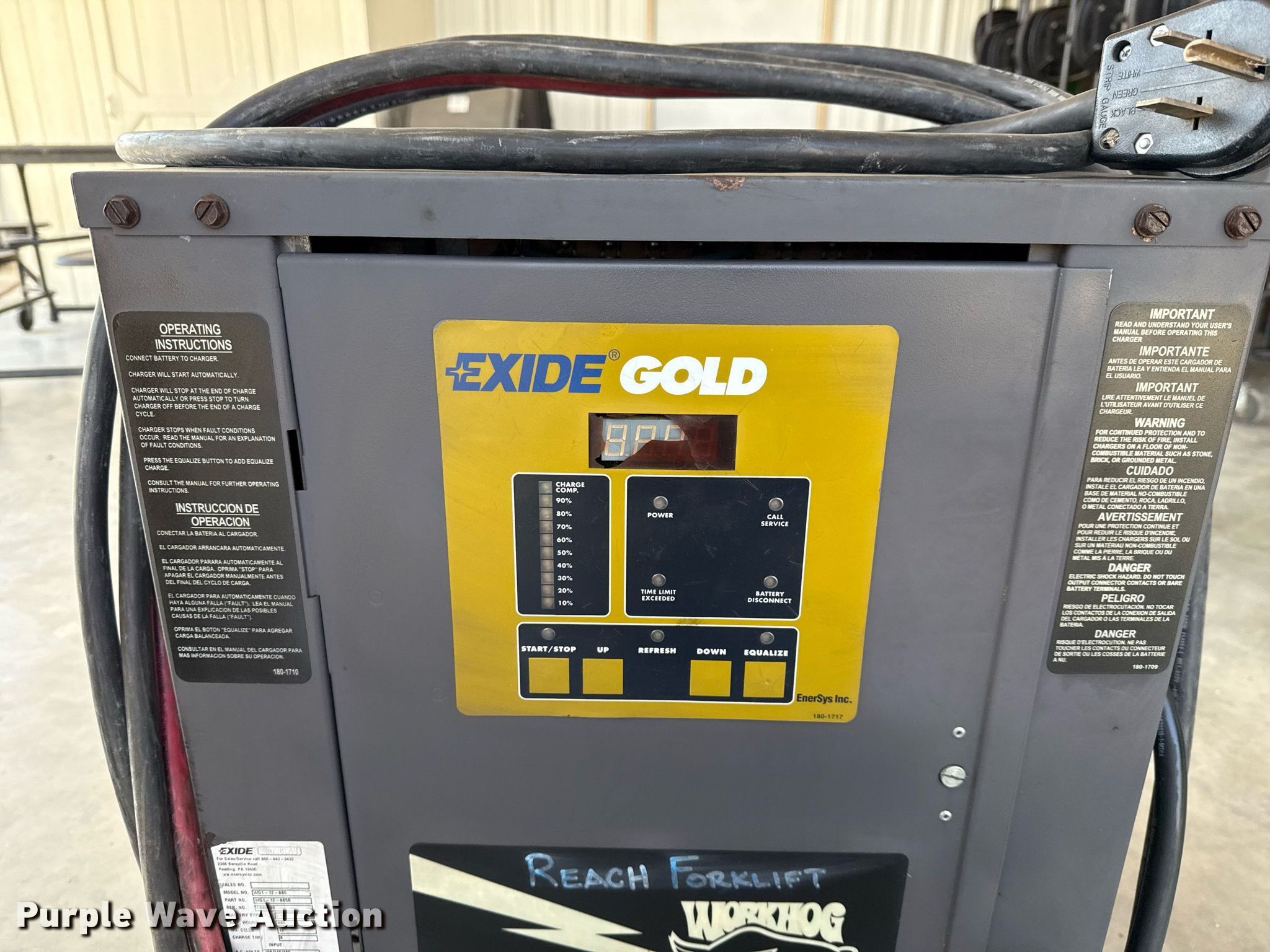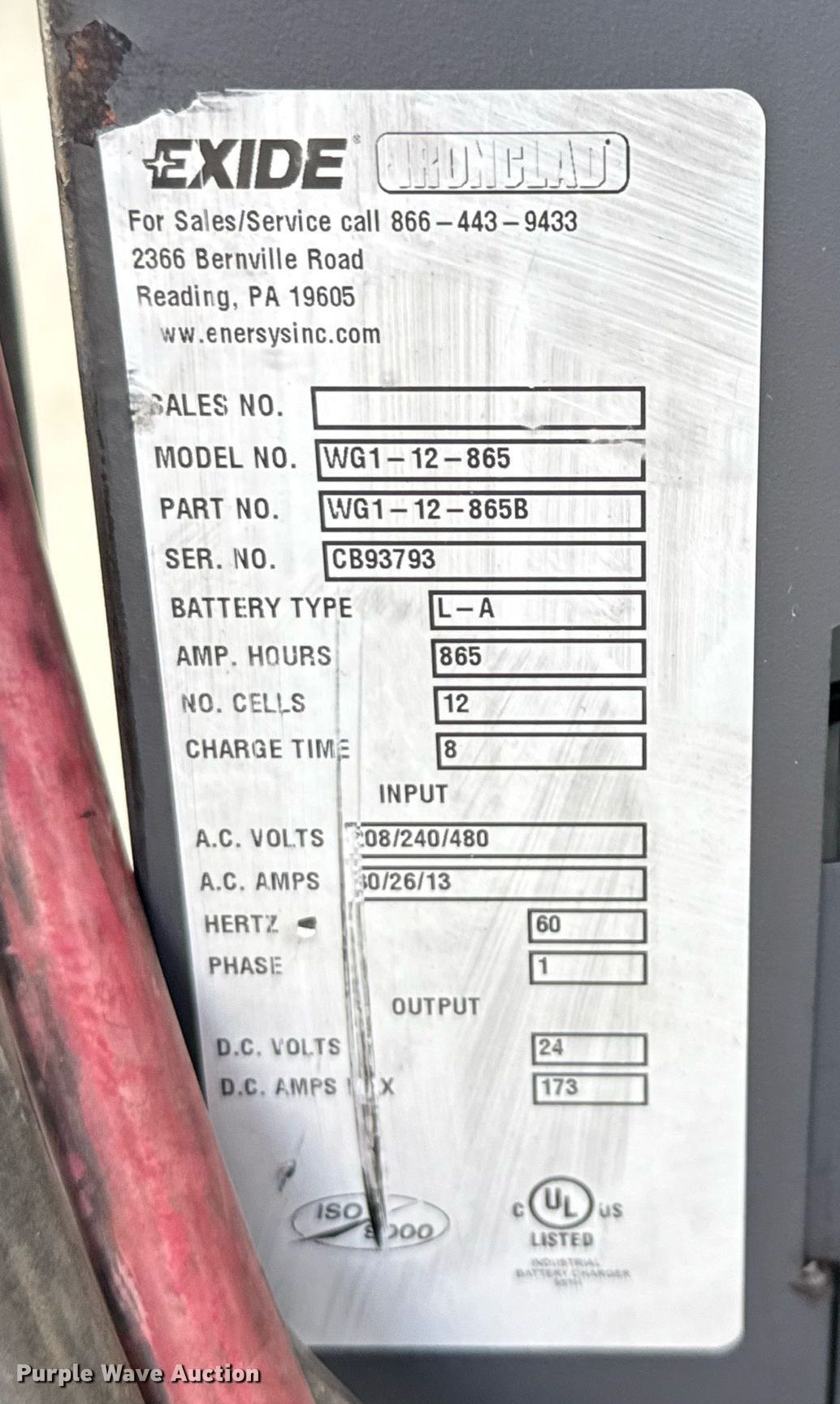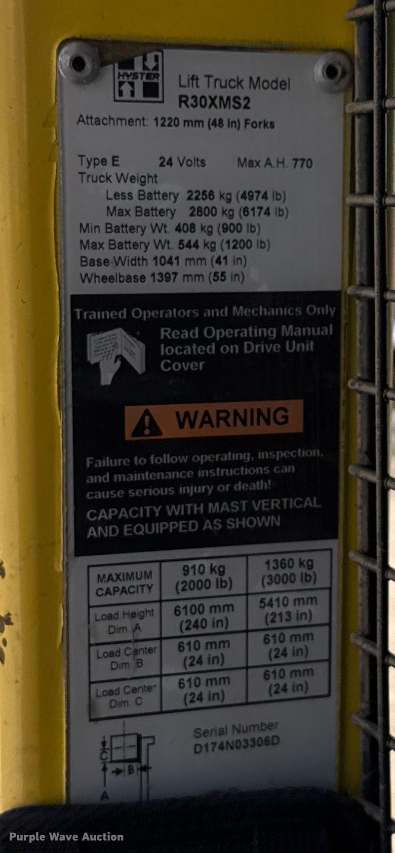 2006 Hyster R30XMS2 order picker. Hours: 2,811 on meter, Serial: D174N03306D. Electric Motor Exide WG1-12-865 Serial: CB93793, Volts: 24, Phase: Single, Charger: Single phase Volts: 208/240/480. Features Maximum lift capacity: 3,000 lbs, Maximum lift height: 240", Mast stages: 3, Fork length: 48". Tires Solid. Seminole, TX 79360