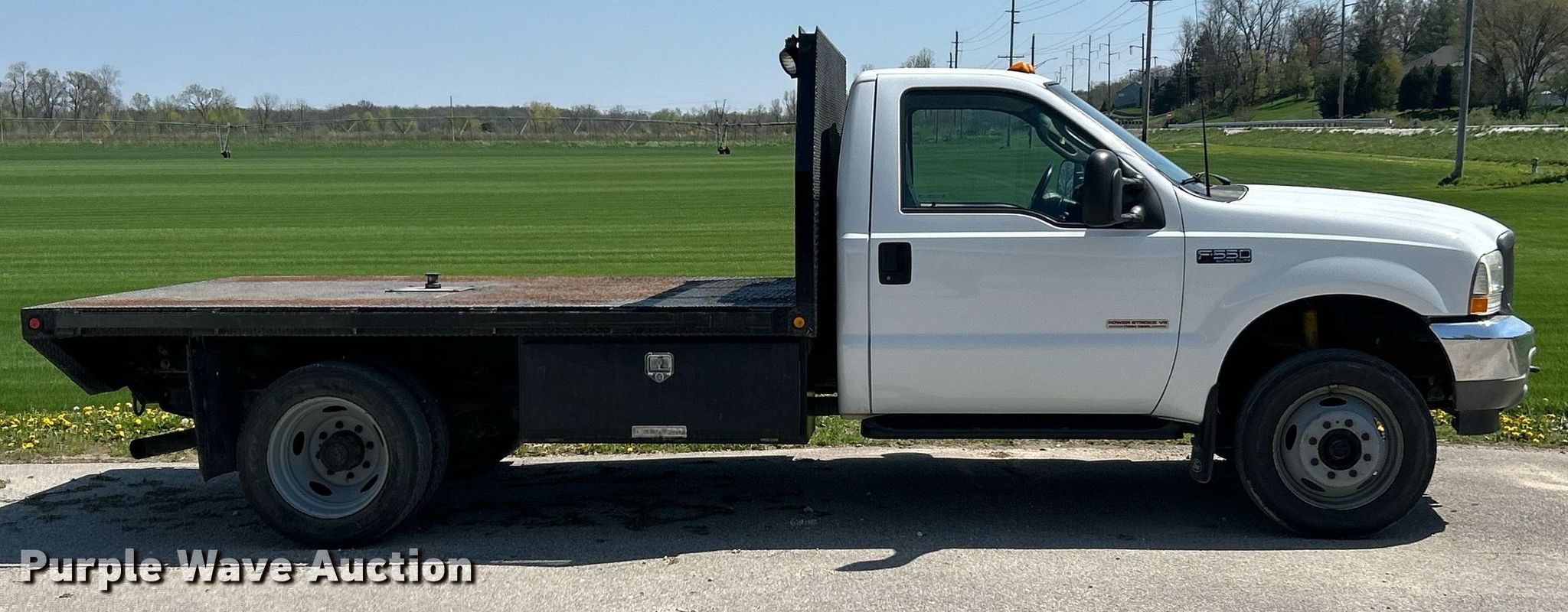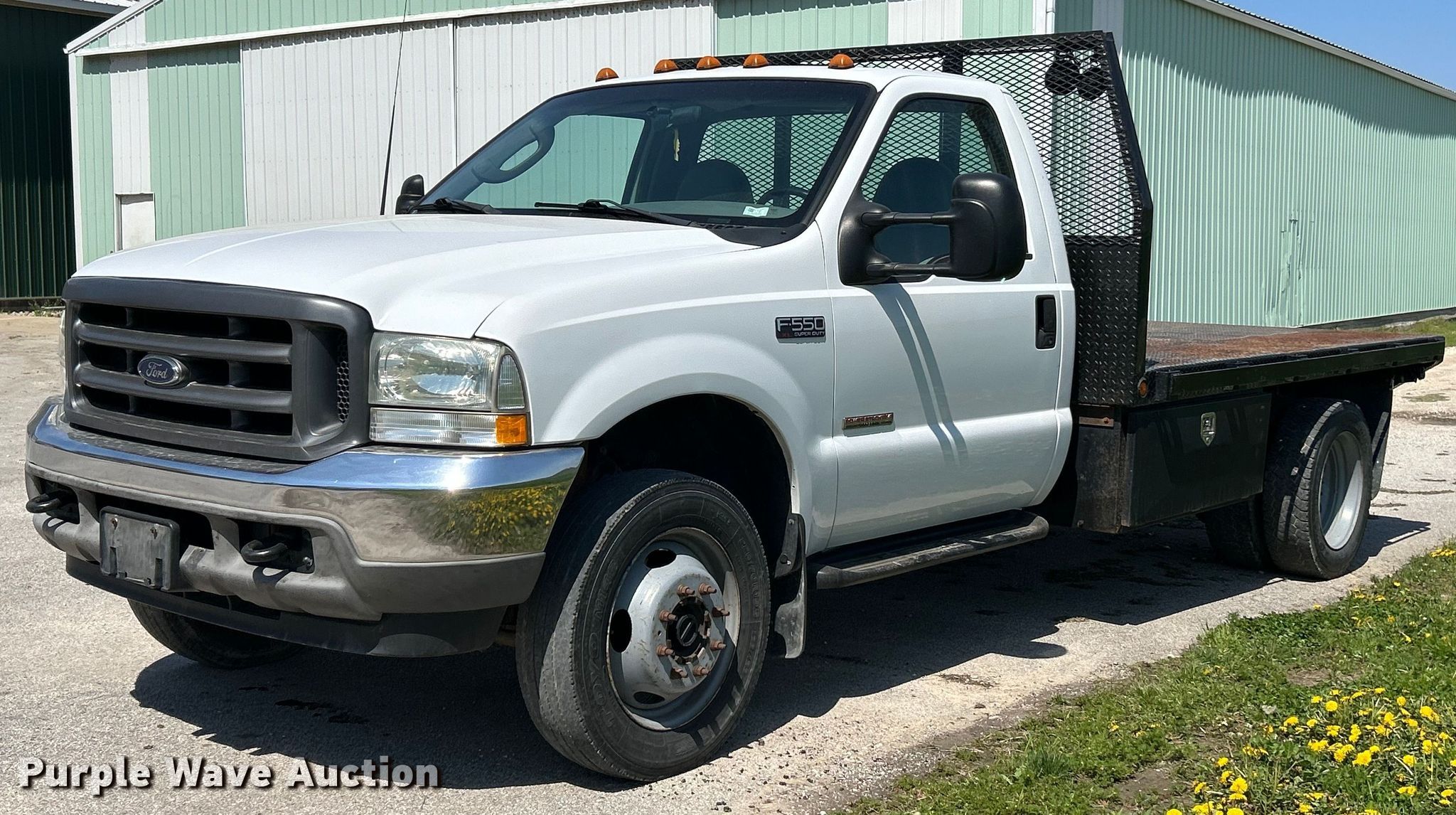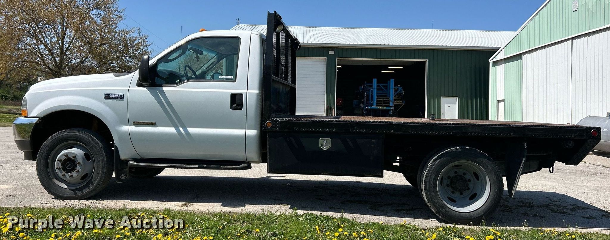This 2003 Ford F550 Super Duty XL flatbed truck will sell to the highest bidder regardless of price.