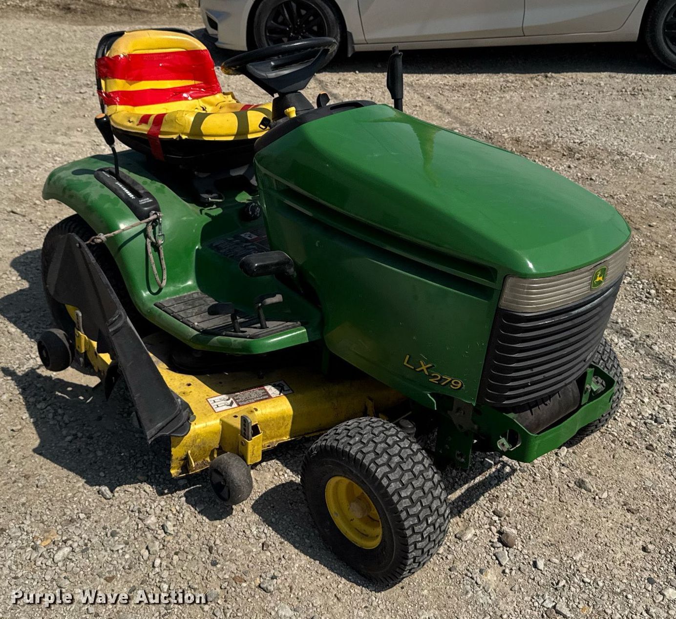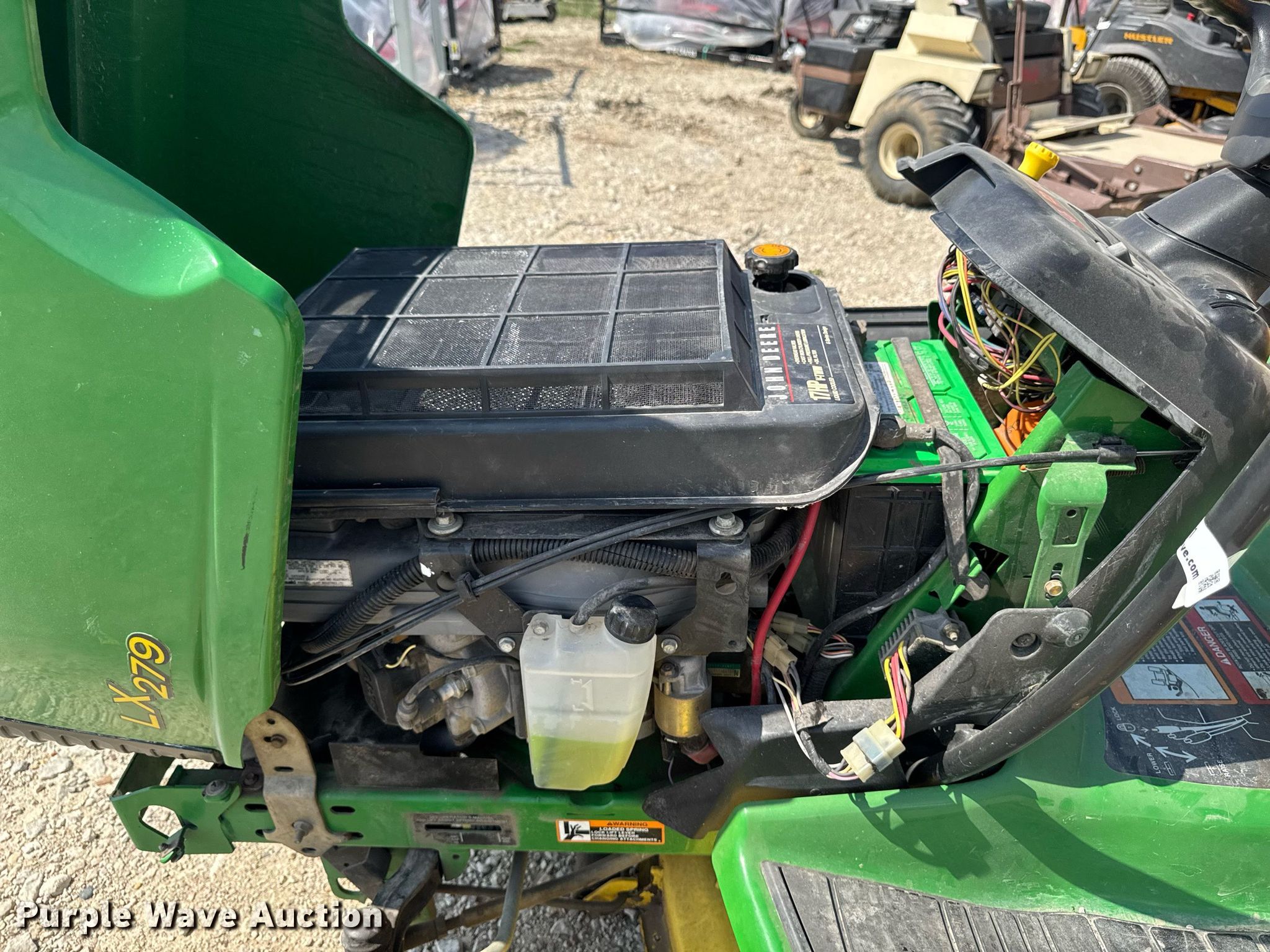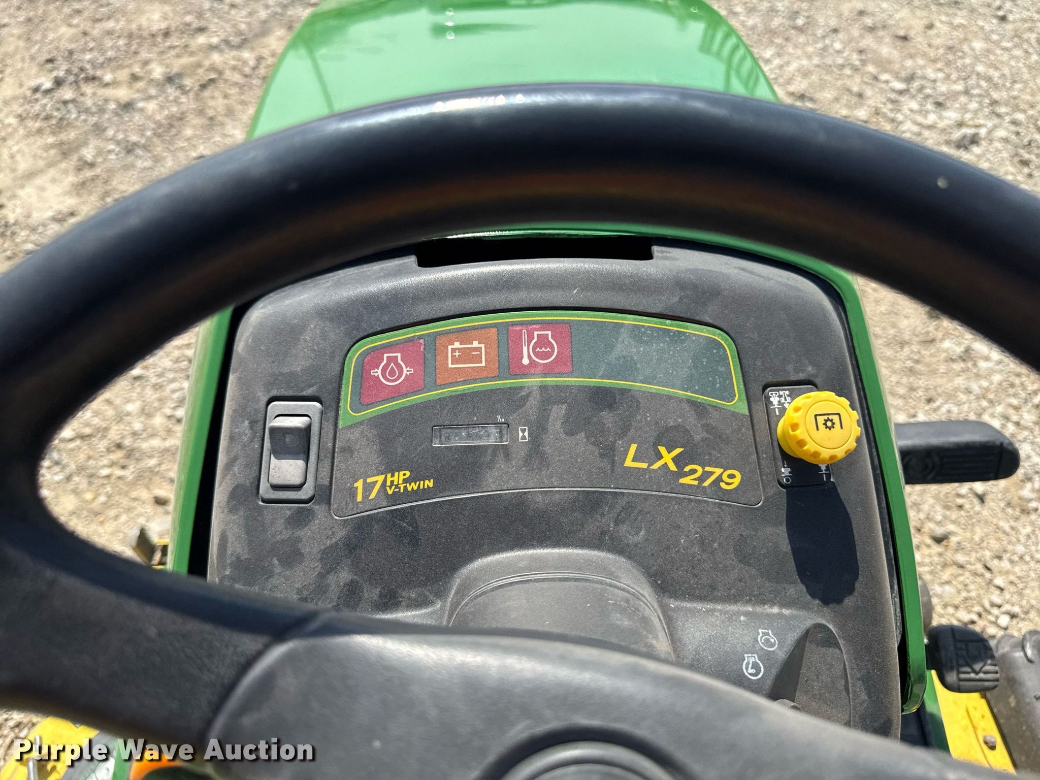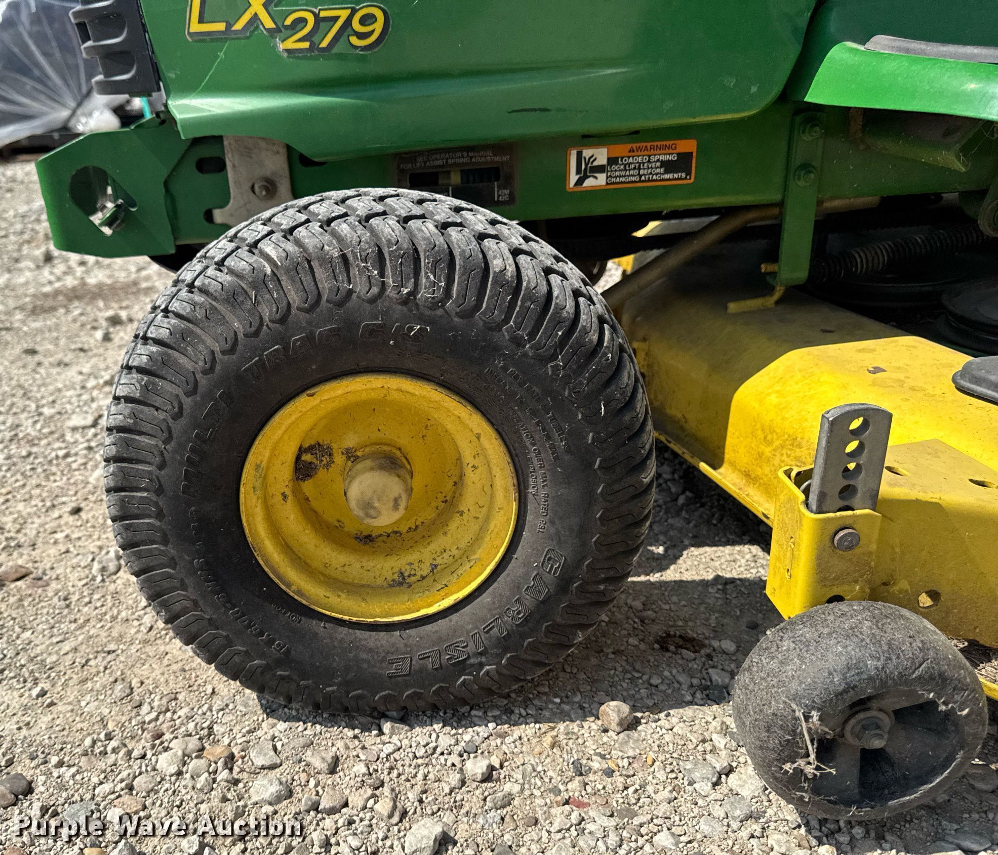 John Deere LX279 lawn mower. Hours: 553 on meter, Cutting width: 48", Serial: M0L279B072243. Engine Kawasaki, Displacement: 737 cc, Cylinders: 2, Fuel type: Gas, HP: 17. Transmission Hydrostatic. Features Rear drawbar. Tires Front: 15x6-6, Rear: 20x10-8. Cannon Sales & Service. Mount Ayr, IA 50854