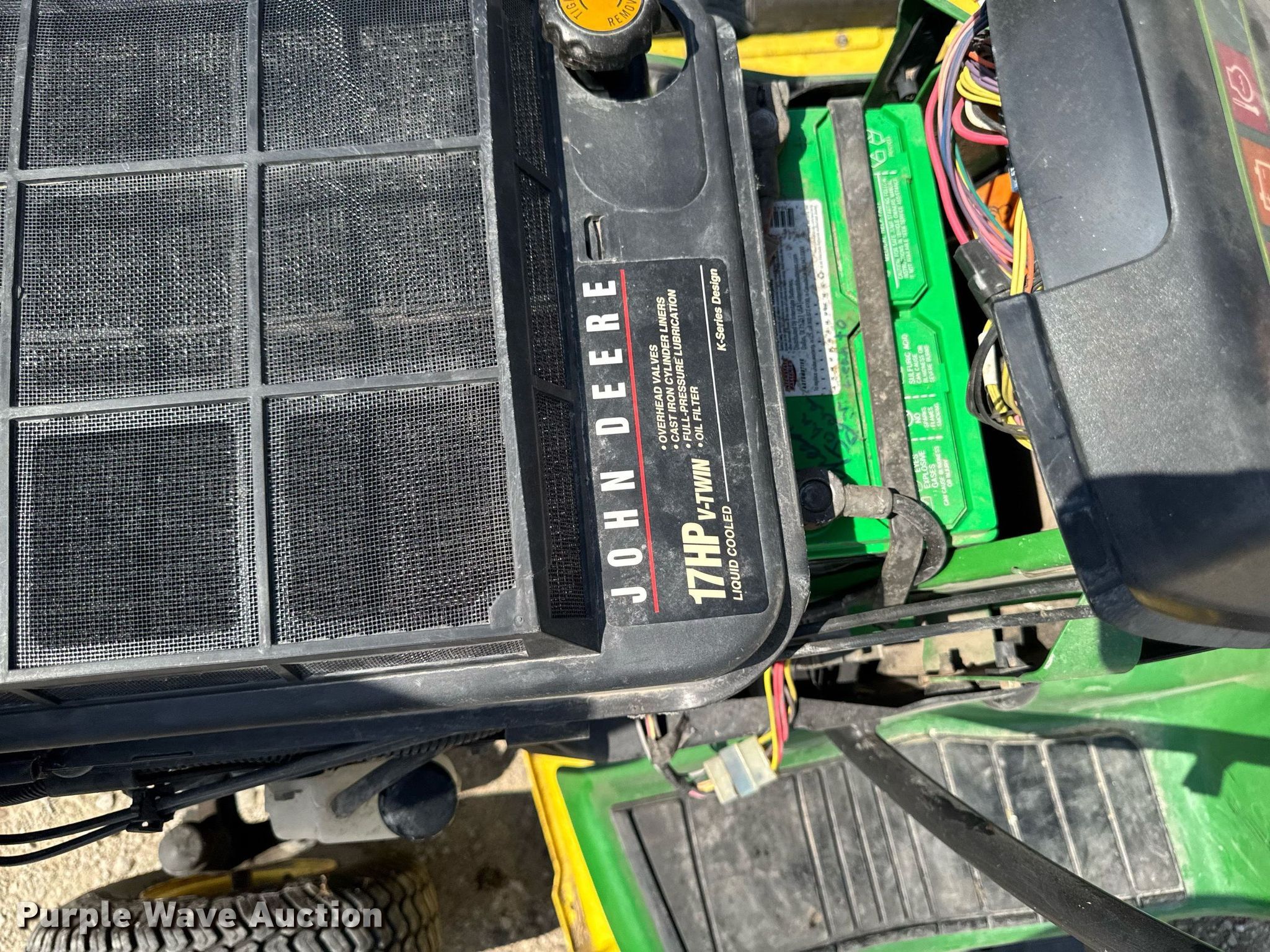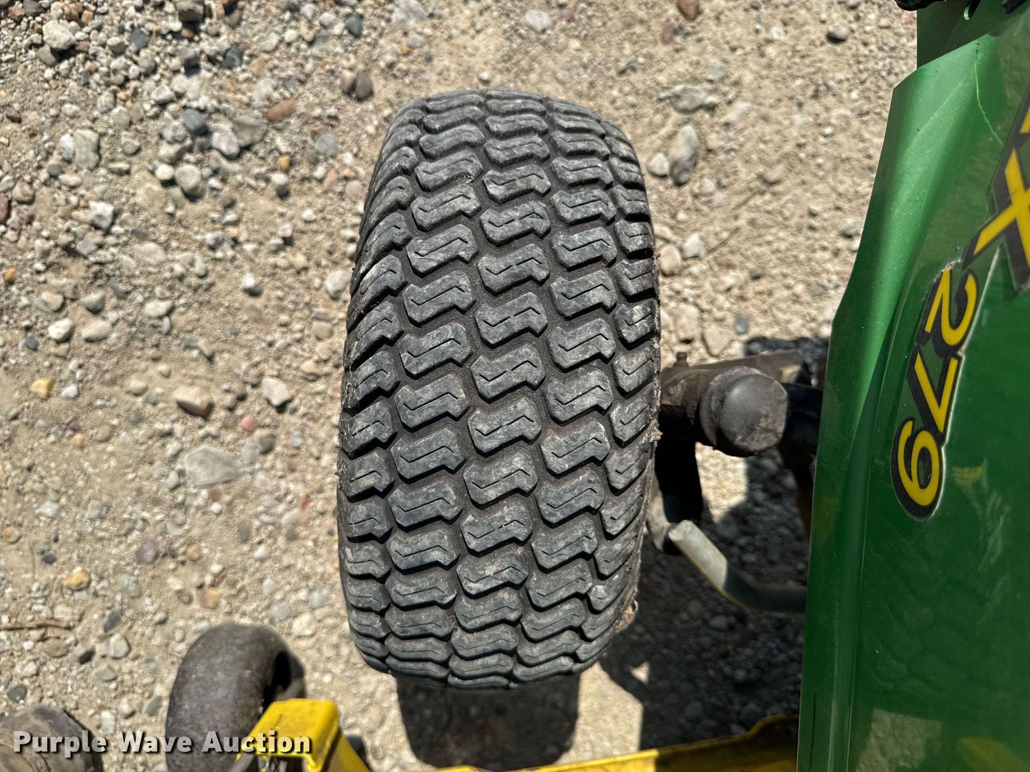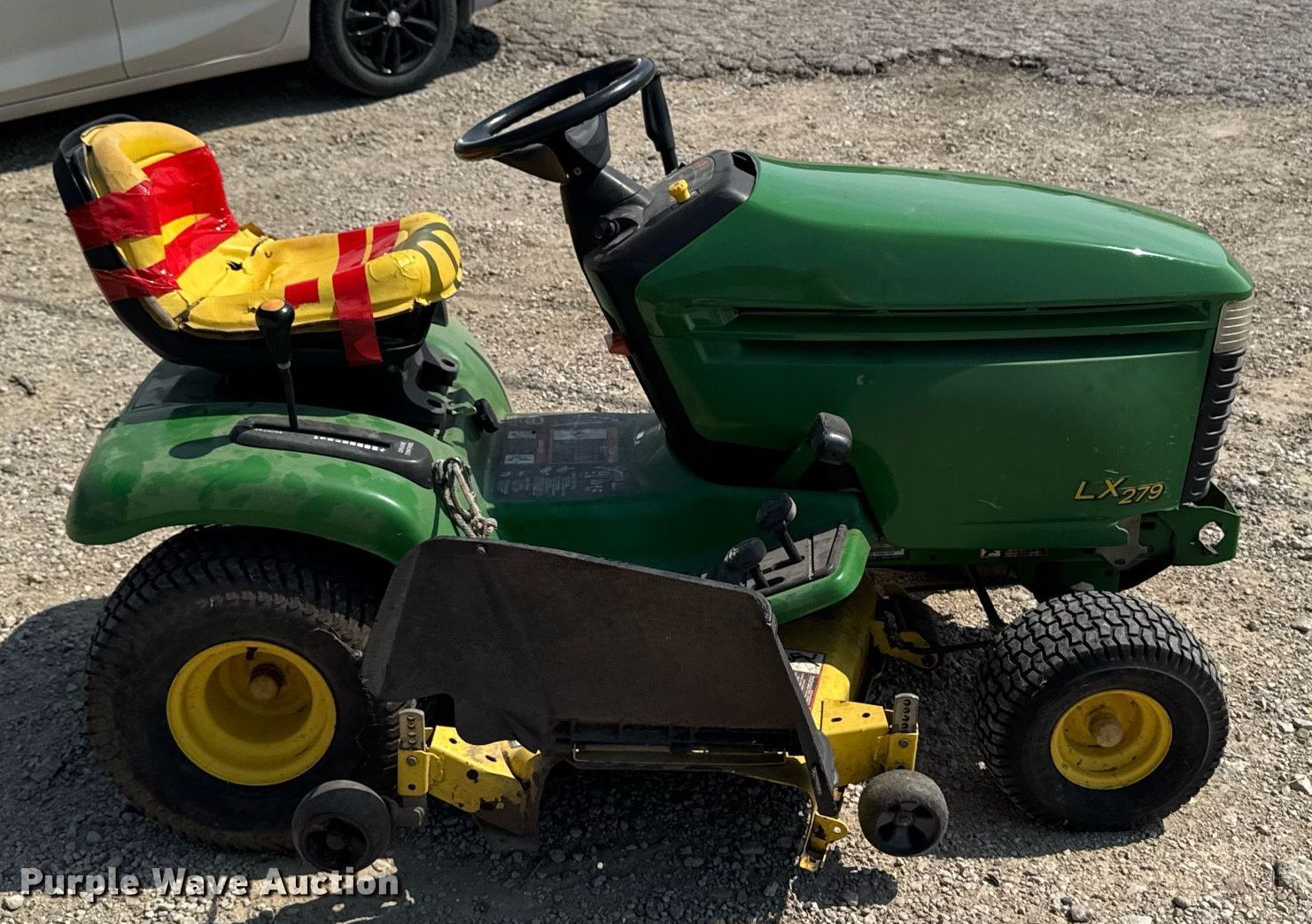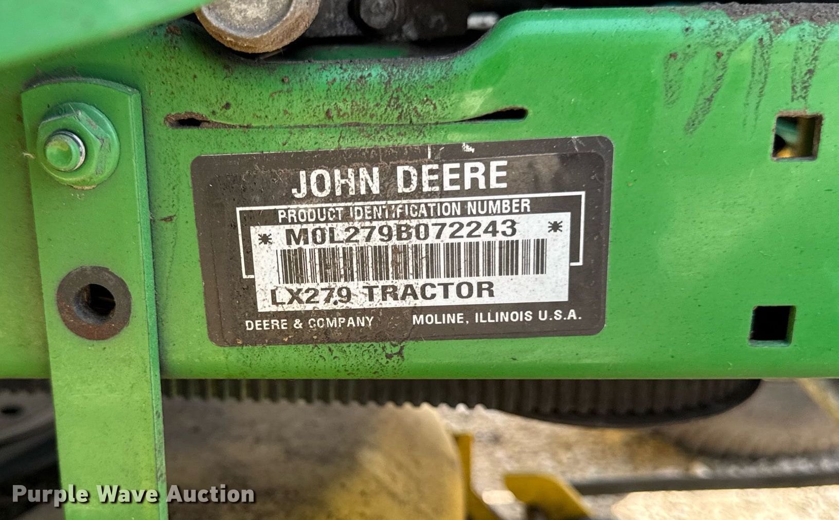 John Deere LX279 lawn mower. Hours: 553 on meter, Cutting width: 48", Serial: M0L279B072243. Engine Kawasaki, Displacement: 737 cc, Cylinders: 2, Fuel type: Gas, HP: 17. Transmission Hydrostatic. Features Rear drawbar. Tires Front: 15x6-6, Rear: 20x10-8. Cannon Sales & Service. Mount Ayr, IA 50854