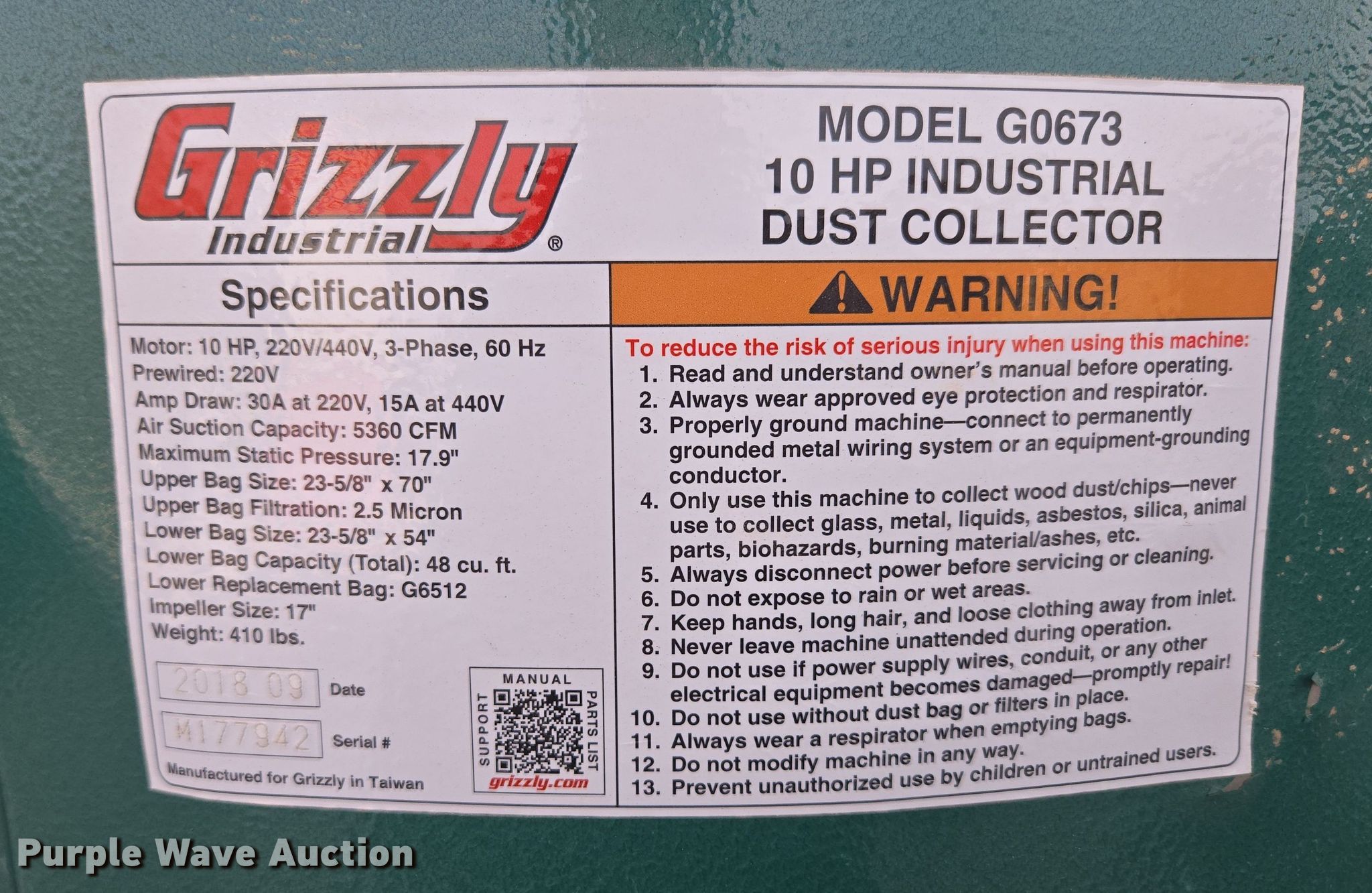 Purple Wave is selling a used Woodworking Equip. in Missouri. This item is a Grizzly G0673 dust collector with the following: Serial: M177942