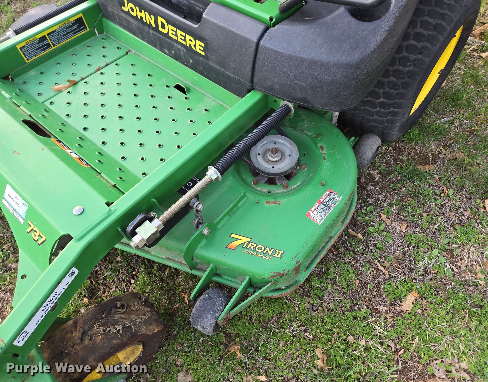 John Deere 737 ZTR lawn mower. Hours: 1,029 on meter, Cutting width: 54", Serial: TC0737A050897. Engine Cylinders: 2, Fuel type: Gas, HP: 23. Transmission Hydrostatic. Features Rear drawbar, Mower deck Width: 54", John Deere 7 Iron II Commercial. Tires Front: 13x5.00-6, Rear: 24x12.00-12 NHS. Notes Dead battery, Possible engine issues, will not start , Non-operational unit. Springfield Mow LLC. Willard, MO 65781
