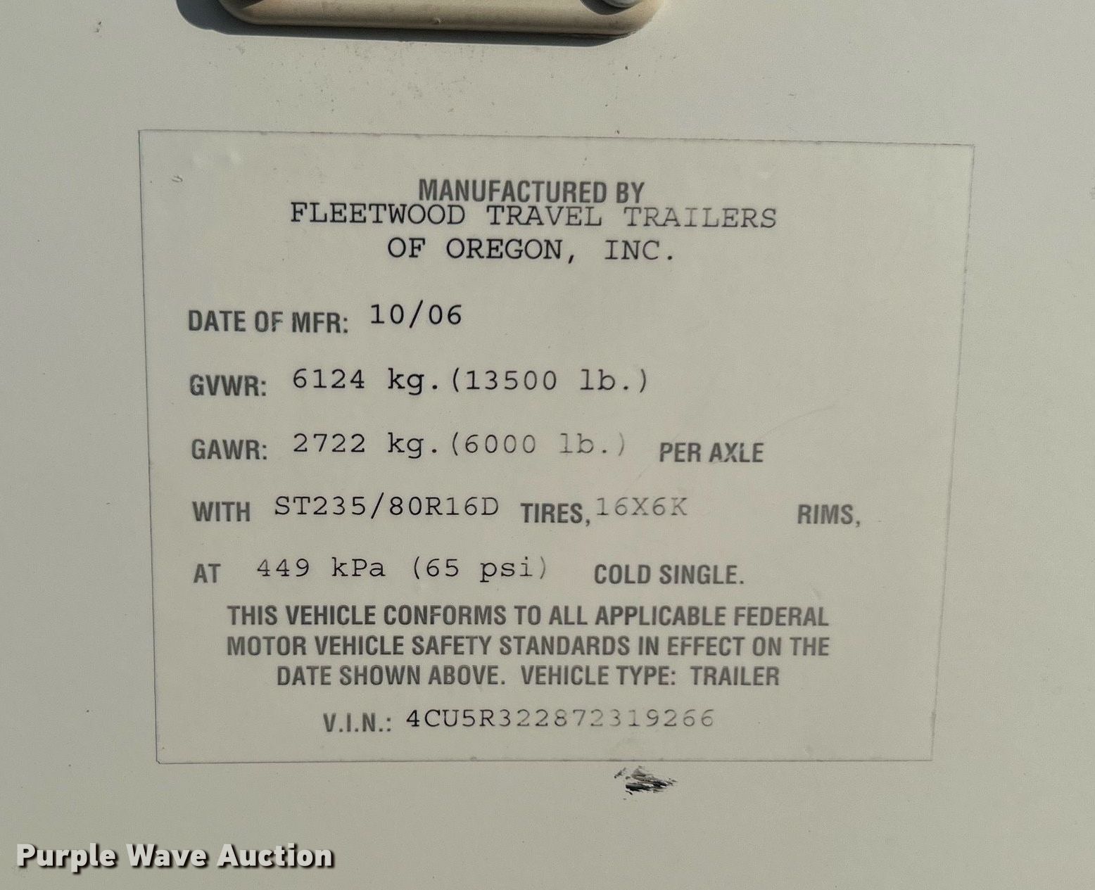 Purple Wave is selling a used RV or Camper in Oklahoma. This item is a 2007 Fleetwood Wilderness Advantage camper with the following: Camper length: 35', VIN: 4CU5R322872319266