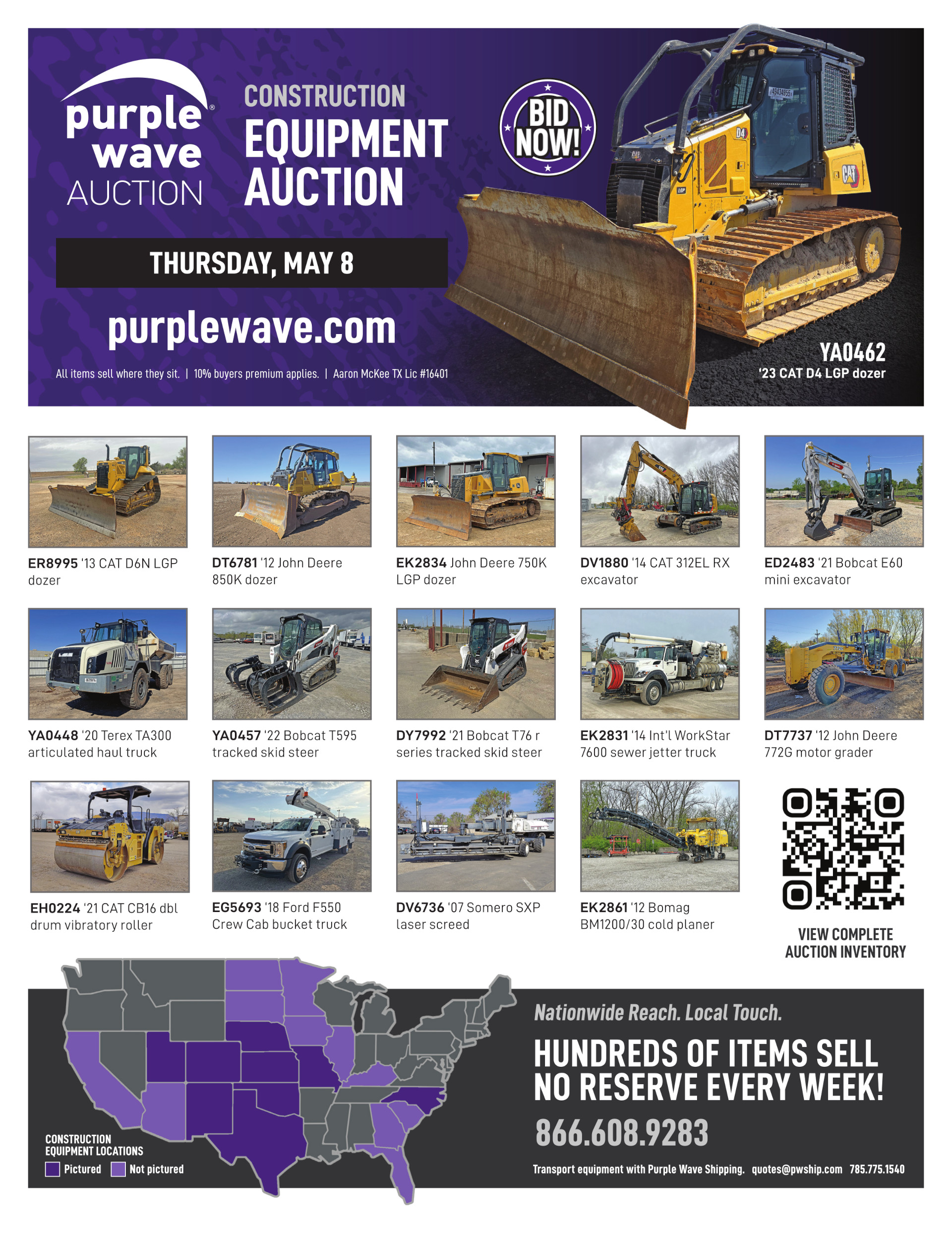 Purple Wave attempts to give its customers an industry leading experience by providing detailed equipment listings. Listings include written descriptions, photographs, location, and consignor information. Equipment descriptions are based on our direct observation and information provided by our selling customer. All information is intended to be as accurate as possible. However, we recommend customers inspect prior to bidding. Purple Wave listings are not intended to be substitutions for inspection. The details provided may differ on equipment based on information provided by the consignor. An error or omission in the listing will not change the results of the bid. It is the responsibility of the buyer to conduct any inspection and examination necessary to satisfy the buyer of all material facts before placing a bid. Purple Wave is not responsible for any statements about the item made by the Seller.