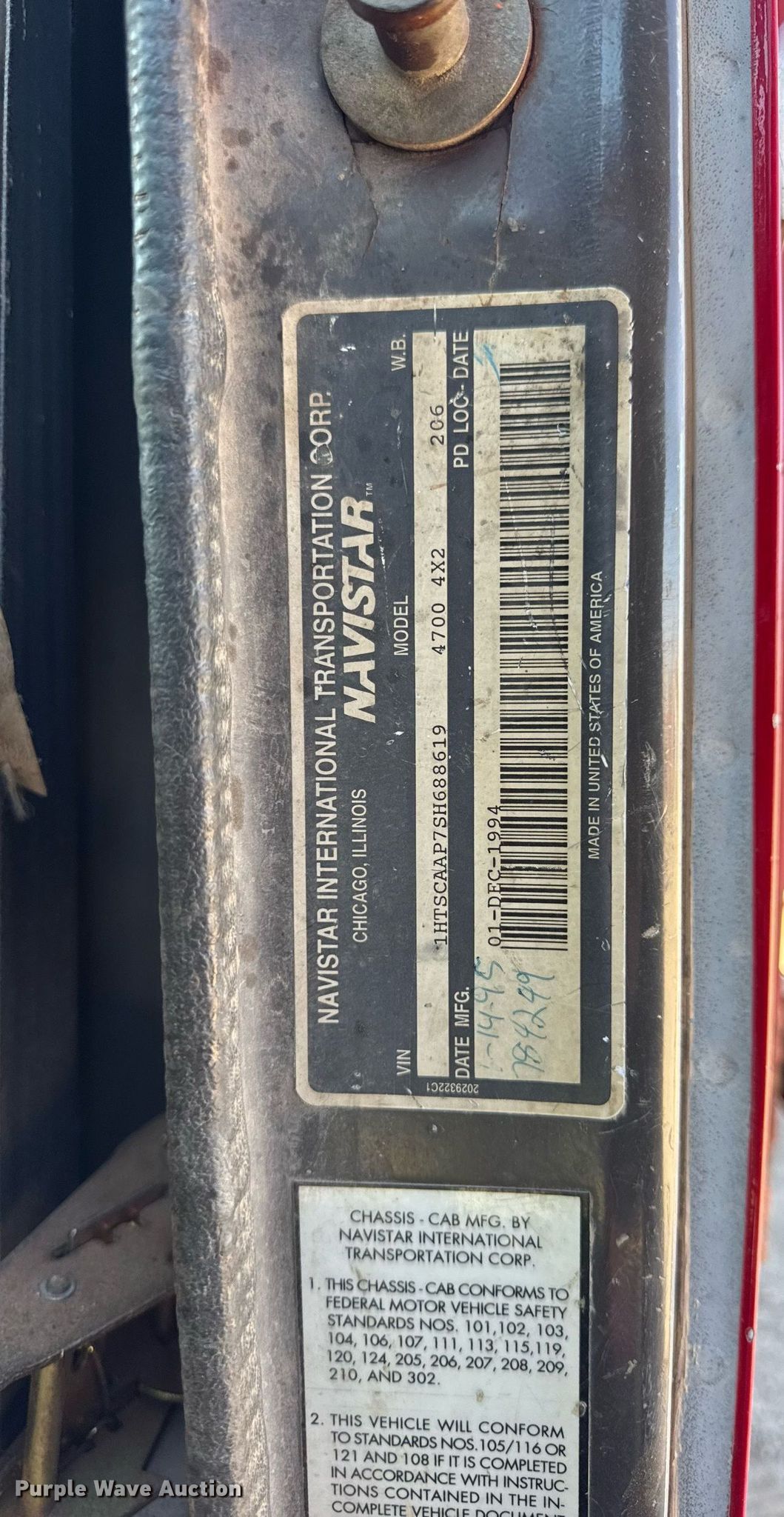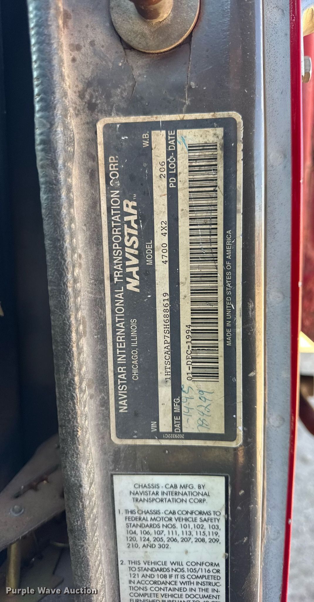 1995 International 4700 dump truck. Miles: 205,841 on odometer, VIN: 1HTSCAAP7SH688619. Engine DT466P, Cylinders: 6, Fuel type: Diesel. Transmission International 6 Plus, Manual, Speed: 7. Chassis Axles: Single, Suspension: Spring, Brakes: Hydraulic, PTO. Interior Heat, Brake controller. Features Dump bed Heil, 14' L x 95" W, Side height: 16", Side board height: 37", Bed type: Steel, Ram: Dual, End gate: Manual. Tires Size: 10R22.5. Illinois title. Title distribution may be delayed up to 14 days from verification of funds. MQ Construction. Elk Grove Village, IL 60007