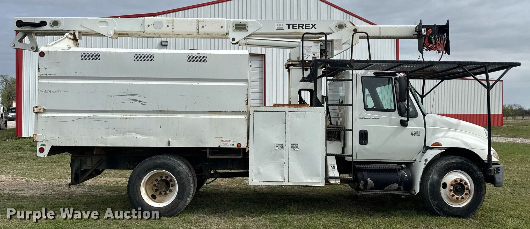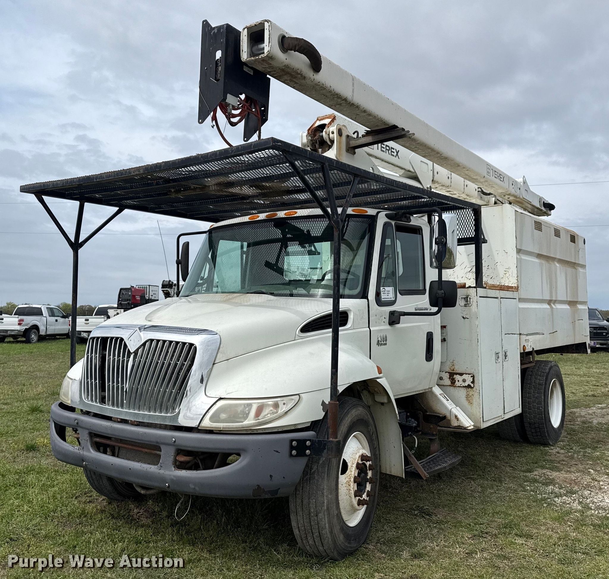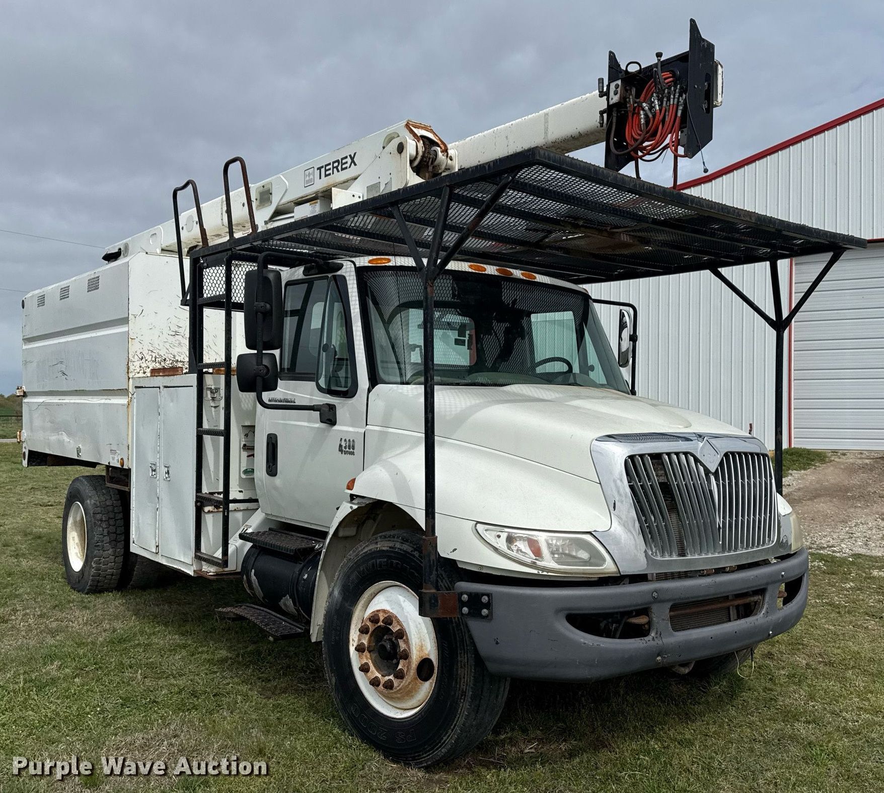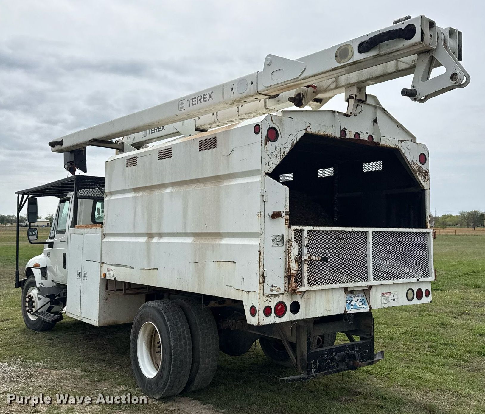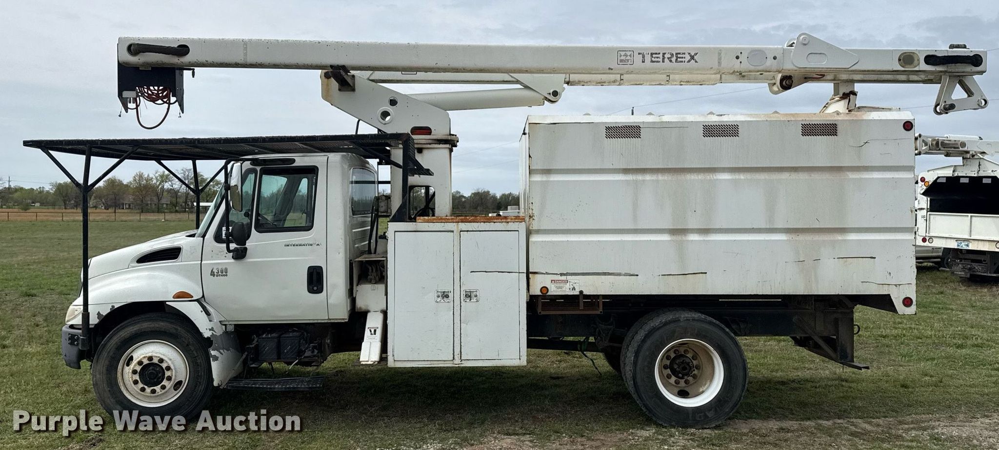 2008 International 4300 forestry bucket truck. Miles: Unknown, VIN: 1HTMMAAM58H562697. Engine International DT466, Displacement: 7.6L, Cylinders: 6, Fuel type: Diesel. Transmission Automatic. Chassis Axles: Single, Suspension: Spring, Brakes: Hydraulic, GVWR: 26,000 lbs. Interior AC, Heat, Cruise control, Brake controller. Features Chip bed 11' L x 96" W x 55" H, Boom Terex XT, Maximum lift capacity: 350 lbs, Maximum lift height: 55', Boom type: Articulating, Insulated, Boom controls Ground.. Tires Size: 11R22.5. Notes Contents included, Driveline removed, Seats missing, Dash disassembled, parts may be missing, Parts missing, Dead battery, Non-operational bucket, Non-operational unit Unit must be towed or hauled. Oklahoma title. Title distribution may be delayed up to 14 days from verification of funds. Riggs Tree Service. Okmulgee, OK 74447