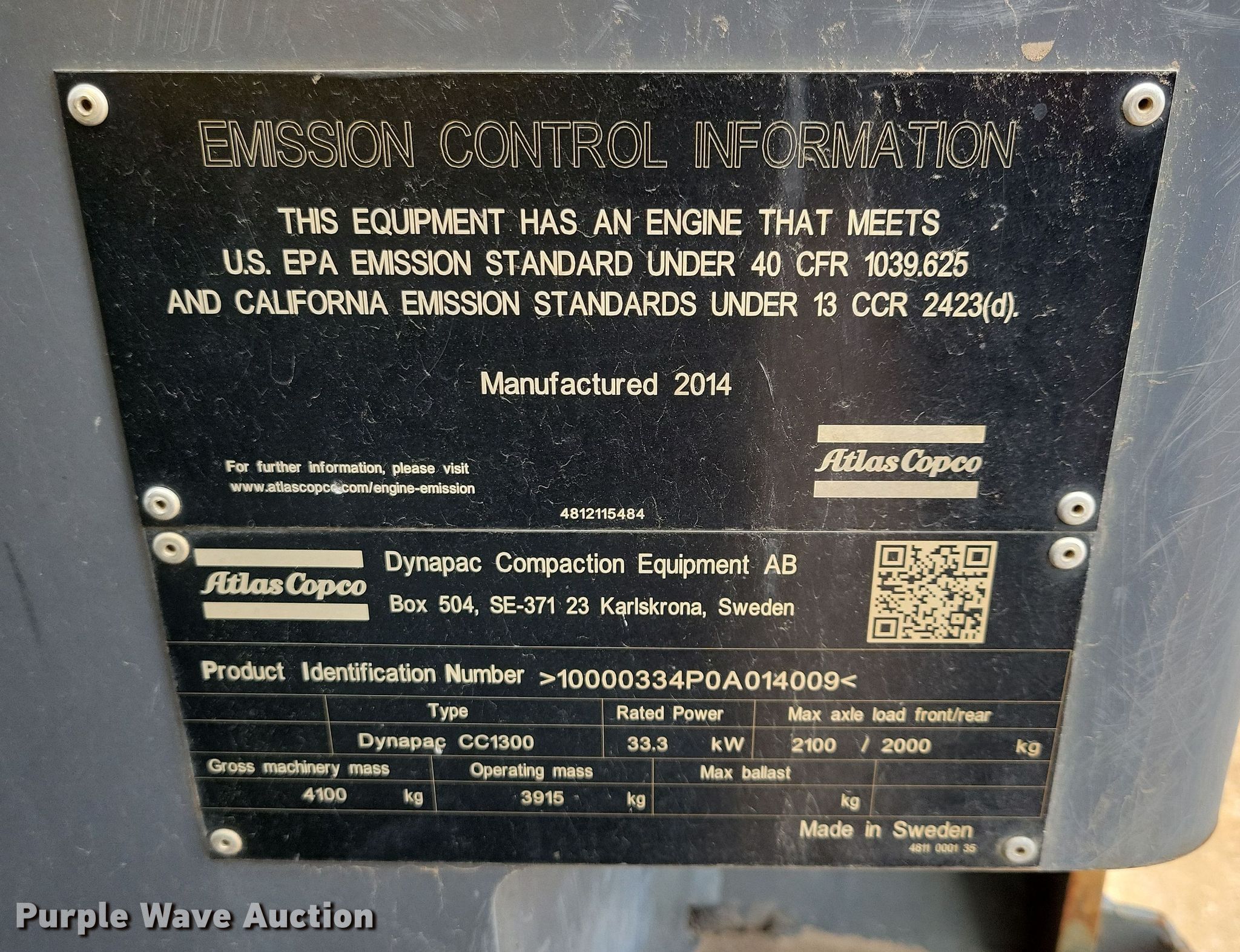 Purple Wave is selling a used Double Drum Roller Compactor in South Dakota. This item is a 2014 Atlas Copco Dynapac CC1300 double drum roller with the following: Hours: 4,118 on meter, Serial: 10000334P0A014009
